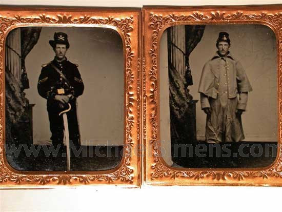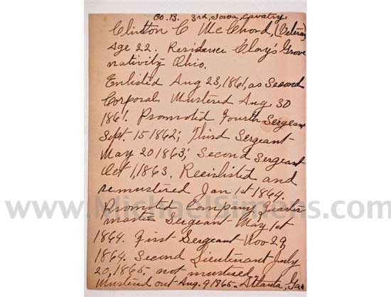 Found in an old chest in St. Paul, Minnesota years ago, these items were originally the property of Lt. Clinton McChord of Co. B, 3rd Iowa Cavalry. McChord enlisted on 8/30/61 and served until muster-out in August of 1865. The set includes a good condition Colt Pocket Revolver, Roby Cavalry Sabre, Cavalry Sword belt & hangers, a piece of his sabre knot, Telescope w/original case, 2 original tintypes of McChord in uniform, a CDV of our hero taken post-war with cardstock describing his service, some transcribed excerpts from original letters that were so tattered they went south long ago(unsalvageable), and Volumes I & II of Harper's Lithographs of the Great Rebellion saved by our trooper. All items are in very good to fine condition with the exception of the two volumes which I rate as fair. You don't see many groupings coming out these days, and I was very happy to aquire this one. I can't keep everything, but I was tempted on this one. The 3rd Iowa saw some violent action at Pea Ridge, LaGrange as well as many smaller skirmishes throughout the war. They had more losses than most Cavalry units in the West, losing 5 officers and 79 enlisted men killed or mortally wounded in action. For those of you that like ID'd material and would like a little of everything that a Cavalry officer may have attached himself to, this is one-stop shopping. A small collection in itself, and ID'd Iowa items are not easy to come by.