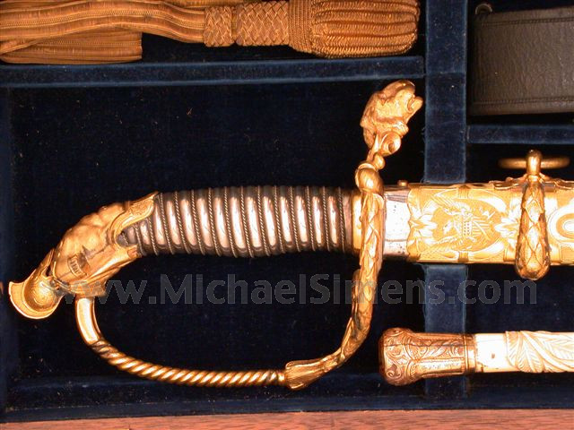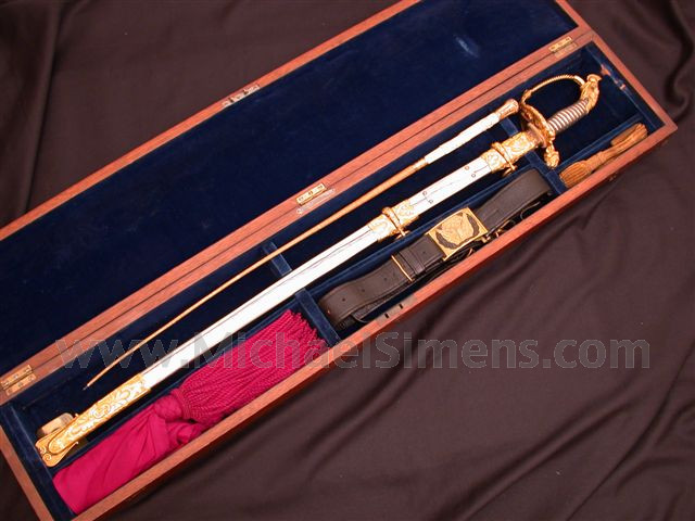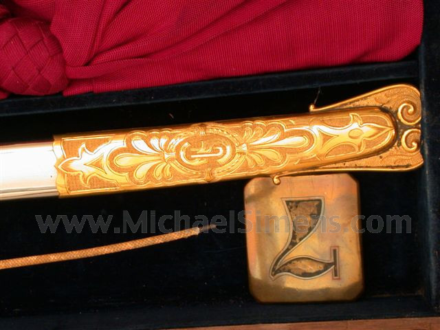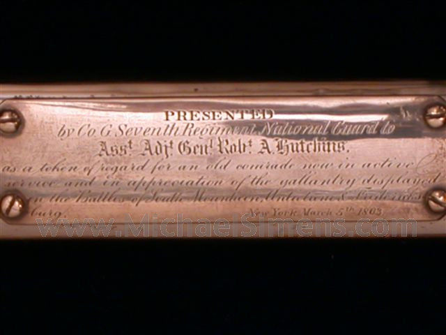 One of the finest condition Tiffany Swords known by either John Thilmann or myself, this sword was front and center in Dick Johnson's home for many years under a glass case. It is historically inscribed on a mounted silver plaque on the scabbard body as presented to Robert A. Hutchins for gallantry at South Mountain, Antietam and Fredericksburg. The entire sword is near mint with deluxe, gold-gilted hilt (with Roman Soldier Armor Motifs) mounts and drag. The grip and scabbard body are silver. The case contains Hutchins' sword sash and sword belt as well as a gold mounted riding crop, also with inscribed presentation to Hutchins, a gold-bullion sword knot and brass belt plate with the numeral "7", depicting the New York National Guard Unit that presented him with this spectacular sword. I can't say enough about how impressive this sword is in person. Hutchins had great history and there is a large volume of material about him that accompanies the cased sword. Everything about this set is nearly new condition. This is undoubtedly one of the finest Museum Quality Tiffany Swords to come on the market in years. THIS SWORD IS FROM THE RICHARD JOHNSON COLLECTION WHICH HAS ITS OWN SECTION ON THIS WEBSITE. TO SEE THE ENTIRE COLLECTION, RETURN TO THE HOME PAGE AND CLICK ON THE GREEN, "RICHARD JOHNSON" ICON.