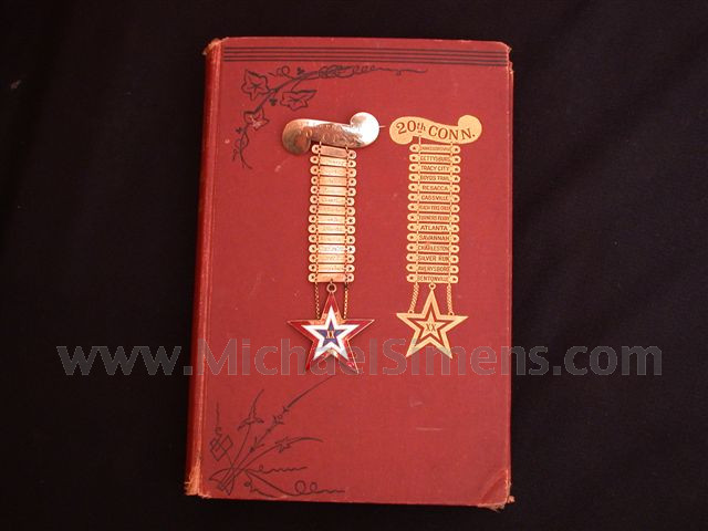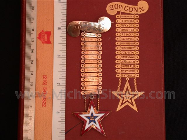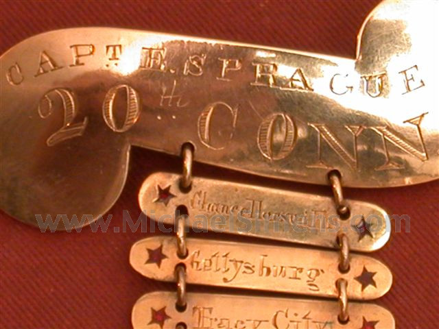 Corps Badge of the 20th Connecticut Infantry made of solid gold. This beautiful Civil War Ladder Badge is inscribed with the owners name, ID'd to Capt. Ezra Sprague, 20th Connecticut Infantry. The 20th served with distinction at Chancellorsville, Gettysburg, Resaca, Peach Tree Creek, The Atlanta campaign and Bentonville. It is interesting to note that a facsimile of this exact medal (without Sprague's name) is embossed onto the cover of the 20th's original Regimental History and also that Sprague himself, was a jeweler prior to and after the war. Was he the designer? Further research is certainly warranted and I would like to speak with other collectors that may have similar world-class Civil War Corp Badges and Medals.