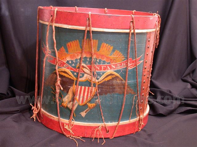 BY ROGERS OF NEW YORK, this is one of the best original Civil War drums that I have had. The paint is 100% original and in 98% condition to include the rims. The heads are near perfect and the ropes are original and starting to fray. The front panel shows a beautiful and brightly painted Union Eagle with "U.S. Infantry" cartouche on the ribbon. The interior label is about perfect. This is the best drum I've seen out there this year. They're getting hard to find and are recognized as perhaps the quaintest and most popular of all Civil War display pieces.