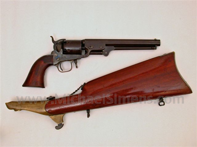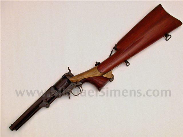 This is a great gun out of my personal collection. I bought it over 10 years ago at the Pottstown, Pa. show and paid handsomely for it. This gun is untouched and in rich brown patina blending with generous amounts of blue and case-colors in protected areas. The frame shows some bright colors on each side where the stock protected it. The canteen stock is in equally fine condition and matching. The set is attic mint, sharp and crisp to include all action, edges and markings. You may stumble across a British proofed gun every year or two with a stock, but they are generally a bit tougher to sell to American collectors than a Hartford gun that stayed home. This one is sharp, rare, available and red, white and blue all the way through.