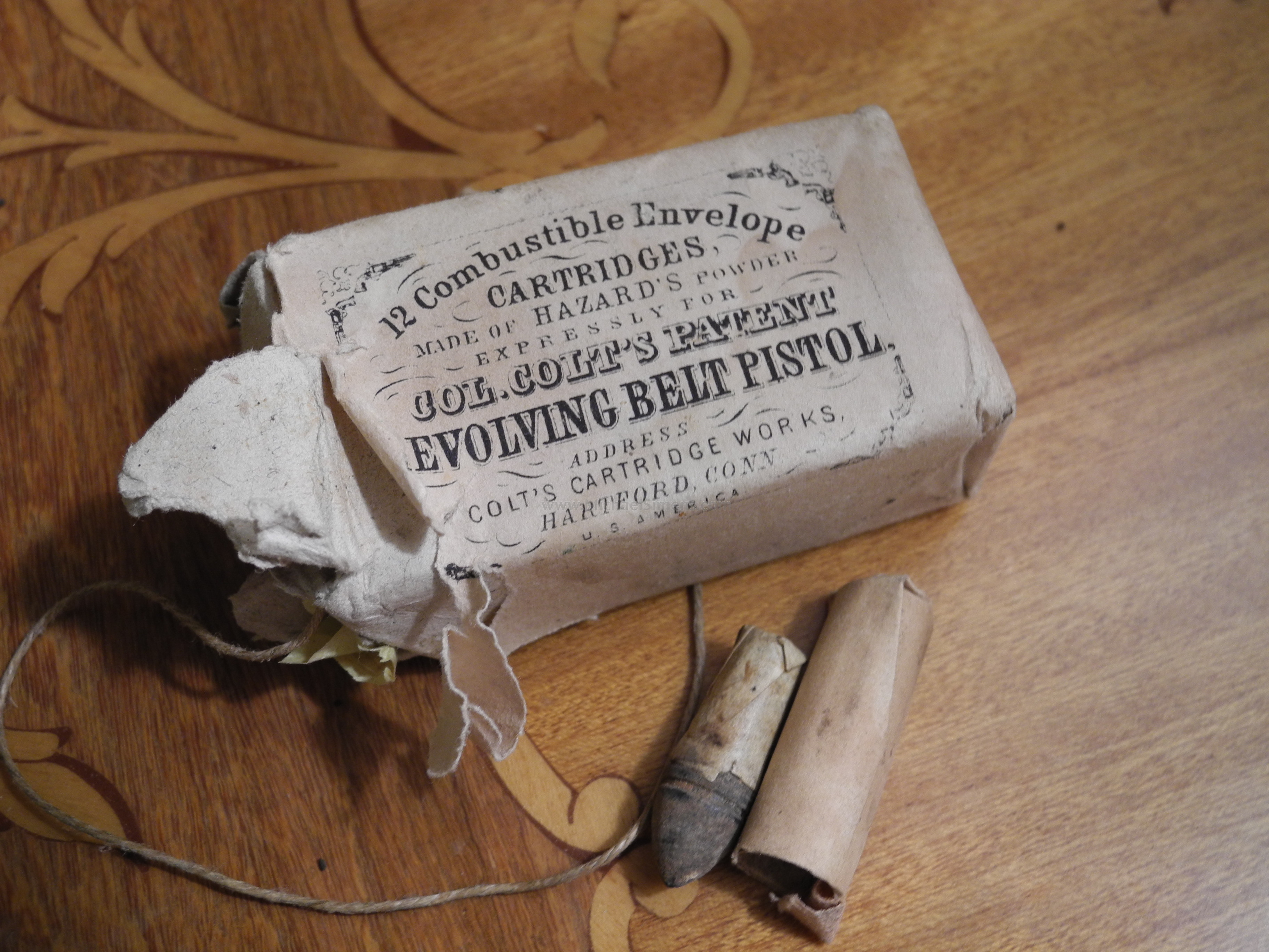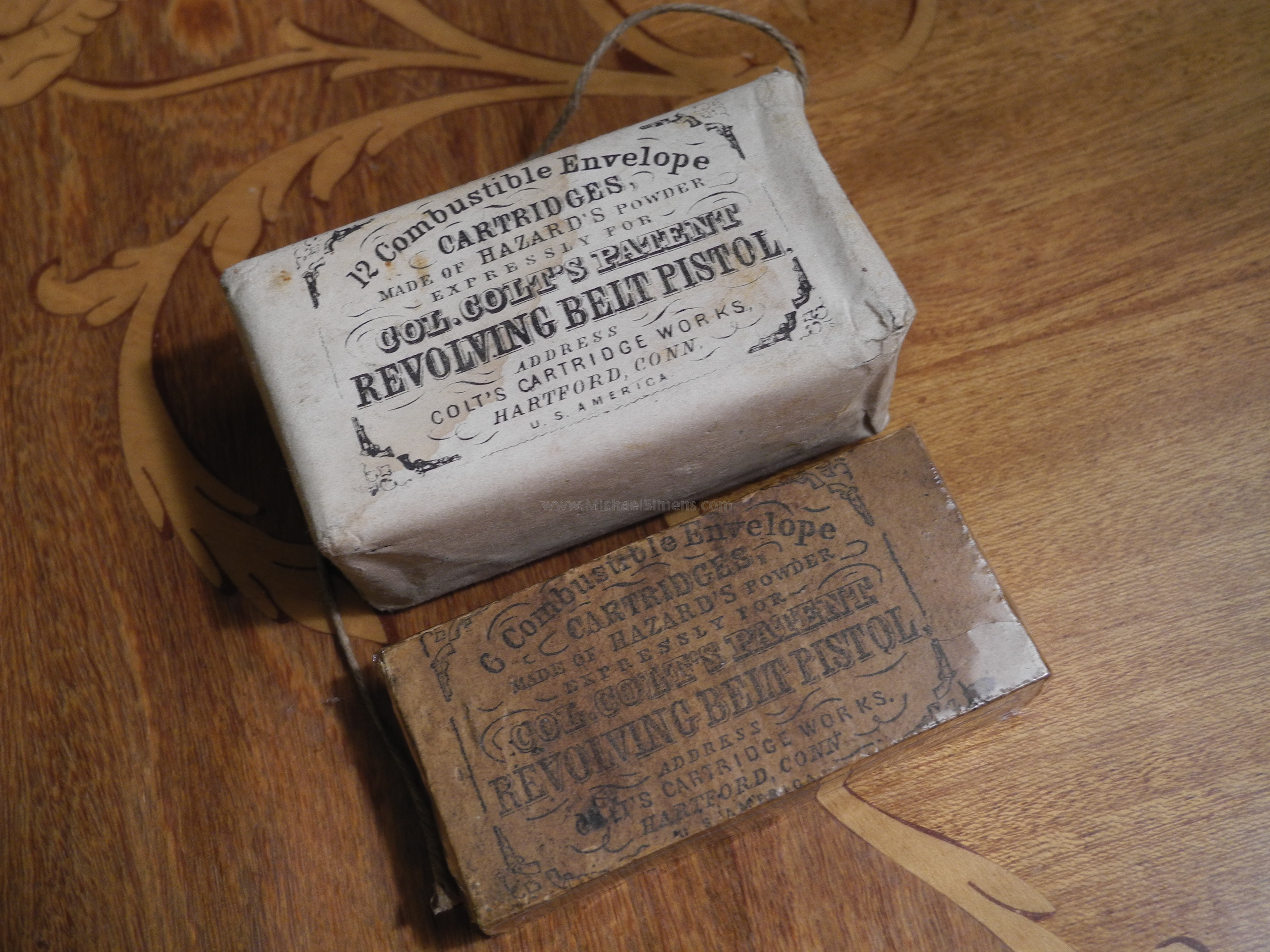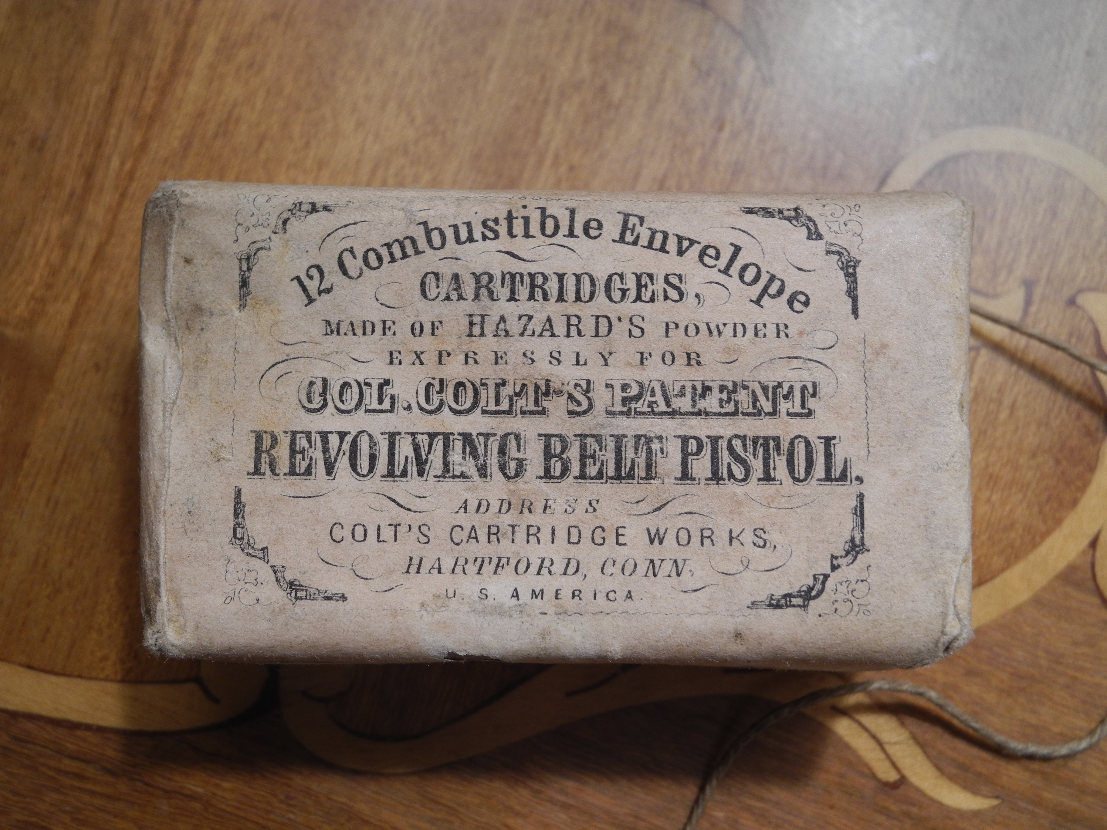 These are of the rarest of all Colt Accessories. I have 3 of these spectacular 12-count skin packs marked from the Colt Cartridge Works and made of Hazards Powder. Two are unopened and one is opened with 6 cartridges remaining. The unopened packs are near mint condition. Rarest of the rare.