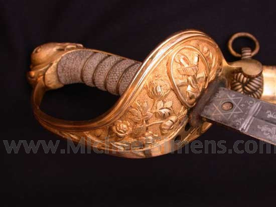 Simply spectacular condition, one of the best known examples of this type and certainly in the top 5% in terms of condition for ANY Confederate Sword, this beautifull dolphin-head is considered by many to be the most aesthetically pleasing of any Naval Sword ever created. The combination of WHITE sharkskin grip, large naval motif guard and distinctive dolphin-head pommel are striking, as are the coiled-snake mounts and drag. These wonderfull weapons, totally unique to the Confederate Navy were the result of efforts by George Tennant from the firm of Courtney & Tennant (Importers and Naval Outfitters) who went to England and contracted with Robert Mole and Sons of Birmingham, England to manufacture the famed and blockade-run Dolphins. The guard on this example retains virtually 98 - 99% of its original gold gilt on the pommel and prox. 70% on the scabbard mounts. The leather scabbard (which often is not even present!) is in very fine to excellent condition for this model, with some flaking to the finish. The blade shows all of its original etch and frosting with only the most minor specs of corrosion scattered about its face. The ricasso is boldly stamped with the C & T address and the etching is deep and clear with a wonderful Confederate 1st National Flag proudly etched among florals and Naval Motifs. Examples of the famed Dolphin Head are in the Smithsonian Institution and The Confederate Museum in Richmond. This particular example is one of the finest specimens ever offered for sale, and worthy of the finest museum or private collection. Have a question about your Confederate artifact? Click on our blue icon at the top of the page and contact us !