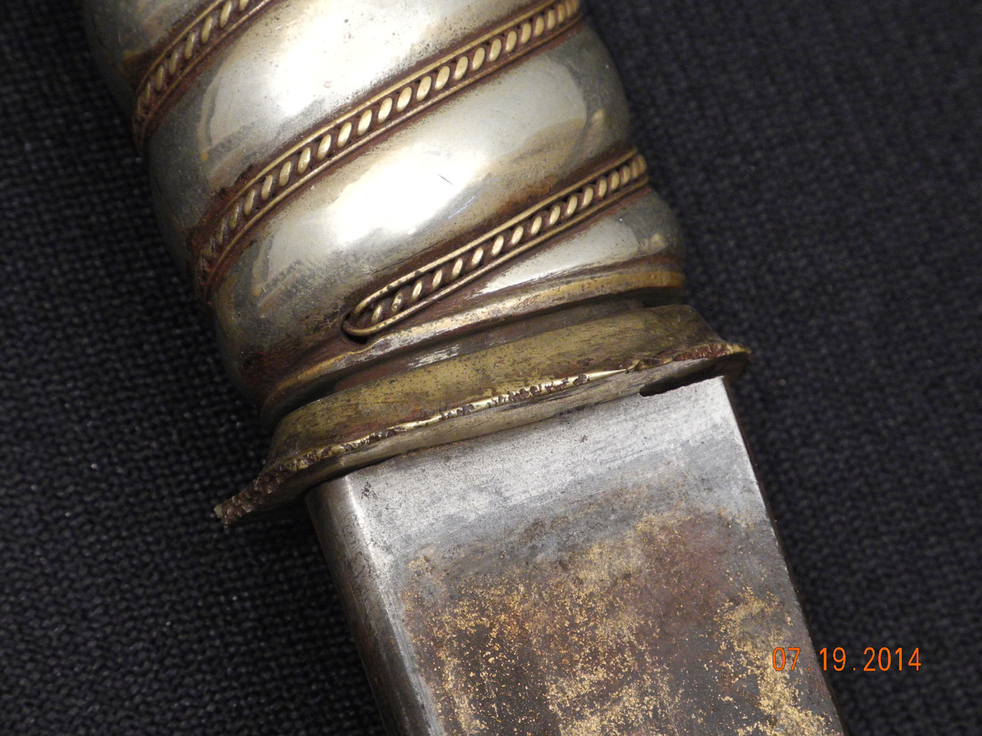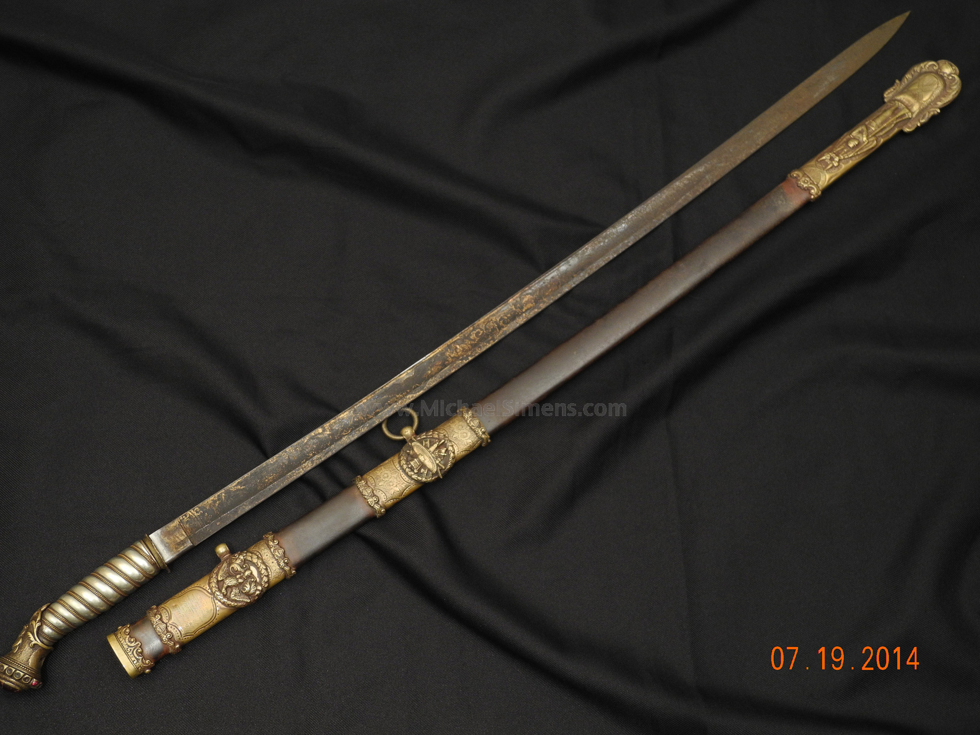 This sword is an imported, high-grade Staff & Field Officers Presentation Sword by Clauburg. It is in relic condition, obviously having been heavily field-altered and then exposed to the elements for a long period. In it's day, it was a beautifully gold-gilded, high-grade presentation sword with ruby or garnet stones decorating the pommel and an eagle-head quillon with ruby eyes. It is inscribed on its top mount, "Presented to Lt. Col. Geo. W. Grummond by the Staff & Line Officers of the 14th Mich. Vol. Infty, as a token of their esteem, Brentwood, Tenn. May 25th 1863".
