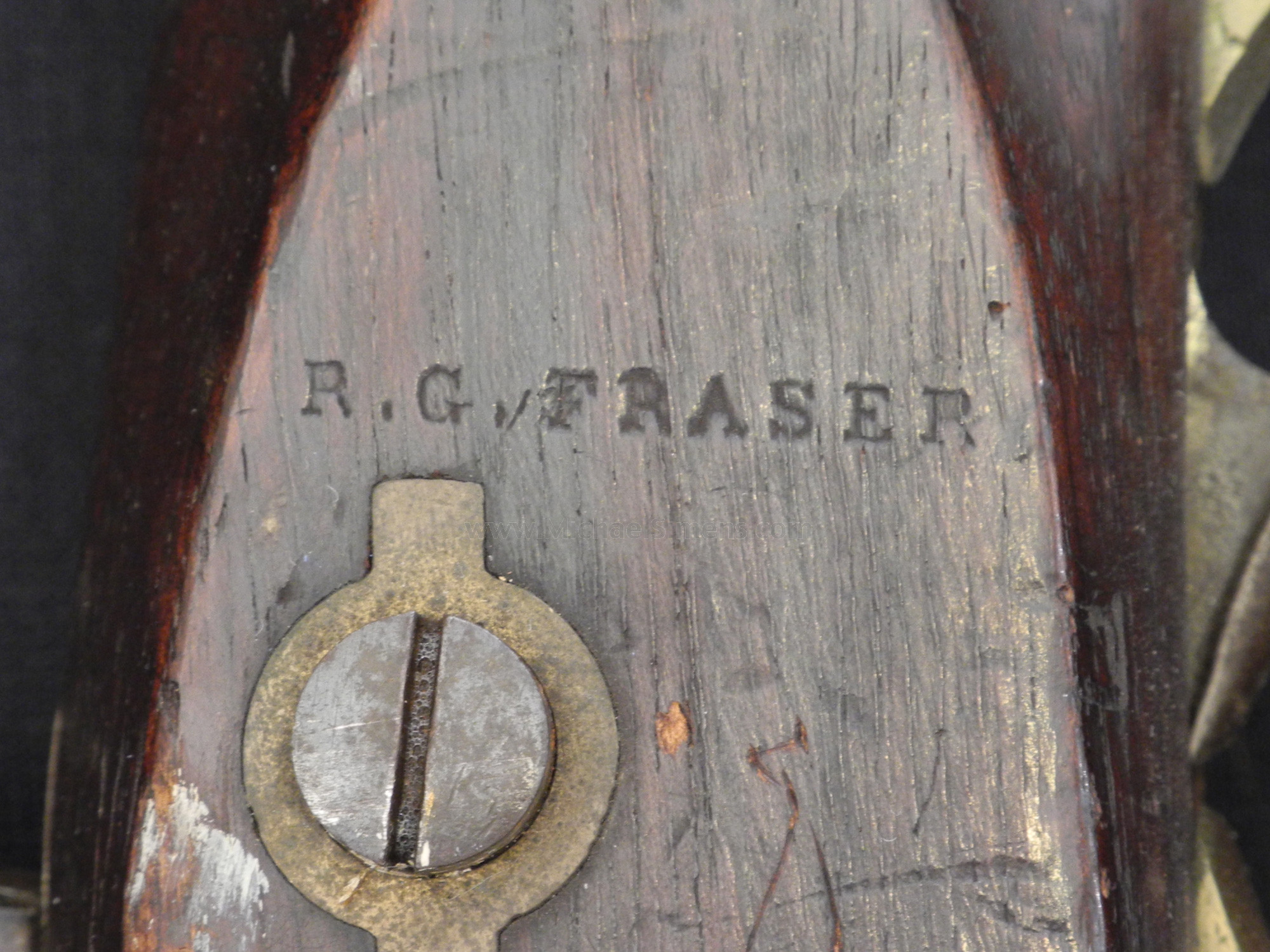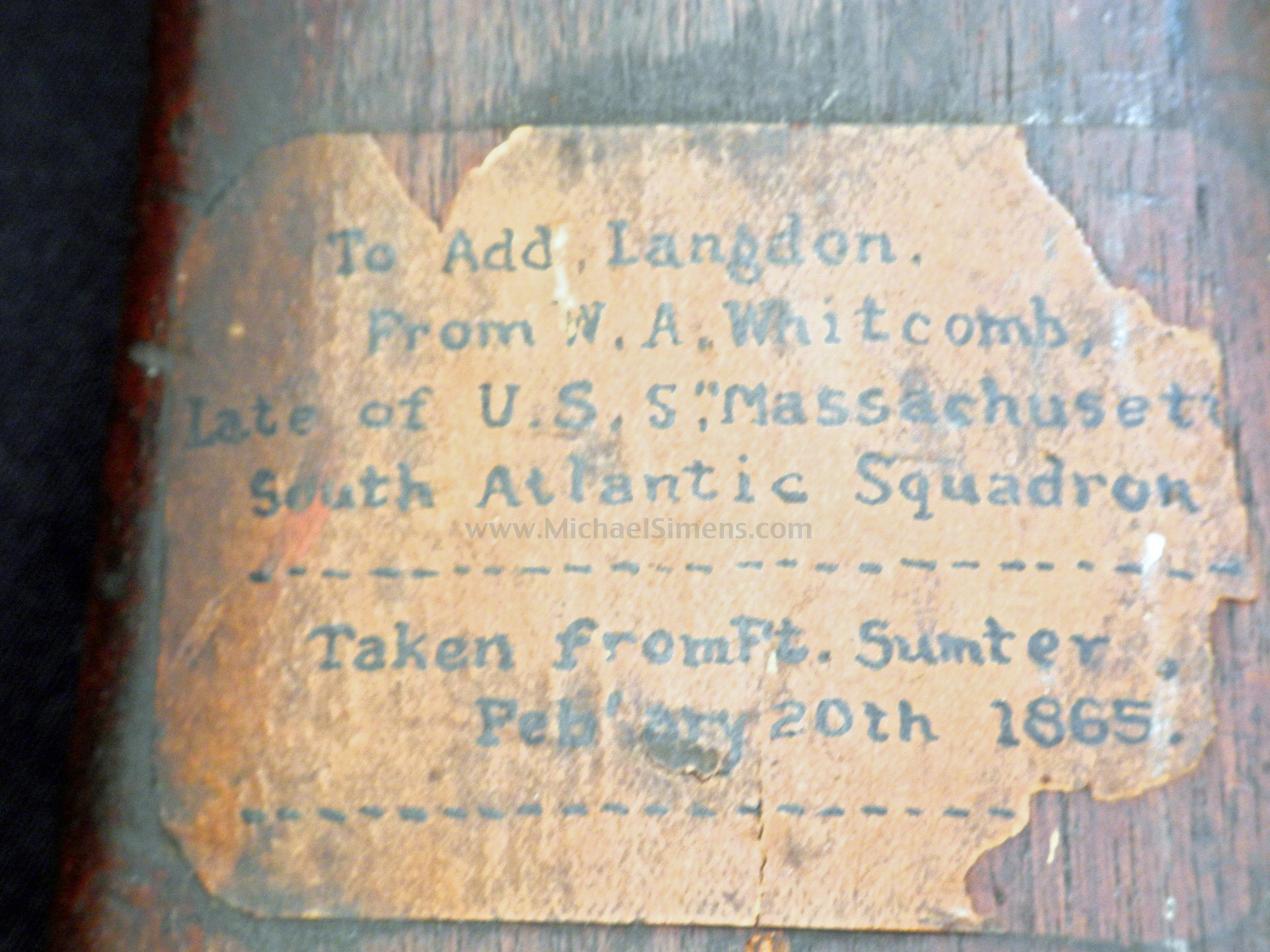 This beautiful condition Enfield Rifle has a lock marked "Barnett - London". The stock is marked "R. G. Fraser" opposite the lock which is probably a stock makers mark. It shows an "SC" surcharge stamping (for South Carolina) on the right butt-stock and has an original capture tag glued in front of that stamp that reads, "Add Langdon, From W. A. Whitcomb, Late of the U. S. S. "Massachusetts", South Atlantic Squadron, Taken from Ft. Sumter, February 20, 1865". This tag is period and 100% authentic. I have found Whitcomb in the records but have not had a chance to perform additional research at the time of this writing other than finding that the U. S. S. Massachusetts was indeed at the capture of Fort Sumter and was serving in the South Atlantic Squadron during that period. One of the most historic Confederate finds we have ever offered.