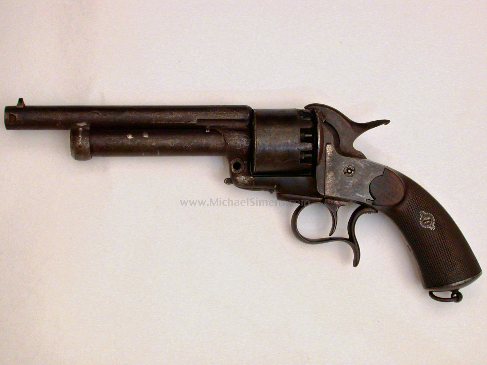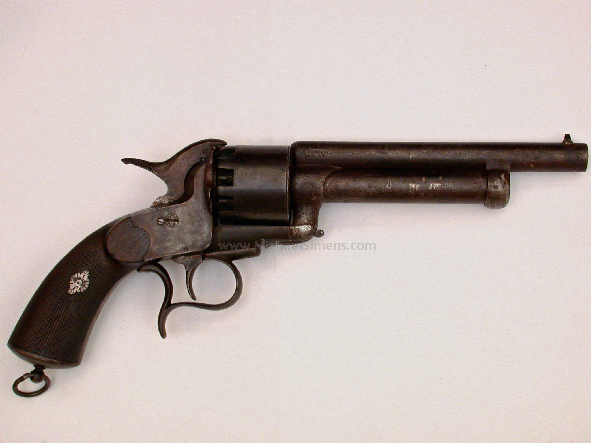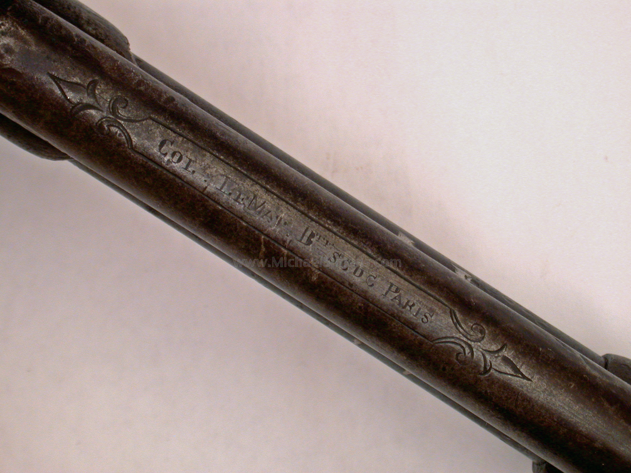 LeMat Revolver with London address, this revolver was probably purchased privately and retains 95% bright original blue on its cylinder and barrel, and 75% plumbing blue on its balance. The checkered grips are near mint. One of the finest condition LeMat Revolvers ever offered for sale. We took this gun in trade and are able to offer it at a more than reasonable price, it is down right cheap. Have a question about your artifact? Click on our blue icon at the top of the page and contact us !