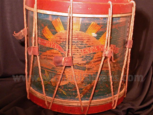 This is an ORIGINAL CIVIL WAR DRUM, IDENTIFIED TO THE 10TH MASSACHUSETTS INFANTRY WITH BATTLE HONORS INSCRIBED ON THE UPPER HEAD. An outstanding, historical artifact and especially rare for a drum. There are 2 types of Civil War Eagle Drums that I really take a liking to, excellent and/or identified. You'll find the best condition drum I've ever seen for sale later in this section. This one however, is of the identified type. This drum is in generally very good condition with an uncut body and original ropes, skins (bottom skin with a tear) and leather tugs (1 missing). It has a nice John Pollard label glued to the ID. The Federal Eagle painting is clear and weathered but retains the original painted riband bearing "10th Reg. Infantry". This is a drum that was there! A brass regimental insignia "10" is affixed to the body in the diamond tack design. The upper painted rim has "10th Massachusetts" scratched into it which is probably the remnant of a fountain pen inscription. The best part of the drum is a series of original period ink inscriptions that encircle the top head-rim with battle honors to include Fair Oaks, Antietam, Fredericksburg, Chancellorsville, Gettysburg and Wilderness among others, all in period ink, original to the period and extremely faded. The drum as a whole is very presentable and rare. The 10th Mass. had a fantastic history to include the following service; Duty at Kalorama Heights and Camp Brightwood, Defenses of Washington, D.C., until March, 1862. Siege of Yorktown April 5-May 4. Battle of Fair Oaks, Seven Pines, May 31-June 1. Seven days before Richmond June 25-July 1. Oak Grove, near Seven Pines, June 25. White Oak Swamp June 30. Malvern Hill July 1. At Harrison's Landing until August 16. Battle of Antietam September 18. Battle of Fredericksburg, Va., December 12-15. "Mud March" January 20-24, 1863. Chancellorsville Campaign April 27-May 6. Operations at Franklin's Crossing April 29-May 2. Maryes Heights, Fredericksburg, May 3. Salem Heights May 3-4. Banks' Ford May 4. Franklin's Crossing June 6-7. Battle of Gettysburg, Pa., July 2-4. Bristoe Campaign October 9-22. Rappahannock Station November 7. Mine Run Campaign November 26-December 2. At Brandy Station until May 1, 1864. Rapidan Campaign May-June. Battles of the Wilderness May 5-7. Spottsylvania May 8-12. Spottsylvania C. H. May 12-21. Assault on the Salient at Spottsylvania C. H. May 12. North Anna River May 23-26. Line of the Pamunkey June 26-28. Totopotomoy May 28-31. Cold Harbor June 1-12. Before Petersburg June 17-19. Ordered home for muster out June 19. Mustered out July 6, 1864. The 10th lost during service 10 Officers and 124 Enlisted men killed and mortally wounded and 1 Officer and 55 Enlisted men by disease. For years I've had customers calling in for identified drums and have only had two previously. For history, this is the best I've had. This won't last long guys.