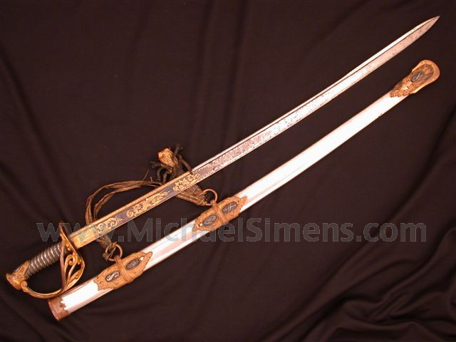 This sword is an old friend that has "come home to roost". It's unique combination of features including silver-plated pewter grip, silver-foiled scabbard, fire-blued and gold washed blade, etch presentation and history make it one of the rarest and most desirable of swords and possibly the rarest configuration of Sauerbier known to exist, even topping the famed Kilpatrick Cavalry Sabre of similar (but not as pretty) design. I have found the Sauerbier to be the most interesting of American made Civil War swords as it seems each and every sword is slightly different from the next. I'm putting this beauty in my little pile of collectables but would love to hear of any others that might be similar or considered unusual. If you have or know of one, give me a call.