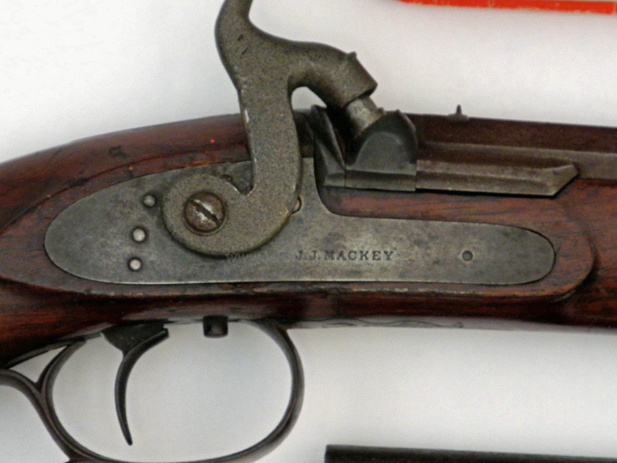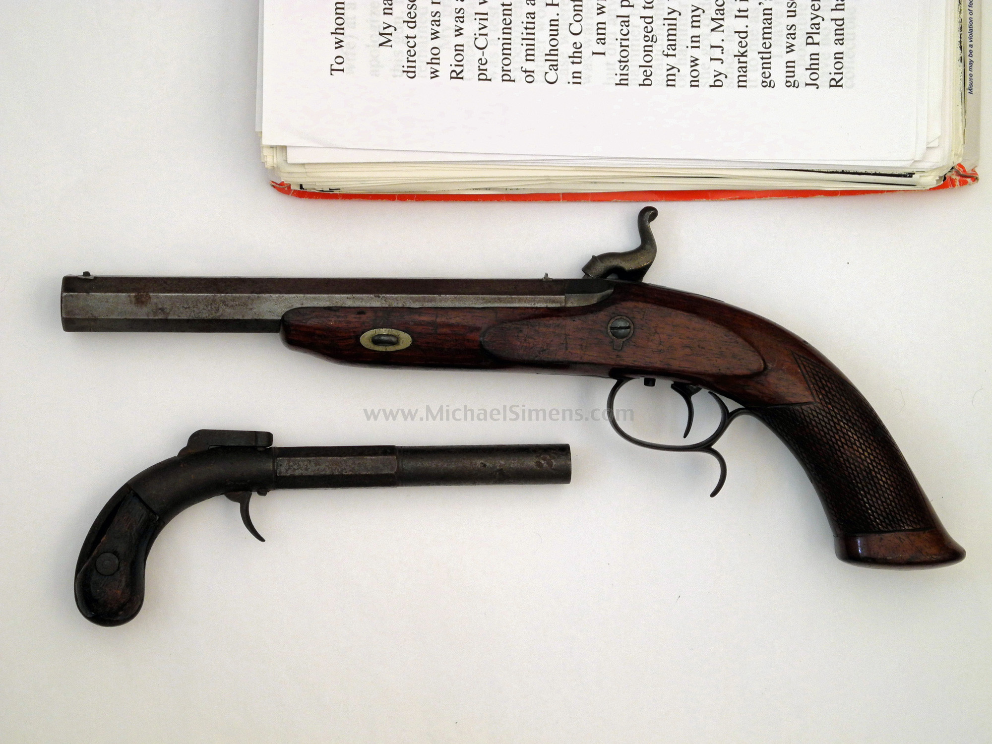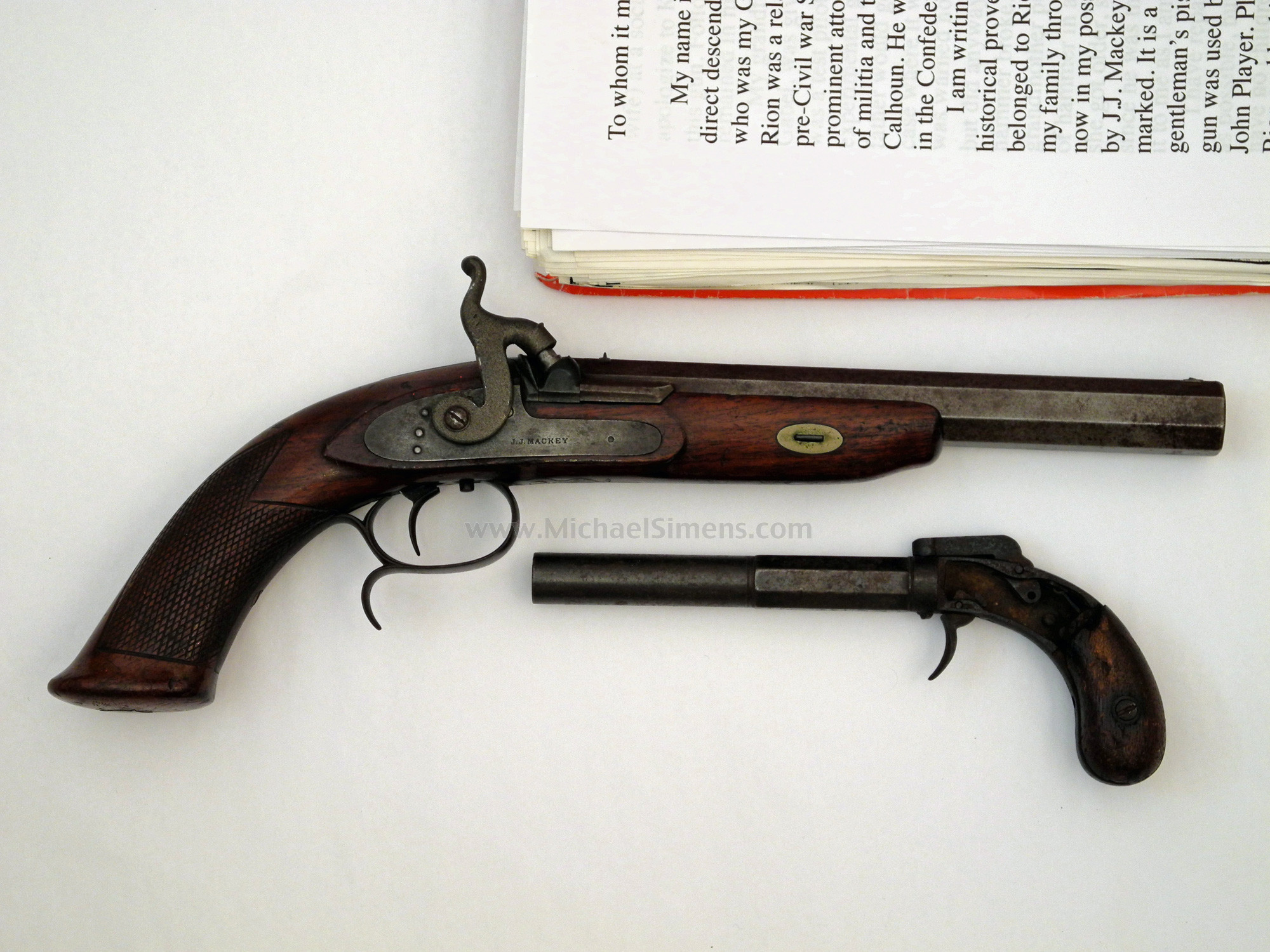 We have two guns pictured here, the most important of which is a single-shot percussion pistol (the larger of the two pistols in the photos) made by J. J. Mackey of Columbia, South Carolina. This gun was the property of Colonel James Henry Rion, the "adopted son" of John C. Calhoun. According to family descendants from whom these pistols came, Rion shot and killed a man named John Player with this very pistol. Rion eventually served in the Confederacy and rose to the rank of Colonel. There are a few good links on the net about Rion, his career and his relationship to Calhoun. Both guns were handed down in the Rion family and are accompanied with a very large biography of Rion written by one descendant and a notarized letter from the legal owner, another descendant. The gun is sharp and crisp with no problem other than a repair to the hammer spur which is described in the letter of provenance from the family. The second pistol is a bar-hammer single-shot pistol of unknown manufacture with a broken grip. These item are priced only as to the value of the guns as collectibles and are well worth the price of admission, regardless of a very interesting history of an accomplished figure in South Carolina history.