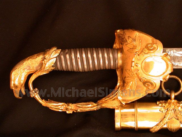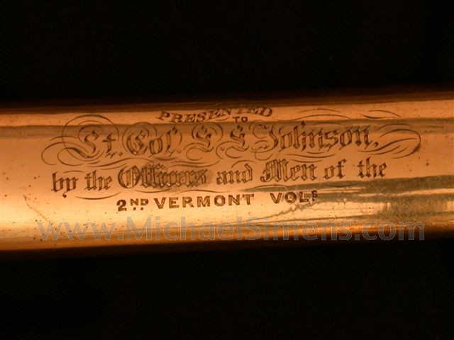 This is unquestionably, one of the finest swords we have ever offered and only the second or third of this Tiffany pattern ever discovered. I have seen only one other and that was cased with accessories that sold at auction a few years ago for nearly $150,000.00. The condition of this example is far superior, as it retains 99% original gold gilt to the hilt and scabbard. The blade shows some light spotting and staining but is very fine condition-wise. Enoch Johnson and the 4th Vermont (who prented him this sword) had a spectacular history serving in virtually every major battle in the Army of the Potomac. The 2nd Regiment was organized at Burlington and there mustered into the U. S. service on June 20, 1861. It was attached to Howard's brigade, Heintzelman's Division, with which it fought at Bull Run on July 21. It was next sent to Chain bridge for guard duty along the Potomac, and assisted in the construction of Forts Marcy and Ethan Allen. In September it was formed with the 4th and 5th Vermont regiments into the Vermont Brigade, the 2nd brigade of Smith's division. It was ordered to Newport News and participated in the Peninsular campaign. It was in action at Young's Mills, Lee's Mills and Williamsburg. In the organization of the 6th Corps, the Vermont Brigade, to which had been added the 6th Vt., became the 2nd brigade, 2nd division. On June 26 it shared in the battle of Golding's farm and in the Seven Days' battles it was repeatedly engaged. It was ordered to Alexandria and to Bull Run late in August. The corps was not ordered into the battle and was next in action at Crampton's Gap and Antietam in September. It fought at Fredericksburg Dec. 13, 1862, after which winter quarters were established near Falmouth and broken for the Chancellorsville battles in May, where the 6th Corps made a gallant charge upon the heights. It fought at Gettysburg, and from Aug. 14 to Sep. 13, 1863, the brigade was stationed in New York to guard against rioting and then rejoined the corps. Winter quarters were occupied with the Army of the Potomac near the Rapidan and a large number of members of the regiment reenlisted. The command continued in the field as a veteran organization and broke camp May 4, 1864, for the Wilderness campaign. On the opening day of the fight at the Wilderness, Col. Stone was killed and Lt. Col. Tyler fatally wounded, our man Johnson taking command. A number of the bravest officers and men perished in the month following, during which the Vermont Brigade fought valiantly day after day with wonderful endurance, at the famous "bloody angle" at Spotsylvania, at Cold Harbor (Johnson being cited for gallantry) and in the early assaults on Petersburg. On July 10 it formed a part of the force ordered to hasten to Washington to defend the city against Gen. Early, and shared in the campaign in the Shenandoah Valley which followed - the fatiguing marches and counter-marches and then the battles of Charlestown, Fisher's Hill, Winchester and Cedar Creek, where Johnson was again sighted for gallantry while leading his regiment. During the last named battle the brigade held its ground when it seemed no longer tenable and only withdrew when it was left alone. Returning with the 6th Corps to Petersburg in December, it participated in the charge on March 25, 1865, and the final assault April 2, after which it joined in the pursuit of Lee's army and was active at the battle of Sailor's Creek, April 6, where it is said to have fired the last shot of the 6th Corps. The service of the 2nd closed with participation in the grand review of the Union armies at Washington. The total strength of the regiment was 1,858 and the loss by death 399, of which number 224 were killed or died of wounds and 175 from other causes. In his well-known work on 'Regimental Losses," Col. Fox mentions the 2nd Vt. infantry among the "three hundred fighting regiments" of the Union army. Johnson began his career as a 2nd Lieutenant and rose to the rank of Lt. Colonel, commanding the Regiment in several engagements. A fighter throughout the war, Johnson earned this sword and the accolades that were given with it. The sword comes with muster sheets, additional documentation and a Regimental History of the 4th Vermont. Another museum quality piece for a top Civil War Collection, public or private.