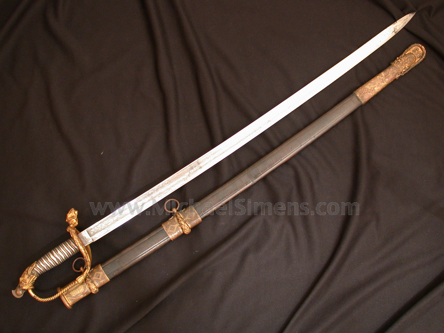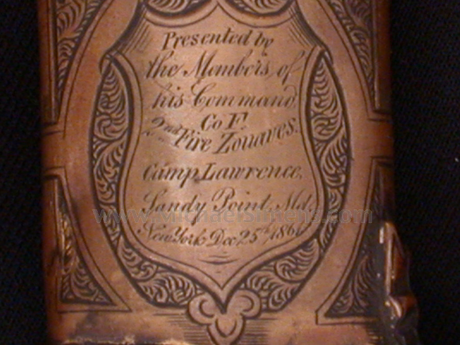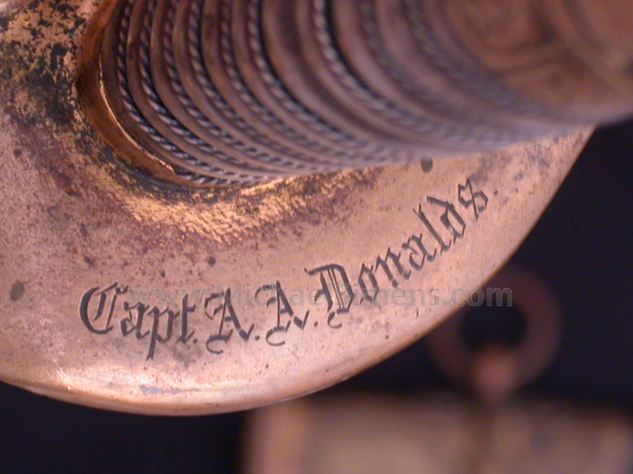 This outstanding presentation grade Tiffany Sword is inscribed on both the back of the guard and on the top mount. This sword is truly rare in that such a high-grade Tiffany is usually found in excellent condition as they were highly prized as keepsakes. Captain A. A. Donald of the famed "Excelsior Brigade" obviously thought his presentation should be used in battle out of respect to the members of his command who gave him this magnificent gift. It is almost certain that Donalds carried this sword when mortally wounded AUGUST 16-SEPTEMBER 2, 1862.--Campaign in Northern Virginia. No.79.--Report of Capt. M. William Burns, Seventy-third New York Infantry, of engagement at Kettle Run and battle of Groveton. HDQRS. FOURTH REGIMENT, EXCELSIOR BRIGADE, Camp near Alexandria, Va., September 5, 1862. COLONEL: "I have the honor to report that the command of this regiment devolved upon me about 5 o'clock on the afternoon of August 27,1862, by Capt. A. A. Donalds (previously in command, Colonel Brewster having been left in Alexandria) being carried from the field mortally wounded. Captain Donalds died on the 29th, after the amputation of his leg. By his death the regiment and the service lose one of their most brave and gallant officers-- one who was always at his post and ready for any and all duties required of him". I am, colonel, very respectfully, yours, &c. M. WM. BURNS, Captain Company A, Commanding Regiment. Col. NELSON TAYLOR, Commanding Excelsior Brigade.