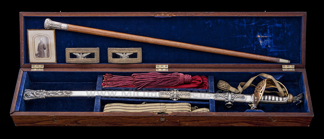 Nothing much needs to be said about this sword in terms of its grade and condition. It is simply magnificent so I'll first write about the man it was presented to. Medal of Honor winner Jacob Frick was born in Northumberland County on January 23, 1825, the ninth of sixteen children, fourth-generation descendants of a Swiss immigrant who had settled in Pennsylvania in the 1700s. In June of 1846, he was commissioned as a third lieutenant in the 3rd Ohio Infantry with the outbreak of the Mexican War, serving with gallantry in several engagements. After the war ended, Frick was commissioned as a second lieutenant in the 11th U.S. Infantry. He married in 1850 and garrisoned at a number of army bases across the country. Later in the decade, he served as assistant instructor of infantry tactics at Fort McHenry in Baltimore. Frick was a delegate to the 1860 Republican National Convention, where Abraham Lincoln received the presidential nomination. When war erupted, Frick was commissioned as the lieutenant colonel of the 96th Pennsylvania and fought in the Peninsula Campaign with notable gallantry at Gaines Mill, for which he was presented this sword as recorded in the Regimental History. On July 29, 1862, he became colonel of the 129th Pennsylvania (the members of whom presented him with this spectacular Tiffany presentation sword as recorded in the Regimental History of the 129th Pa.). Major General Joseph Hooker ordered Frick to lead the last charge at Fredericksburg in December, and he bravely guided his regiment toward the stonewall on Marye's Heights. Talk about "cool under fire"?, as Frick was approaching the wall on horseback along side of one of his captains, a shell burst nearby that splattered remnants of a horse about the Colonel and his Officer. Plucking a large chunk of horse-flesh off of his shoulder, he handed it to his captain and asked him to save the meat for dinner later that evening! The flag bearer and most of the color guard went down as the battle line advanced. Frick quickly seized and raised the fallen flag, but almost instantly, a MinniƩ ball passed close to his head and sheared the wooden staff in two. Undaunted, Frick continued at the head of his command until he was wounded. The remnants of this flag staff were later fashioned into an exquisite presentation cane with a large, delicately engraved handle with presentation and history recorded about its circumference. It remains in this case today as one of the most fantastic and important historical Civil War artifacts ever to have been discovered along with a Tiffany presentation grade set of Colonels shoulder straps. At Chancellorsville, Frick's precision in handling his regiment impressed his brigadier, who declared that "no man ever saw cooler work" than what the 129th Pennsylvania did during the confused fighting. Their firing was "grand - by rank, by company, and by wings, all in perfect order." His embattled soldiers clearly heard Colonel Frick's stentorian voice above the roar of musketry, and his regiment "did its duty well." Six feet, two inches tall and powerfully built, he counter-attacked a superior force after his colors and many of his men were captured. He he recaptured the regiment's lost flag and all of his men in hand-to-hand combat with a large body of Rebels and made prisoners of those who dared capture his colors. His regiment mustered out in May and Frick returned to Pottsville. When Robert E. Lee's invasion threatened the Keystone State, Frick hurried to Harrisburg to assume command of the 807-man 27th Pennsylvania Volunteer Militia. It had been raised primarily in Frick's native Schuylkill County in north-central Pennsylvania, as well as in nearby Northampton, Huntingdon, and Berks counties. Frick's regiment traveled by train from Harrisburg to Columbia, where they formed the bulk of the troops defending the bridge. When John B. Gordon's brigade attacked, Frick skillfully withdrew his militia across the bridge, setting it on fire to prevent Rebel passage. Later, his men were involved in the pursuit of the retreating Robert E. Lee, and the 27th was the first Pennsylvania militia to cross into Maryland while chasing the Army of Northern Virginia. He and the regiment mustered out in August 1863. In June 1864, he assisted Brigadier General Henry Pleasants in planning the explosives-filled, 230-foot-long tunnel under the Petersburg entrenchments, which resulted in "the Battle of the Crater." Frick is one of only 2 American Soldiers nominated for 3 Medals of Honor that I am aware of. One for Fredericksburg, Chancellorsville and for the Gettysburg campaign, (Wrightsville). After the war he remained interested in politics, serving as a delegate to the Republican National Convention in both 1860 and 1868. He remarried after the war, raised a son, authored two books, and manufactured wire screens for the coal mining industry. In 1892, Frick received the Medal of Honor for his valor at Chancellorsville and Fredericksburg. He passed away March 5, 1902, and was buried in Pottsville's Presbyterian Cemetery. He was the first man in Schuylkill County to receive the Medal of Honor. This sword is one of only two (possibly 3) of this pattern known to collectors but as far as I'm aware, it is the only one with a solid silver scabbard (marked Tiffany .925 near the throat). This is without question, the finest sword that I have ever handled when combining the quality of the sword and the man to whom it was presented to. It is one of the most heavily featured swords in John Thilmann's book, "Civil War Cavalry & Artillery Sabers". It is breathtaking. Serious buyers can contact me for a further description and information.