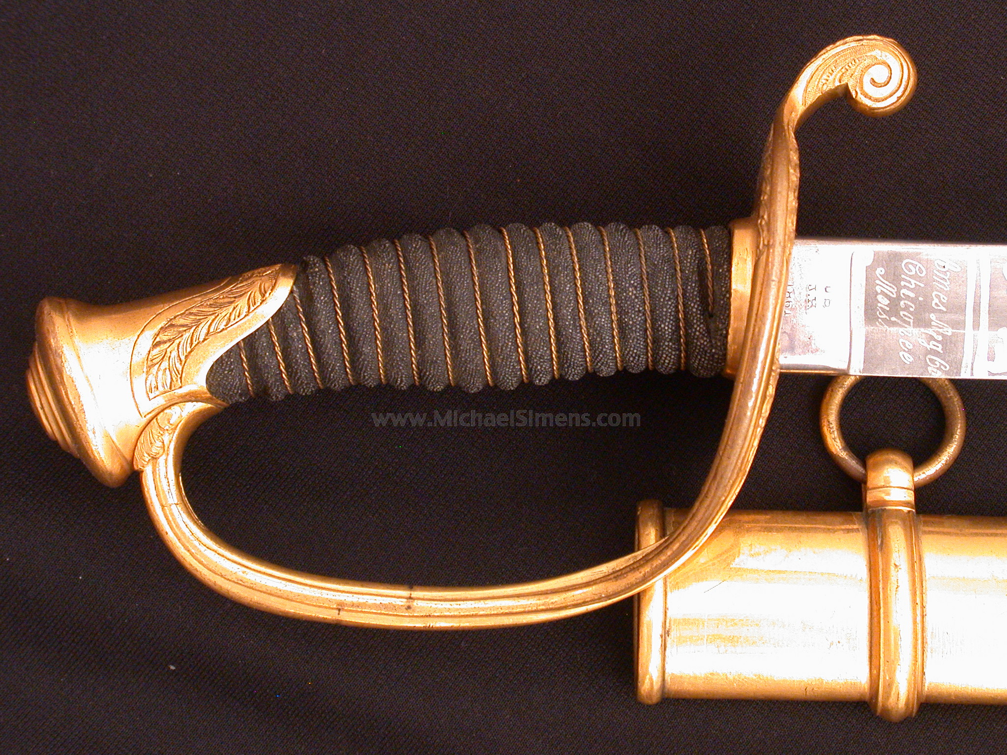 This is a super condition Ames Foot Officers Sword in excellent condition, dated (1861) and inspected. It retains 95% plus gold gilt to the guard and mounts. Has a scabbard that is excellent and sturdy with just minor handling marks and the blade is a 9.5 out of 10 with very frosty etching. This sword would rate at 98% condition to one dated 1862 and sold off of this website for the same price a few months ago.