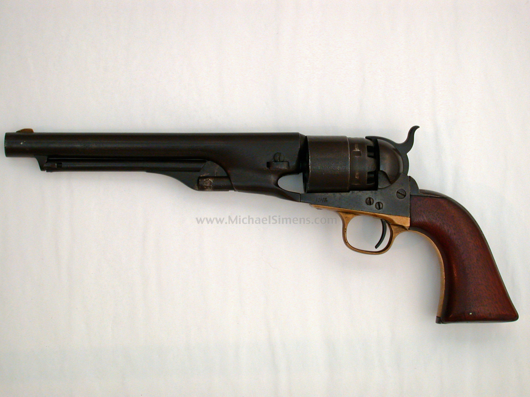 This is a good example of a Colt 1860 Army Revolver. It shows a trace of cylinder scene, has fairly good edges, markings and action and is in an untouched medium brown patina. The grips are original but have been cleaned and slightly sanded which has all but eliminated the inspector cartouches. The lever screw was obviously broken at one time and replaced with a small rod to facilitate proper function and should be replaced, easily done. Priced accordingly for a collector that wants a good example but doesn't want to pay several thousands of dollars for the privilege. A very good looking and honest gun for the price.