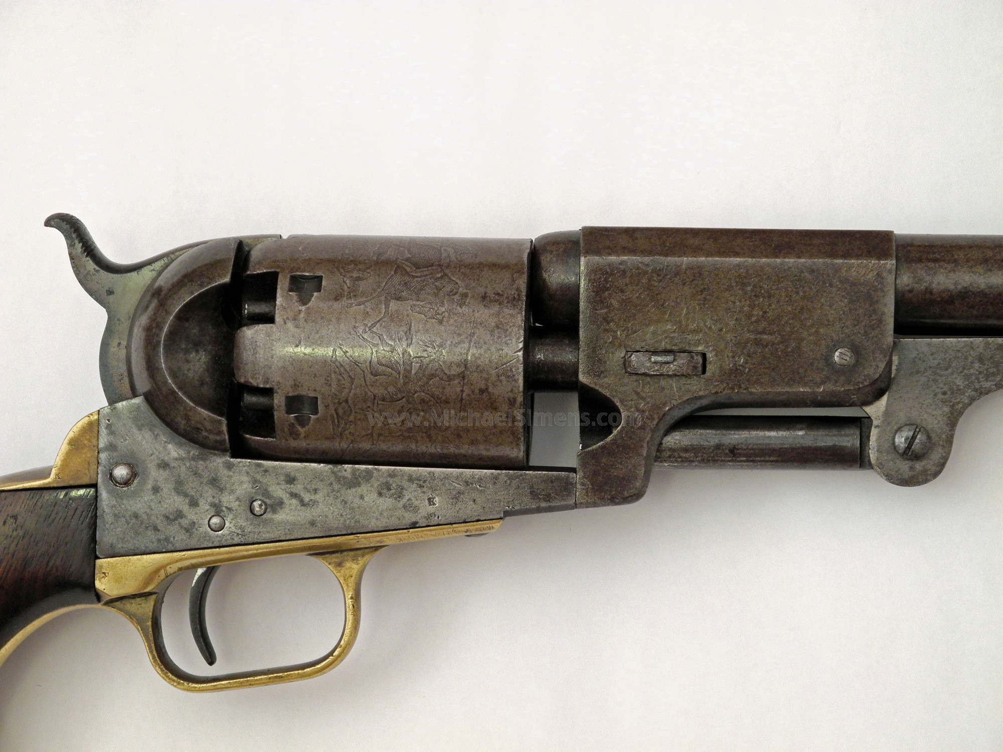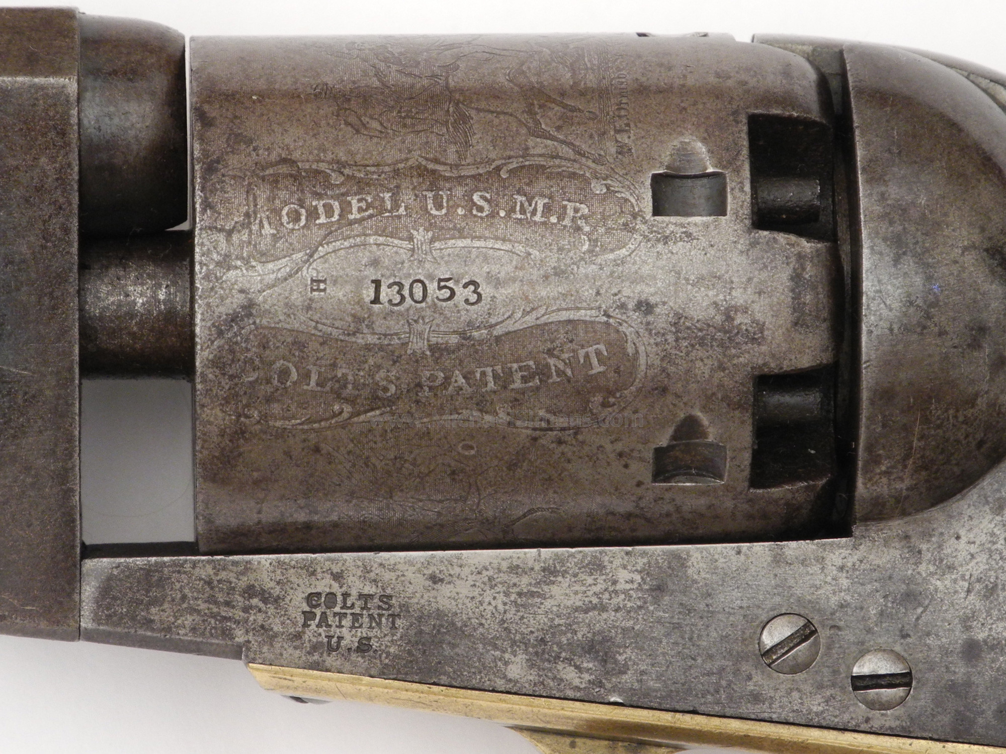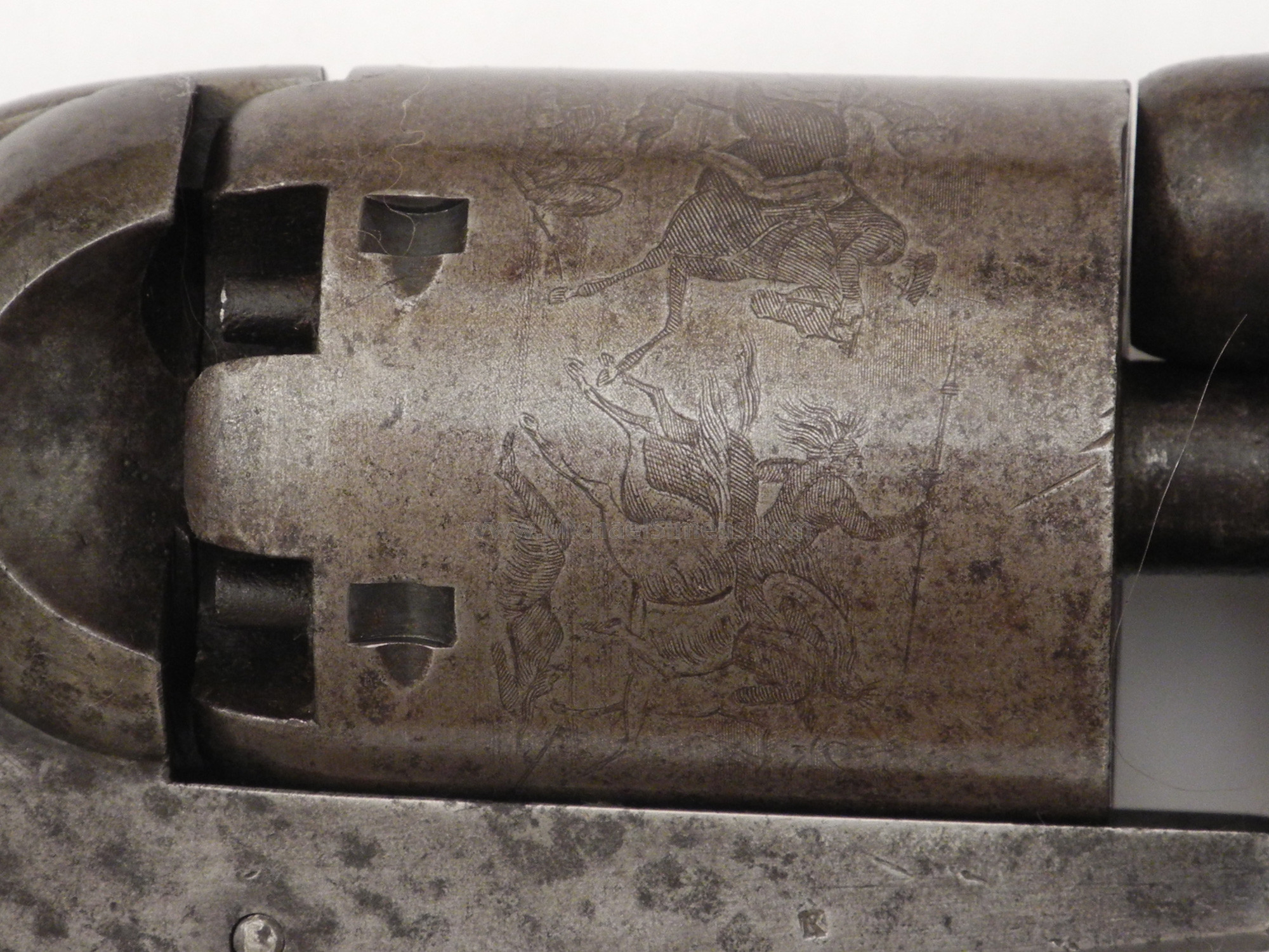 This is an outstanding example of a Martially Marked Colt Third Model Dragoon Revolver. This gun has been pictured on our opening page for ten years for a reason. The cylinder scene is so visible, it looks like a pen & ink drawing. The patination is exceptional. The gun shows strong blue on the barrel mixing with brown patina and smoky case-colors to the frame, lever and hammer that are starting to silver-out. The scene is about perfect and the grips are nice and full with fine cartouches. The action is sharp, as are all markings and edges. A wonderful 3rd model that was never abused and always well cared for.