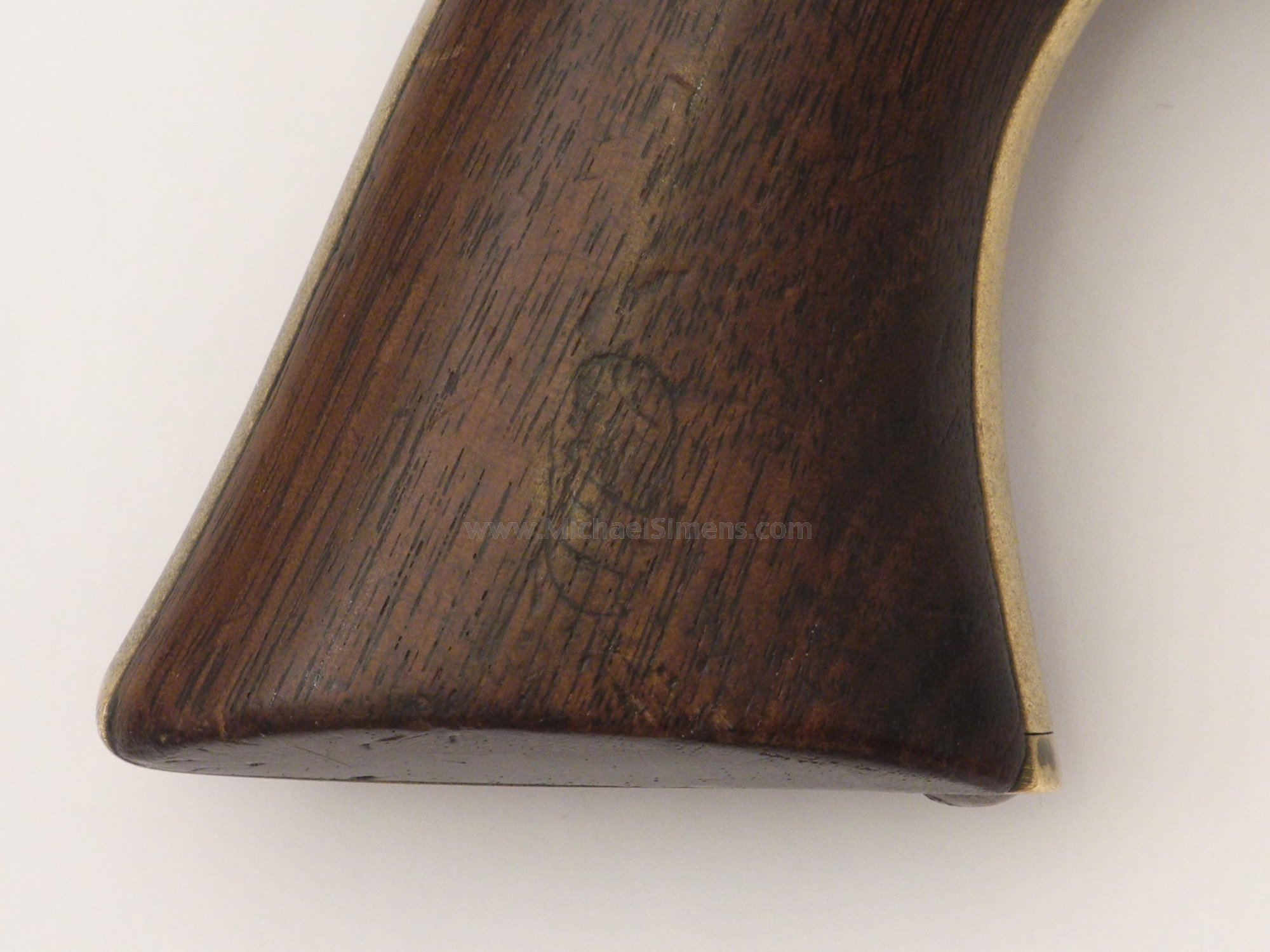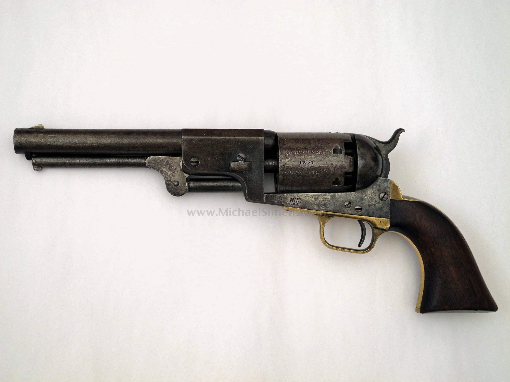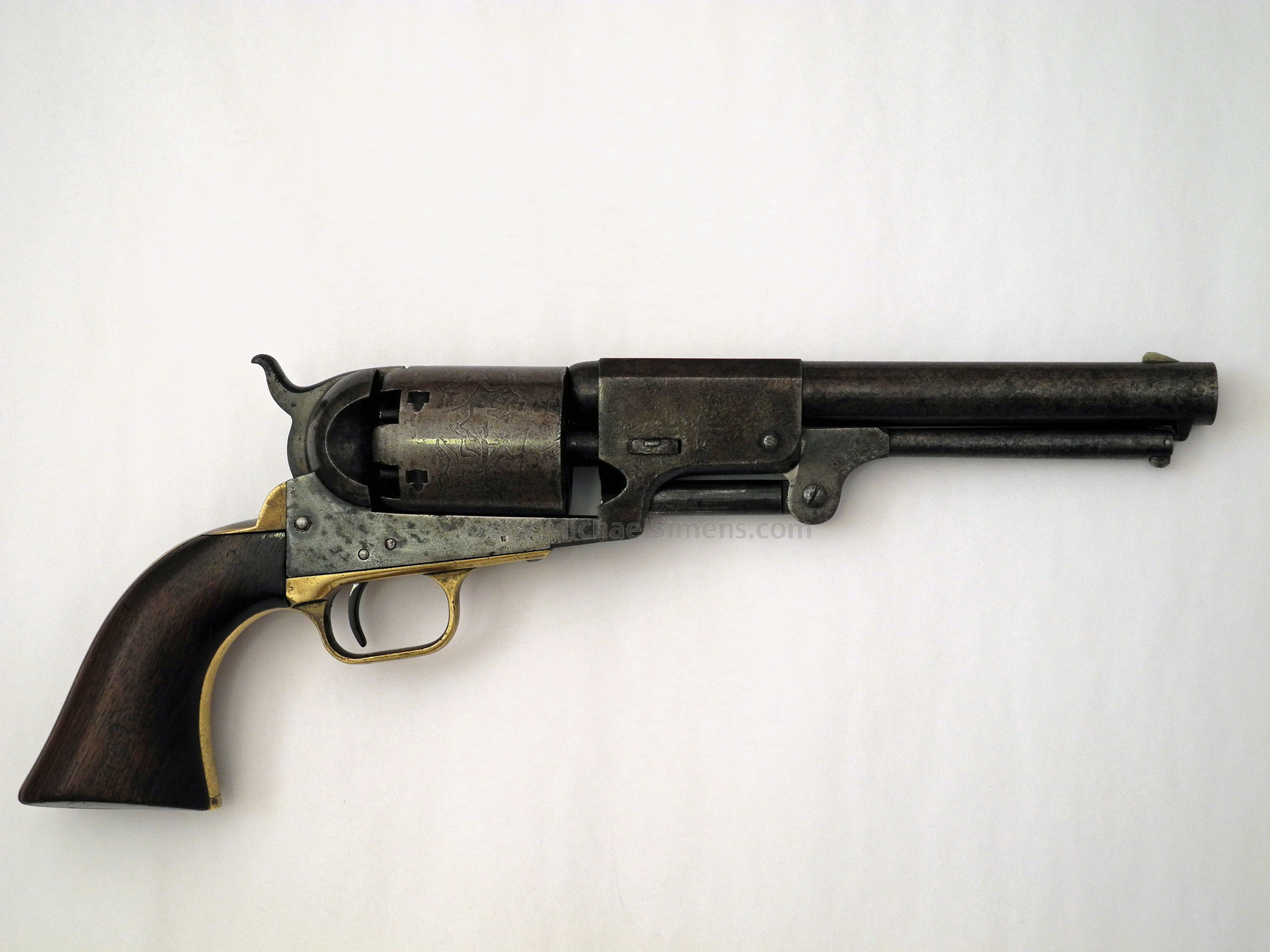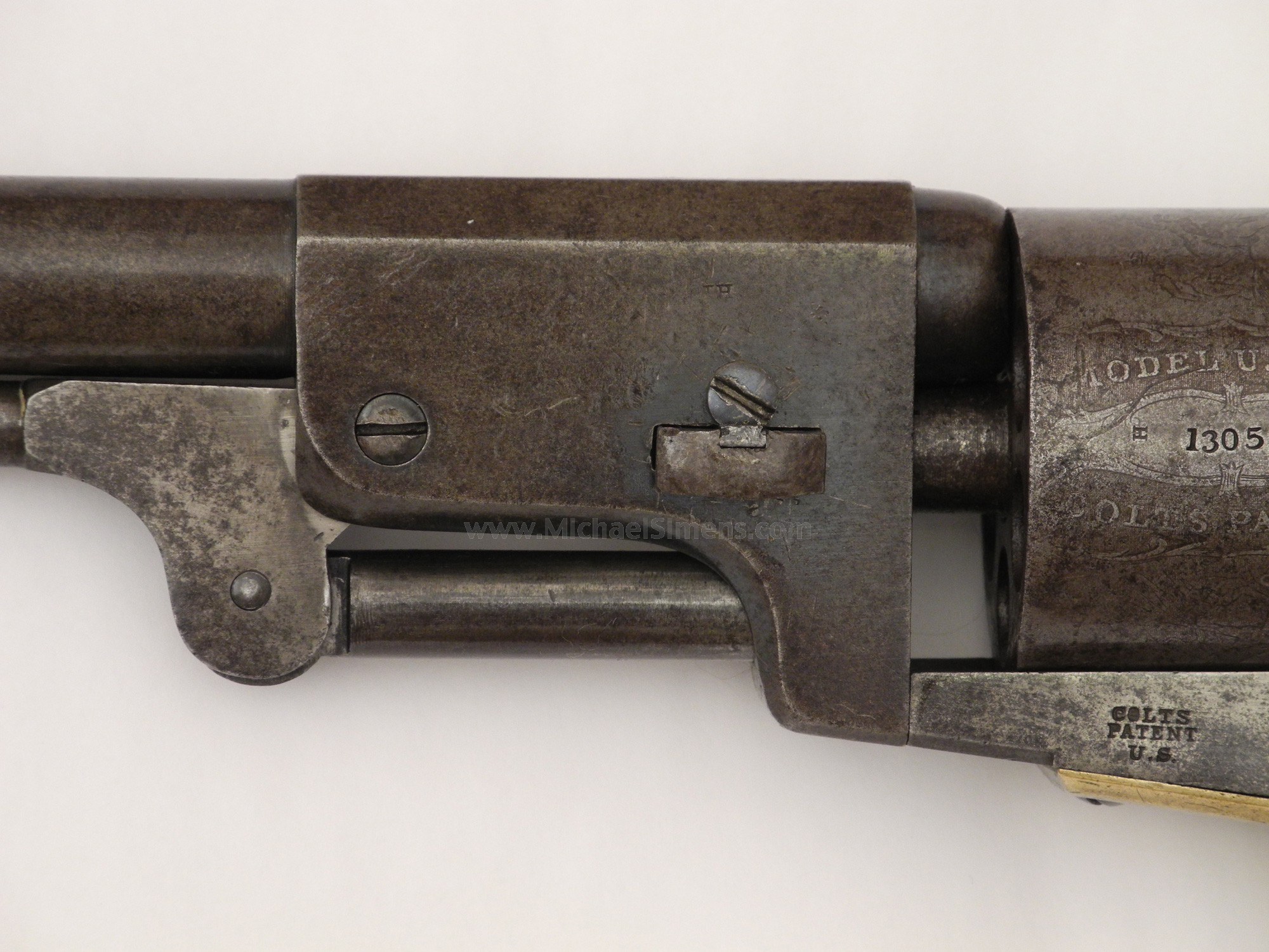 This is an outstanding example of a Martially Marked Colt Third Model Dragoon Revolver. This gun has been pictured on our opening page for ten years for a reason. The cylinder scene is so visible, it looks like a pen & ink drawing. The patination is exceptional. The gun shows strong blue on the barrel mixing with brown patina and smoky case-colors to the frame, lever and hammer that are starting to silver-out. The scene is about perfect and the grips are nice and full with fine cartouches. The action is sharp, as are all markings and edges. A wonderful 3rd model that was never abused and always well cared for.