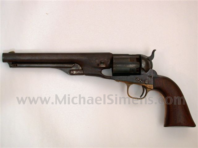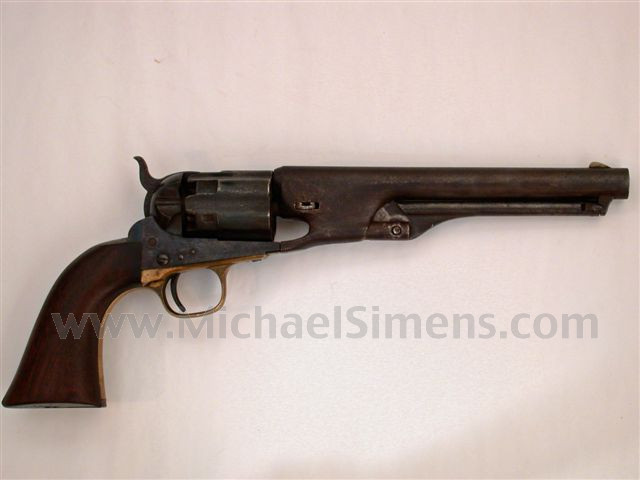 This is a rare, fluted cylinder Colt 1860 Army Revolver that letters to Peter Williams and Company in April of 1861. Obviously seeing Confederate use, It is untouched and out-of-the-woods, having never been offered to the collecting fraternity until this listing. Action, edges and markings are very good and it is in brown patina. The loading lever screw is missing and obviously broke during its period of use as it has been replaced with a rod that was flattened on both sides to retain its seat. The grips are nice and full. A fine, historical Confederate Colt pistol.