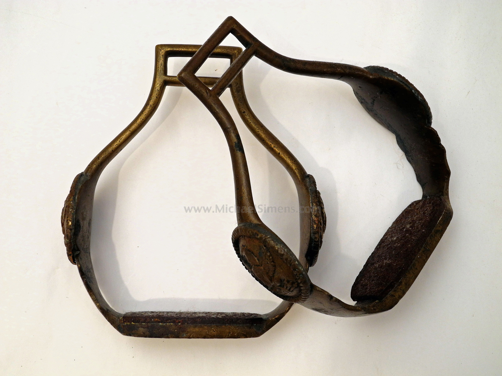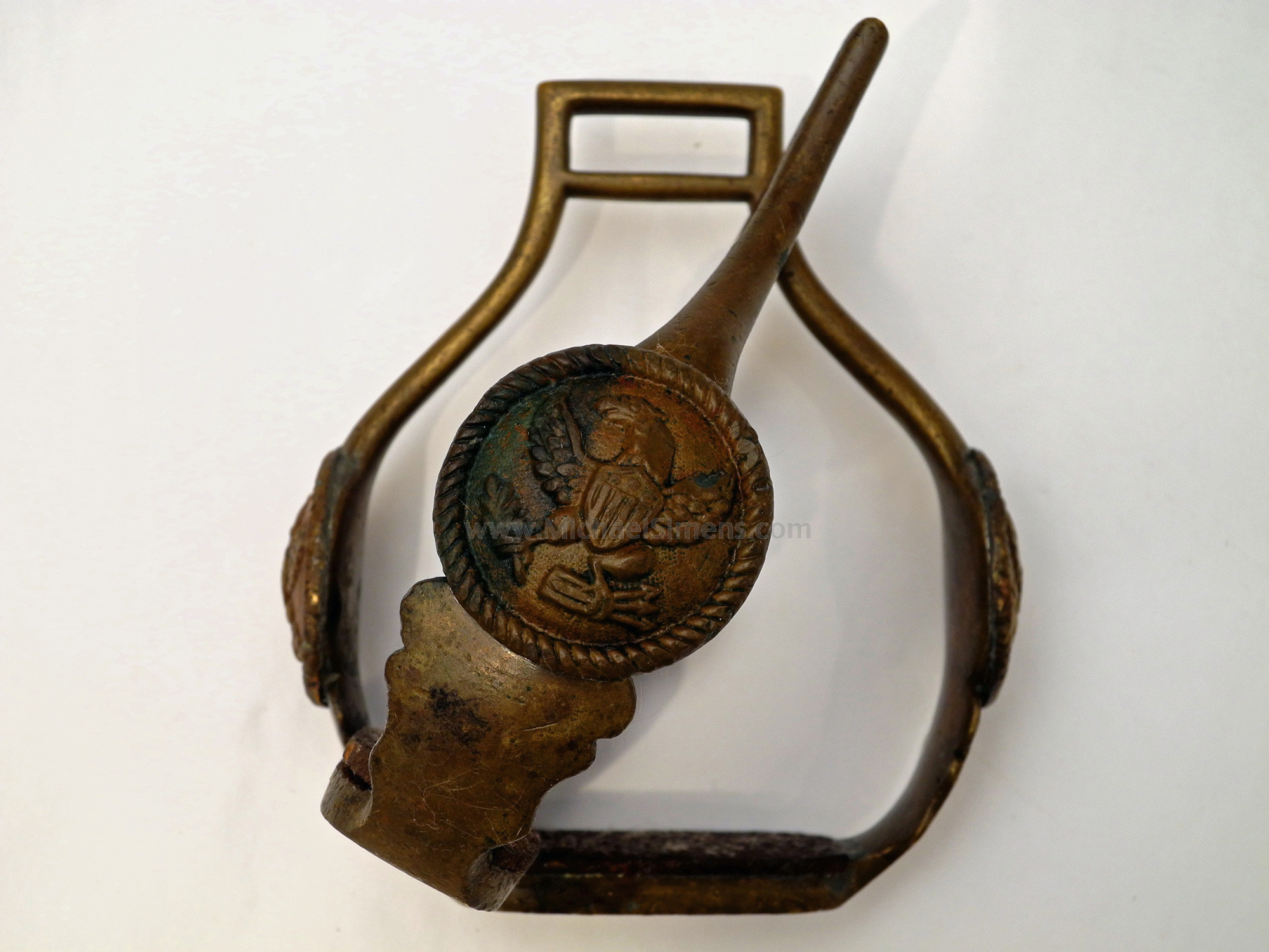 This is a good condition pair of Mounted Officer's Saddle Stirrups as used by high ranking Federal and Volunteer Officers as early as the War of 1812 and used through the Civil War. The display a patriotic eagle medallion on each side and are made of iron and are coated with brass. I doubt that the coating of brass is sheet as many claim. Rather, these parts and others like them are hot dipped, similar to the production of galvanized steel where steel parts or a continuous sheet are dipped on a continuous mill that runs into a vat of molten zinc and rises out with a few thousands of an inch of shiny crystalized zinc on the surface. I doubt that there were rows of workmen with teeny tiny hammers clanking away on sheet brass to form it over these stirrups. The only alternative process during their period of manufacture that was efficient and makes sense was a molten dip. The coating provided corrosion resistance and was quite decorative. After polishing, these would be have been lacquered or had a flash of gold gilt applied for the finished effect. This pair, which I estimate was made during the Mexican War, retain all of there brass coating, but are filthy dirty. They are untouched. A gentle cleaning would bring them back to life and these are great for display on a book-shelf or when put onto a fine period saddle. These used to sell for $2500 - 3500.00. These are quite reasonably priced.