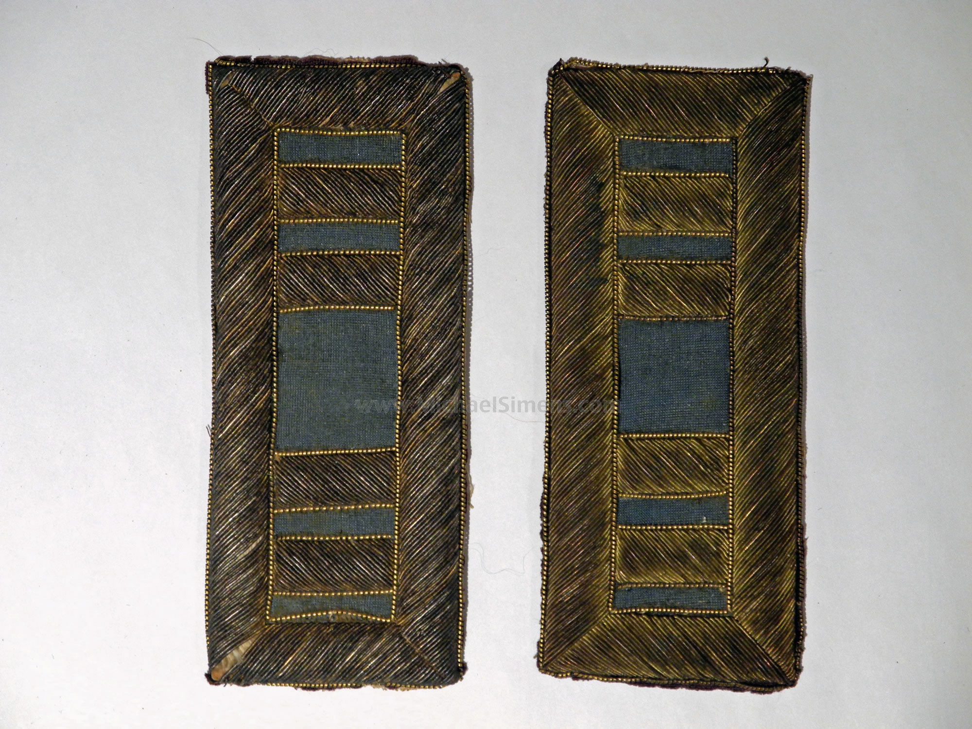 These are a fine condition pair of Civil War Shoulder Straps for the rank of Captain. They show the usual wide gold-bullion threading and are ready to be put in a display case or to be sewn on to an officers coat.