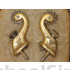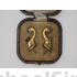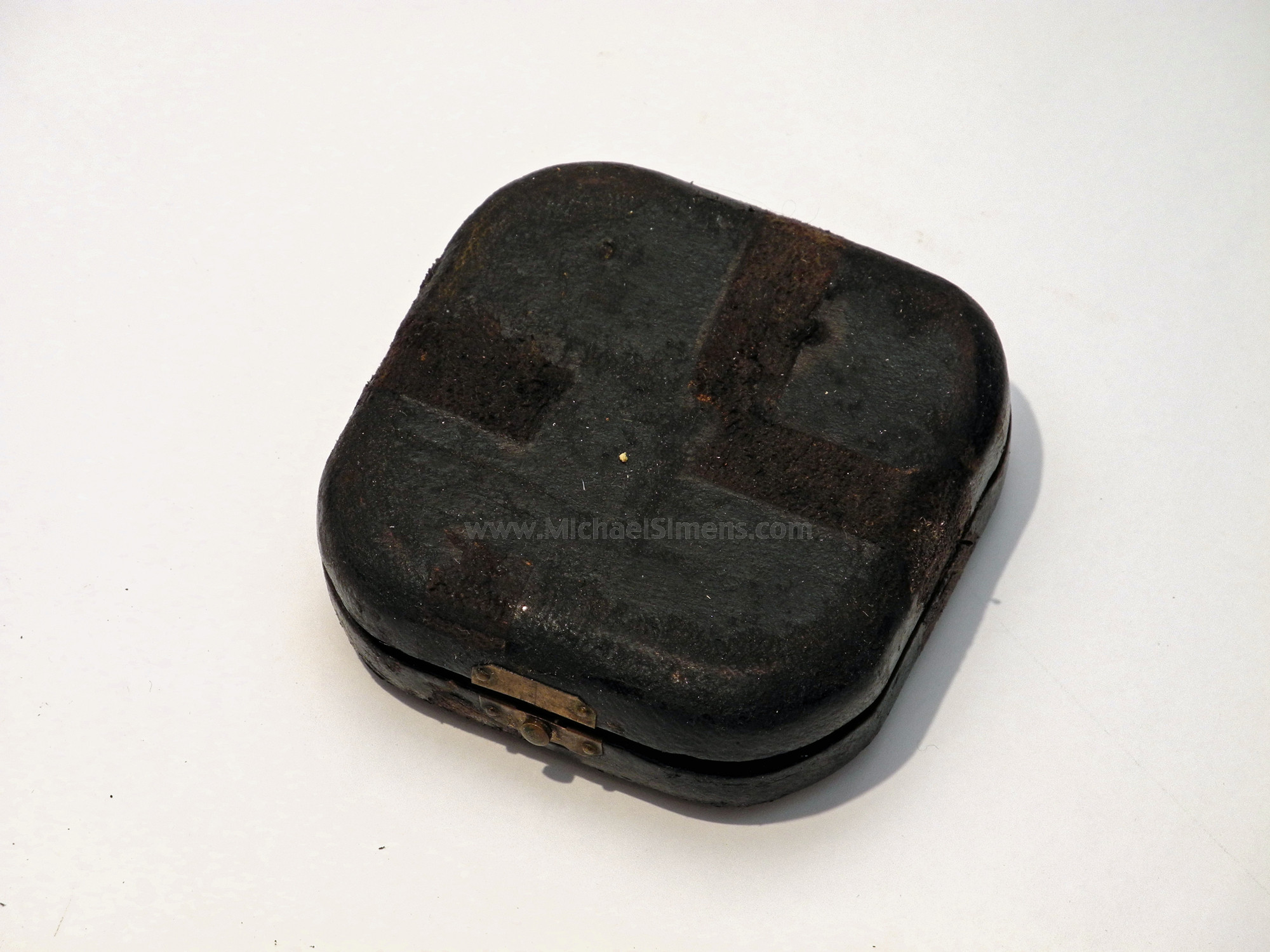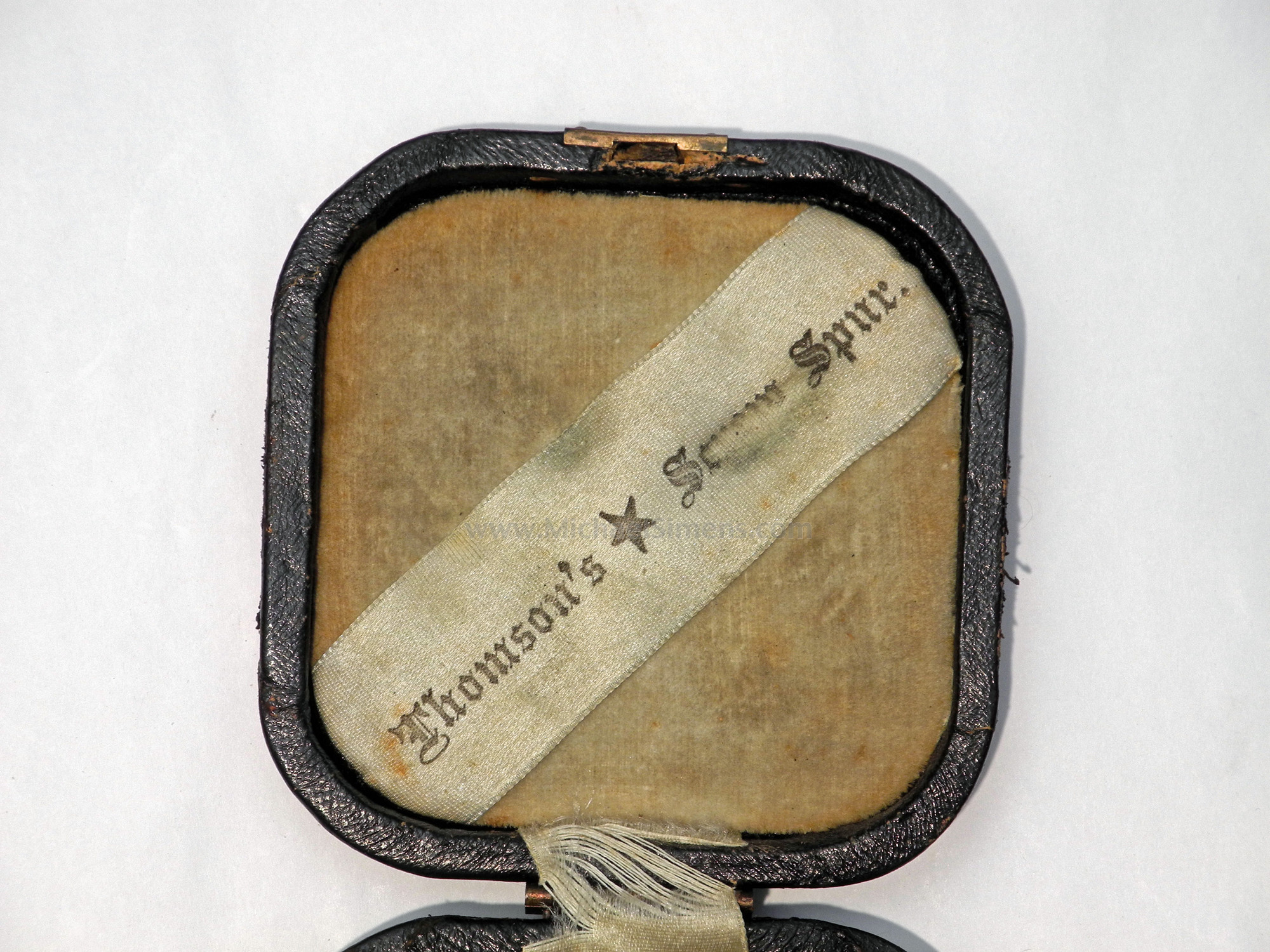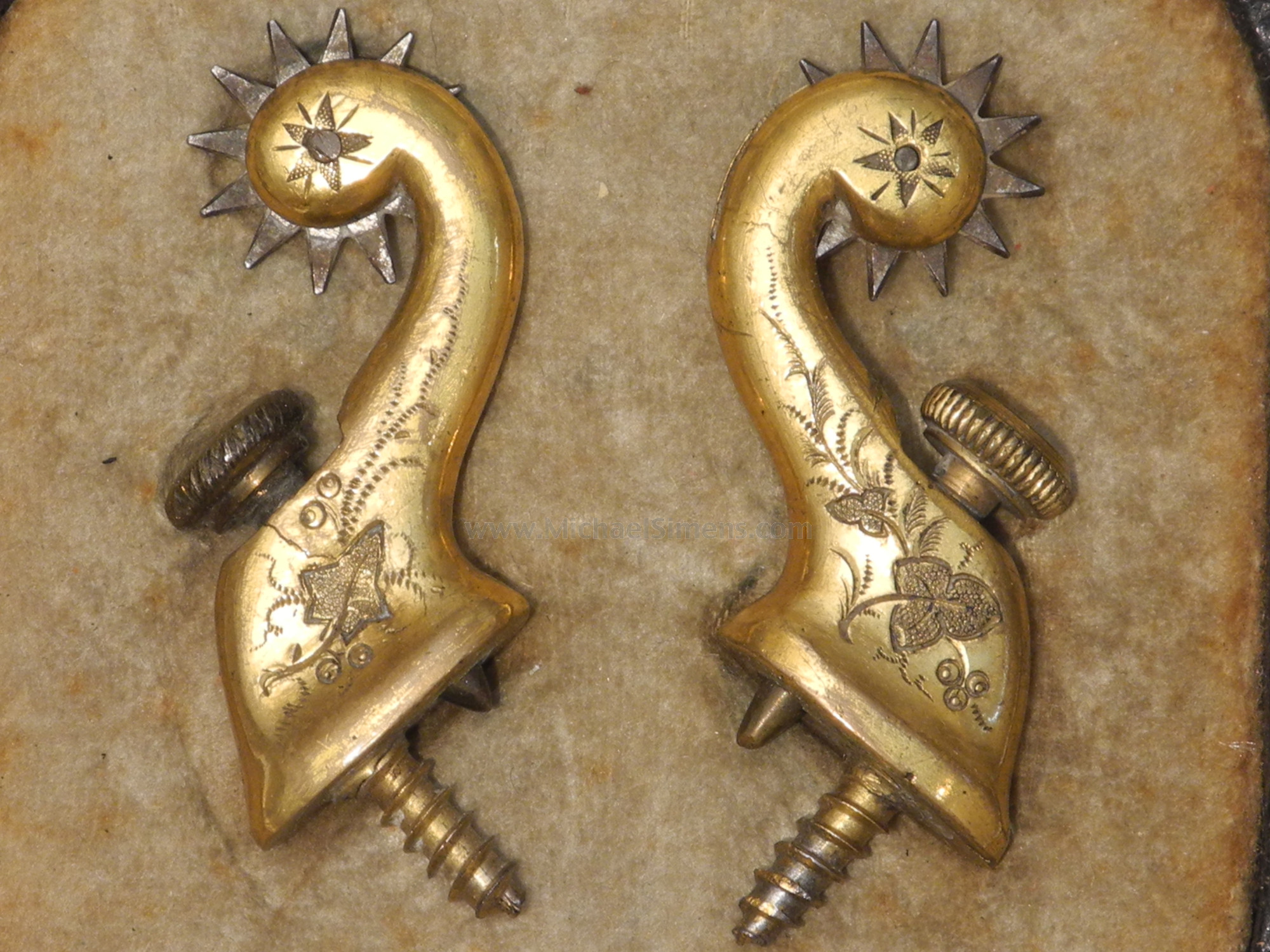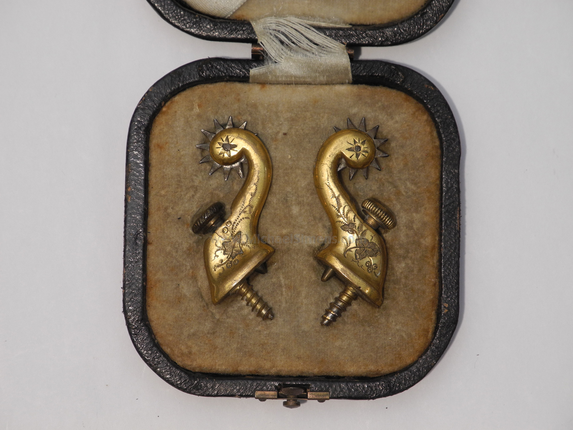 This is a wonderful little pair of Indian Wars period Officers Spurs, cased in their original form fitted leatherette case with felt interior. Patented in 1881, these would have been used on the frontiers during the 1880's at the height of the Plains Indian Wars against the Sioux & Cheyenne as well as the Southern fights in Texas and the Arizona Territory against the Apache and Commanche. The case retains its original ribbon makers label of "Thomson't Screw Spur" inside the lid. Each spur shows hand chase-work and gold gilt body with steel rowels and they are in excellent condition showing very little wear and almost 100% of their gilt. The interior of the case is excellent and the exterior shows wear and slight damage to the leather that appears to have been taped shut at one time, the removal of which has left a pattern of slight leather damage on the top and bottom. Still, a wonderful, seldom seen pair of bonafide Indian Wars War spurs that are in nice shape and they certainly would make a nice addition to any display.