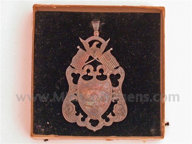 This is a lovely patriotic Civil War period medal made of coin silver presented to the top marksman of the Olden Rifles in 1861. The Olden Rifles were from Lawrence, New Jersey and were formed May 31, 1861 after Lincoln's call for 75,000 troops. They were named after Governor Olden of New Jersey. Further research is needed on this medal as the recipient could be of some importance. Recipient of the medal remains unknown.