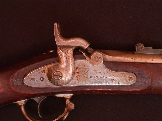 This is an untouched and extremely fine condition 1863 Rifled Musket with L.G. & Y., WINDSOR MARKINGS. This is the type of musket that could be cleaned to nearly excellent condition as it shows no roughness or staining, just some recent surface rust from poor storage. The wood is also excellent with a nice cartouche.