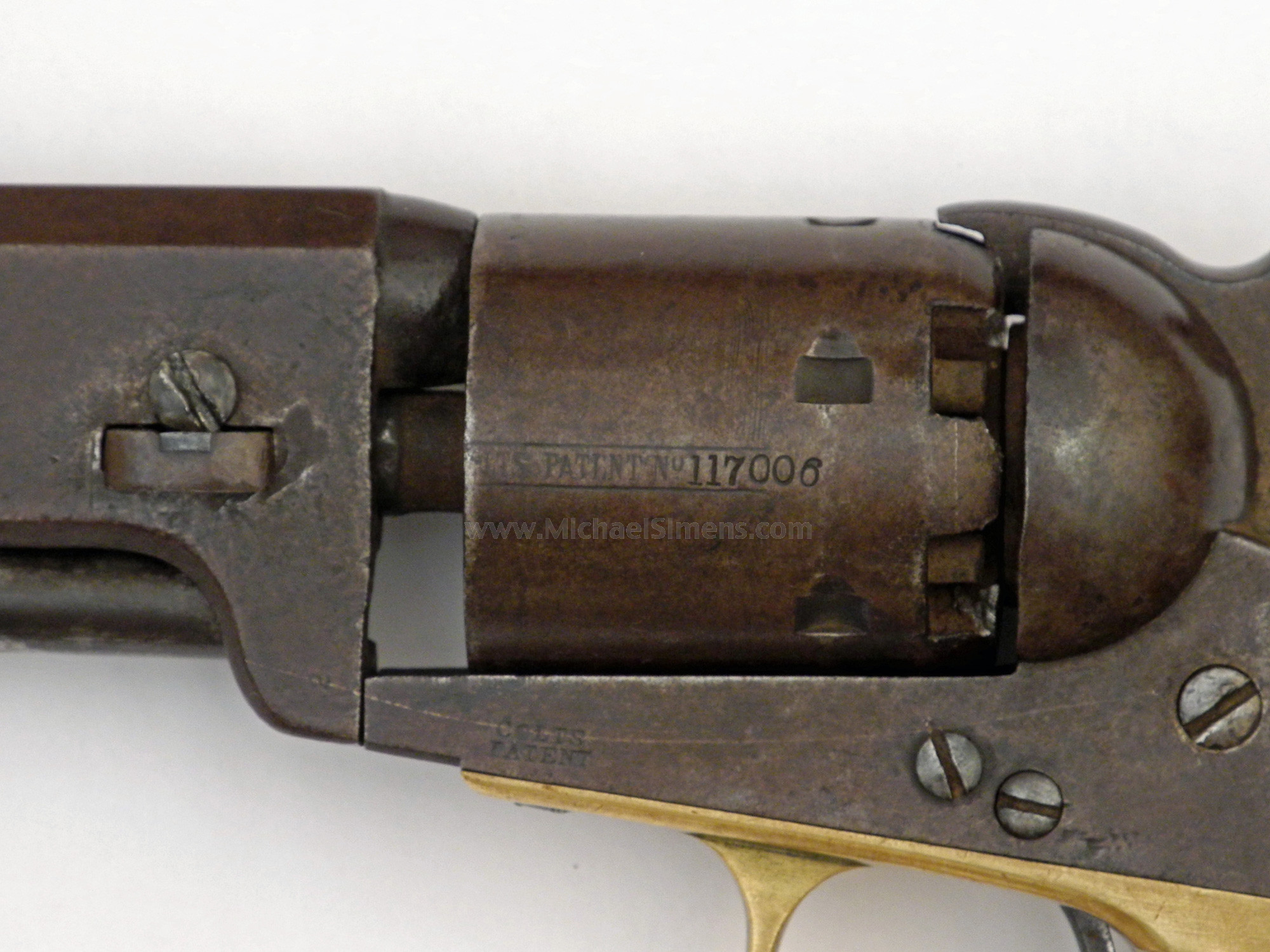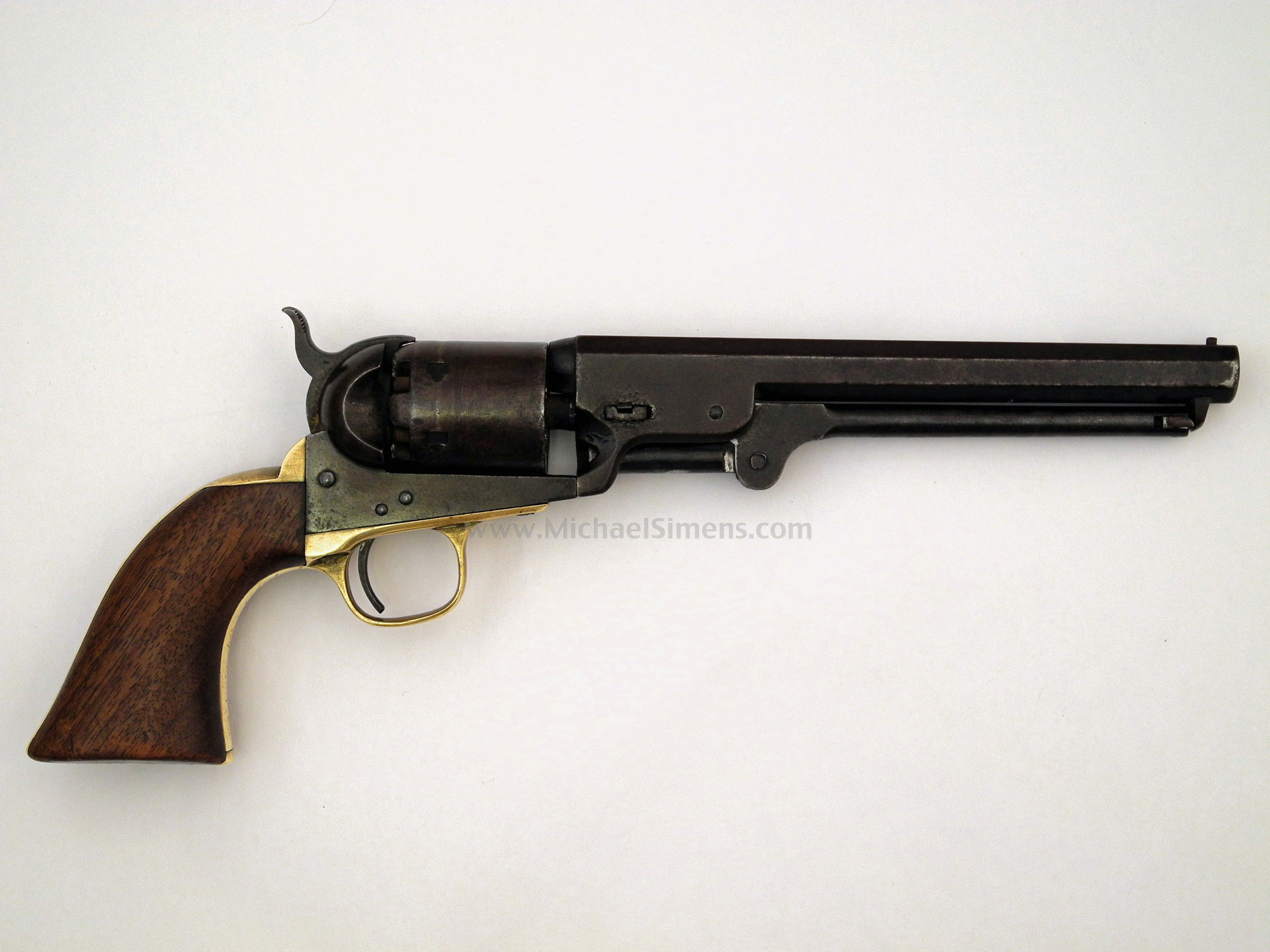 This is a good condition 1851Colt Navy Revolver manufactured in the early months of the Civil War. It is in a deep brown patina that has never been touched. It shows good action, markings and edges and a set of full, original grips that show very little varnish left to their surfaces. It retains about 60% faint cylinder scene. The lever and plunger screws are poor replacements and should be switched out. A good gun that was there.