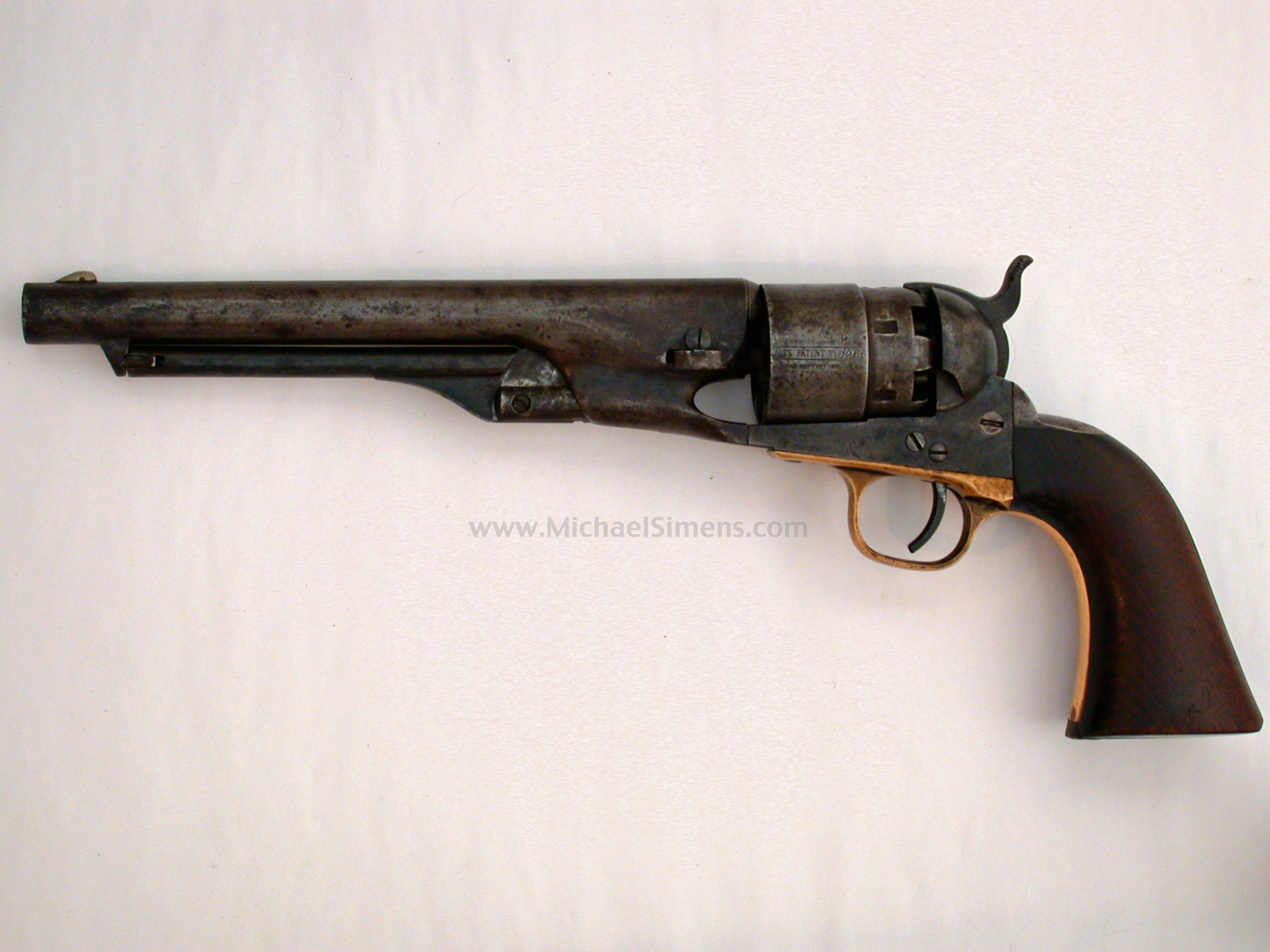 More than 200,000 1860 Army Revolvers were manufactured from 1860 through 1873. Colt's biggest customer was the US Government with over 127,000 units being purchased and issued to Union troops and was the most widely used revolver of the Civil War. This Colt Civil War Revolver is one of these issued guns and is generally in good to very good condition. It shows mottled coloring from grey to brown over all its surfaces with scattered areas of minor rusting. 70%+ light cylinder scene remains and the frame shows traces of case colors. Action and grips are very good with inspector cartouches still showing, but not boldly. A good condition, solid gun that has seen plenty of use but retains good over-all condition.