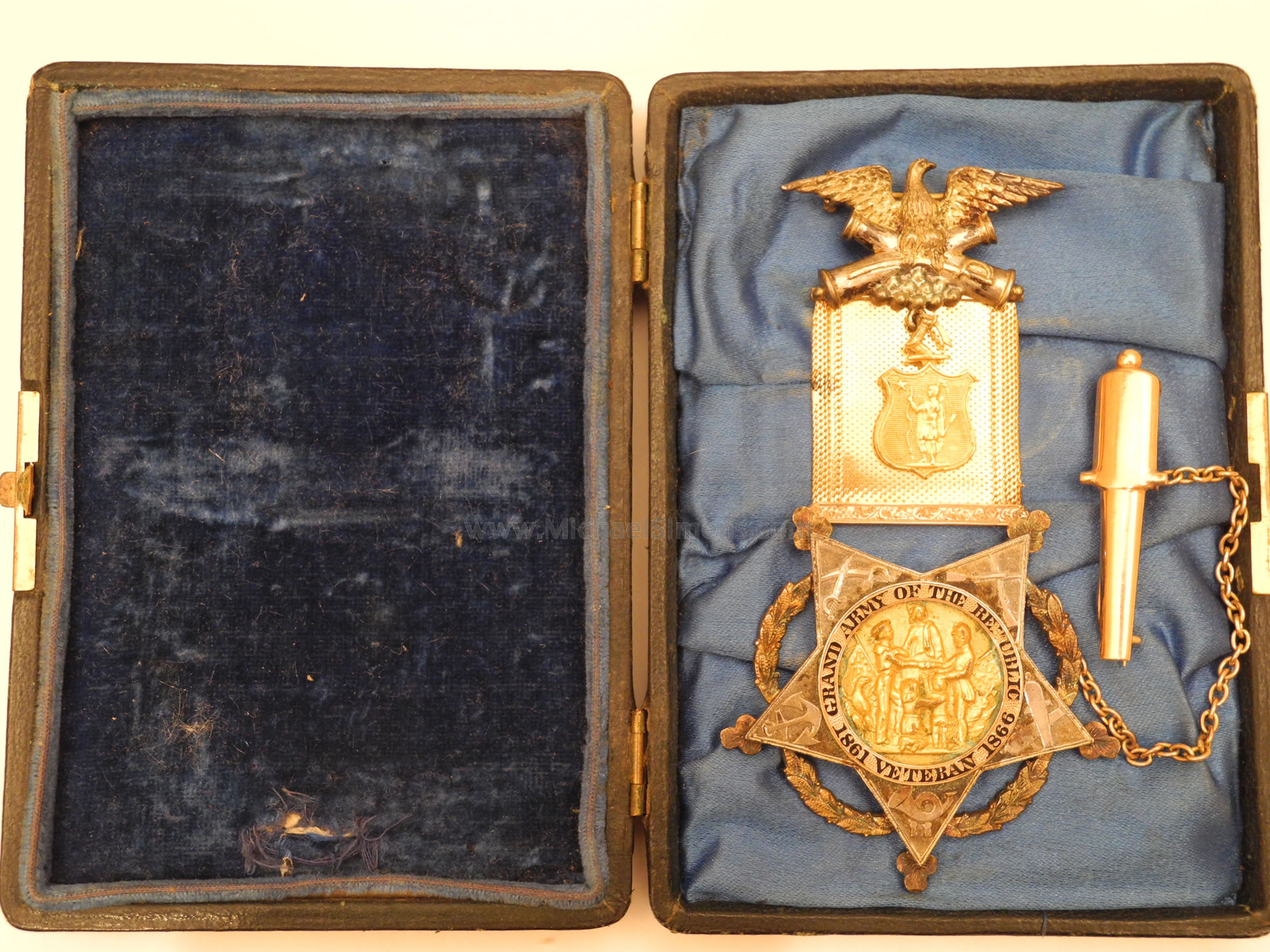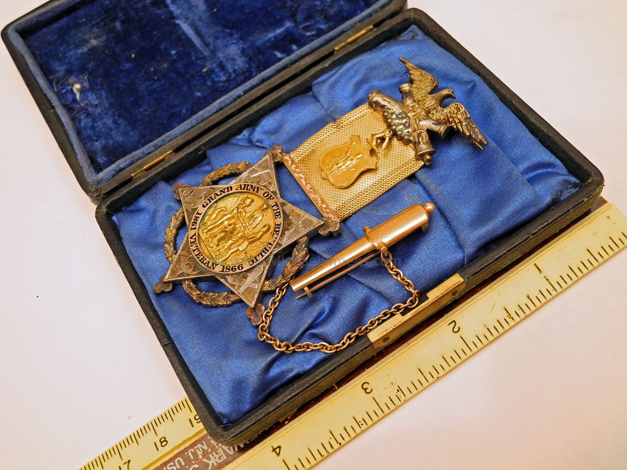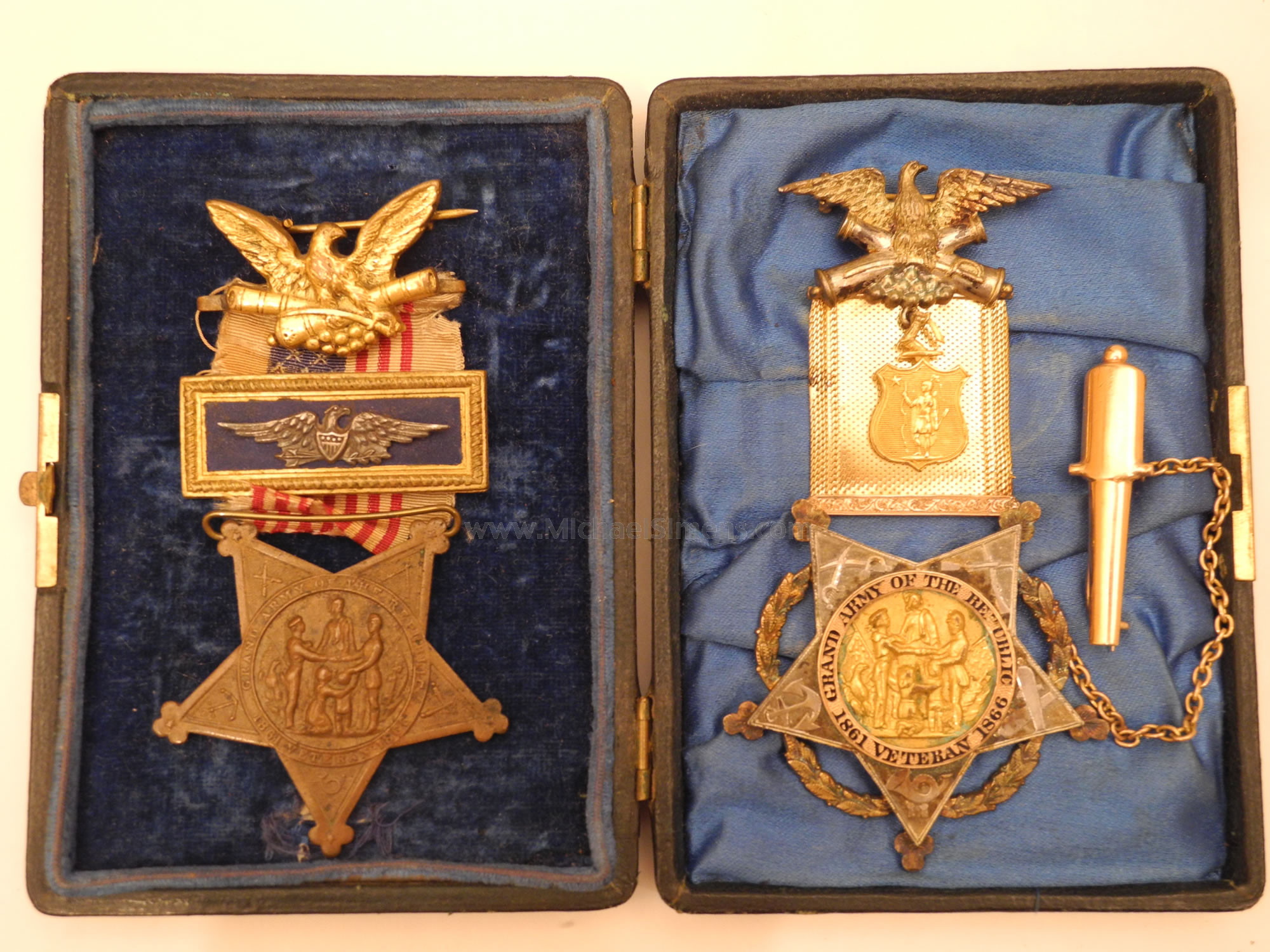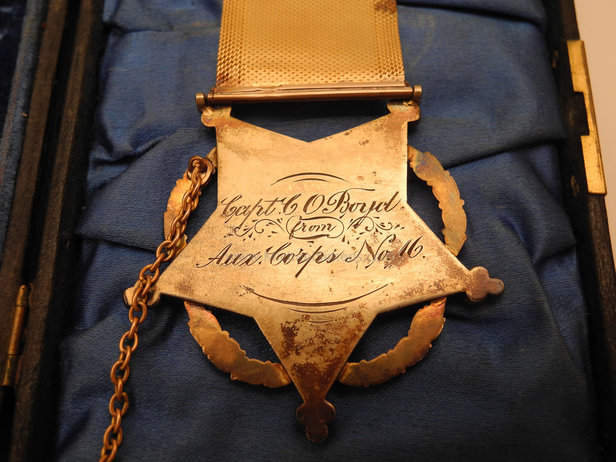 Here is a nice pair of medals belonging to Charles O. Boyd of the 6th Massachusetts Light Artillery. After the war Boyd was commander of Massachusetts GAR Post #4 (U.S. Grant Post). The case contains its original deluxe solid gold and gilt brass medal with chained cannon, inscribed on its reverse; "Capt. C.O. Boyd from Aux. Corps. #16". It is accompanied with his commanders badge that he pinned to the verso of the case. Case and medals are in excellent condition.