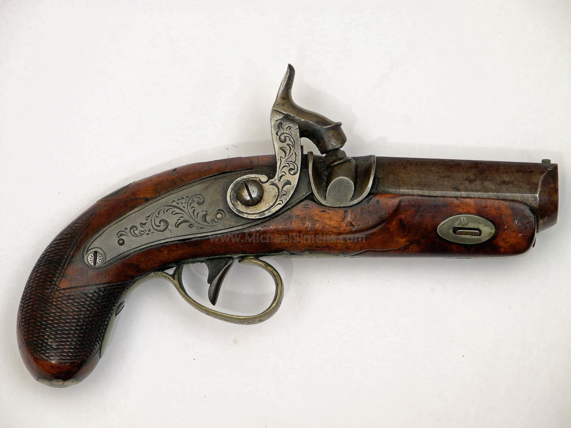 This is a very nice, untouched condition Henry style Derringer. It is totally unmarked and I therefore suspect Great Britain as its place of origin. It is tastefully engraved on the lock, side-plate and hammer and has a coin-silver thumb-piece. The wood is excellent save for a crack on the left side near the barrel escutcheon and they are checkered.