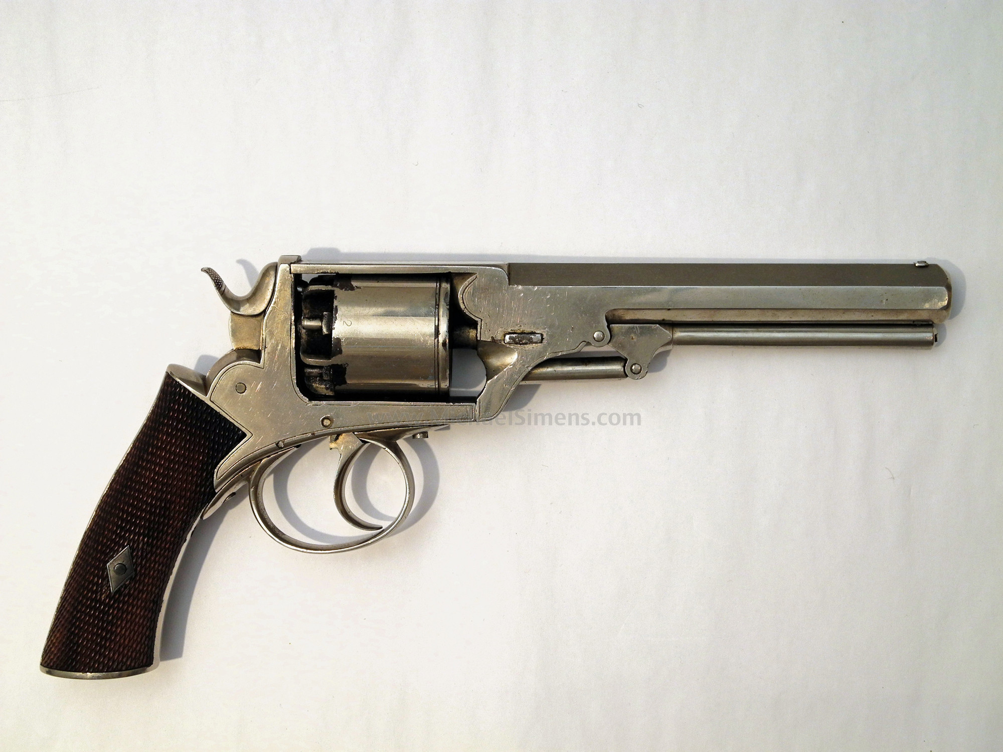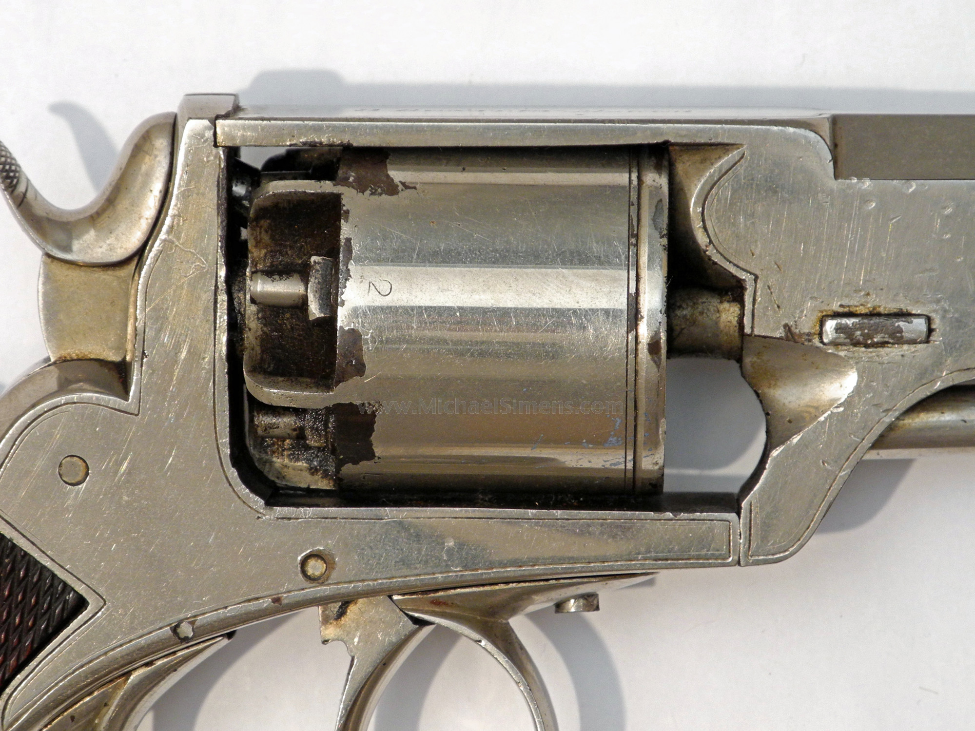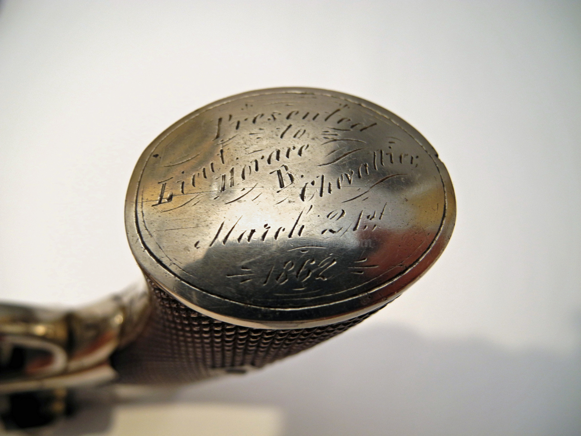 If you collect inscribed Civil War Revolvers with good history, you might be a collector that tries to get different variations to fill out your group. Here's one you probably don't have. This is a fine condition Bentley Revolver with a no-brainer, 100% original inscription on its butt that reads, "Presented to Horace B. Chevallier, March 21st, 1862. The gun is an extremely nice example that shows a period nickel plating that may or may not have been applied before presentation, taking into consideration that the regiment would be aboard ships and exposed to the salt-sea air. The top-strap shows a strong, "D. Bentley, Maker" address and is serial numbered in the 25XX range with British proofs. The grips are an excellent condition checkered walnut and the action is as-new but with a broken trigger return spring, easily repaired by a competent gunsmith. Chevalier mustered in January of 1861 as a second Lieutenant into the New York Marine Light Artillery, a somewhat unusual unit with unusual service. This regiment was raised and organized at New York City by Col. William A. Howard for service on gunboats, which were to be provided for it. Most of the men were recruited in New York City, Buffalo, Newark, N. J., Chicago, Ill., and Washington, D. C. They were mustered into the U. S. service from Nov. 12, 1861, to Aug. 18, 1862, for three years. The regiments ten companies left the state by detachments during 1861 and 1862; served at Annapolis, Md., and from Aug., 1862, in North Carolina, attached to the 18th and 10th corps, portions of it taking part in the following engagements: Roanoke island, Elizabeth City, New Berne, Elizabeth, siege of Fort Macon, South Mills, Tranter's creek, Swift creek, Neuse river Washington, near Shiloh, Rawle's mills, expedition to Goldsboro Kinston and Folly island, and several minor affairs. The regiment was disbanded in March, 1863. It lost during service 1 officer and 14 men killed in action; 2 men mortally wounded; 1 officer and 72 men died of disease and other causes, a total of 90. Chevalier served for the bulk of their action and was discharged in late November, 1862. This is a cool looking gun with a great inscription and good service, similar to what the U. S Marines were doing at the time and artifacts from the any State or U.S. Marines during the Civil War are extremely rare.