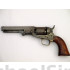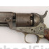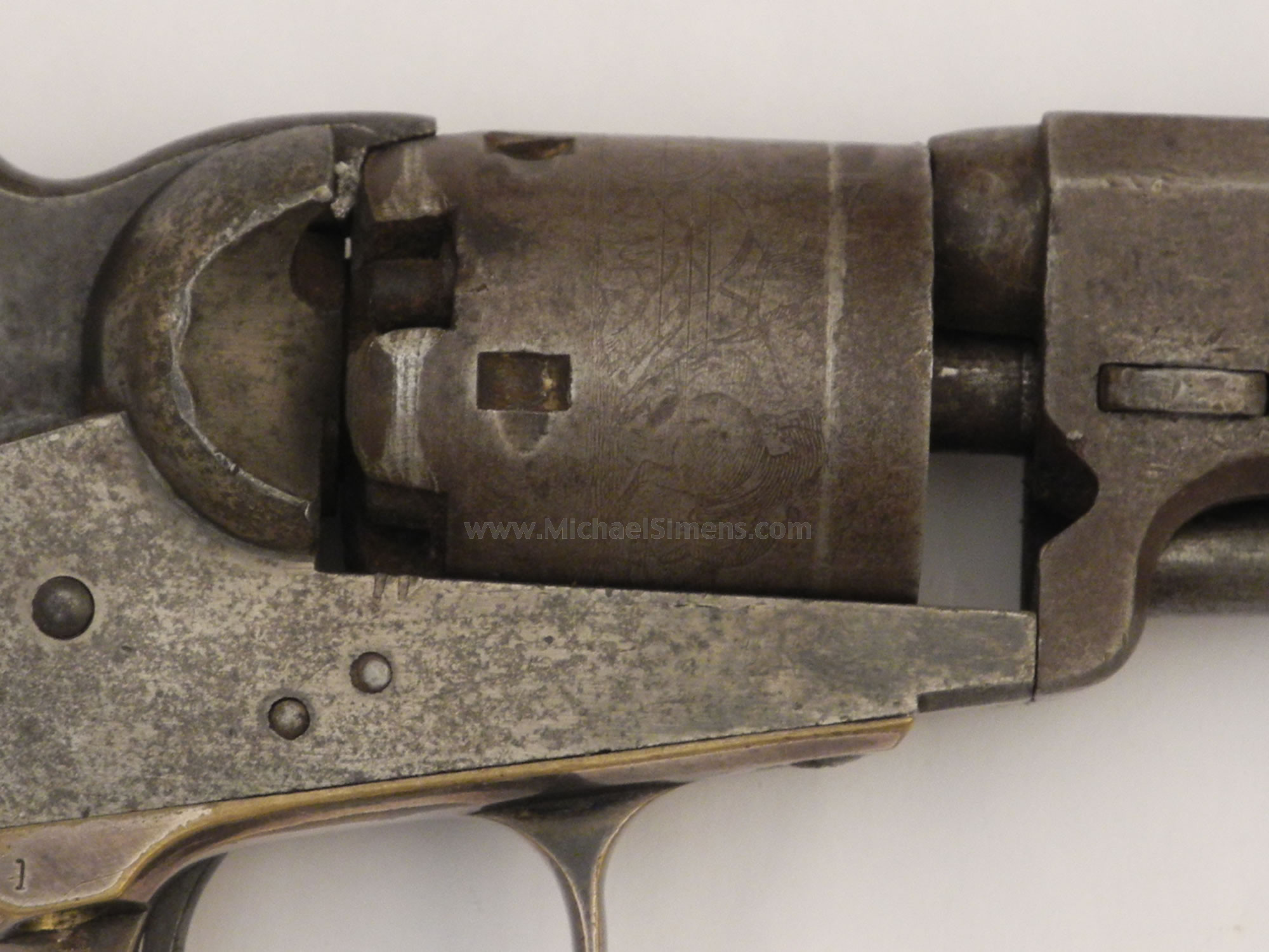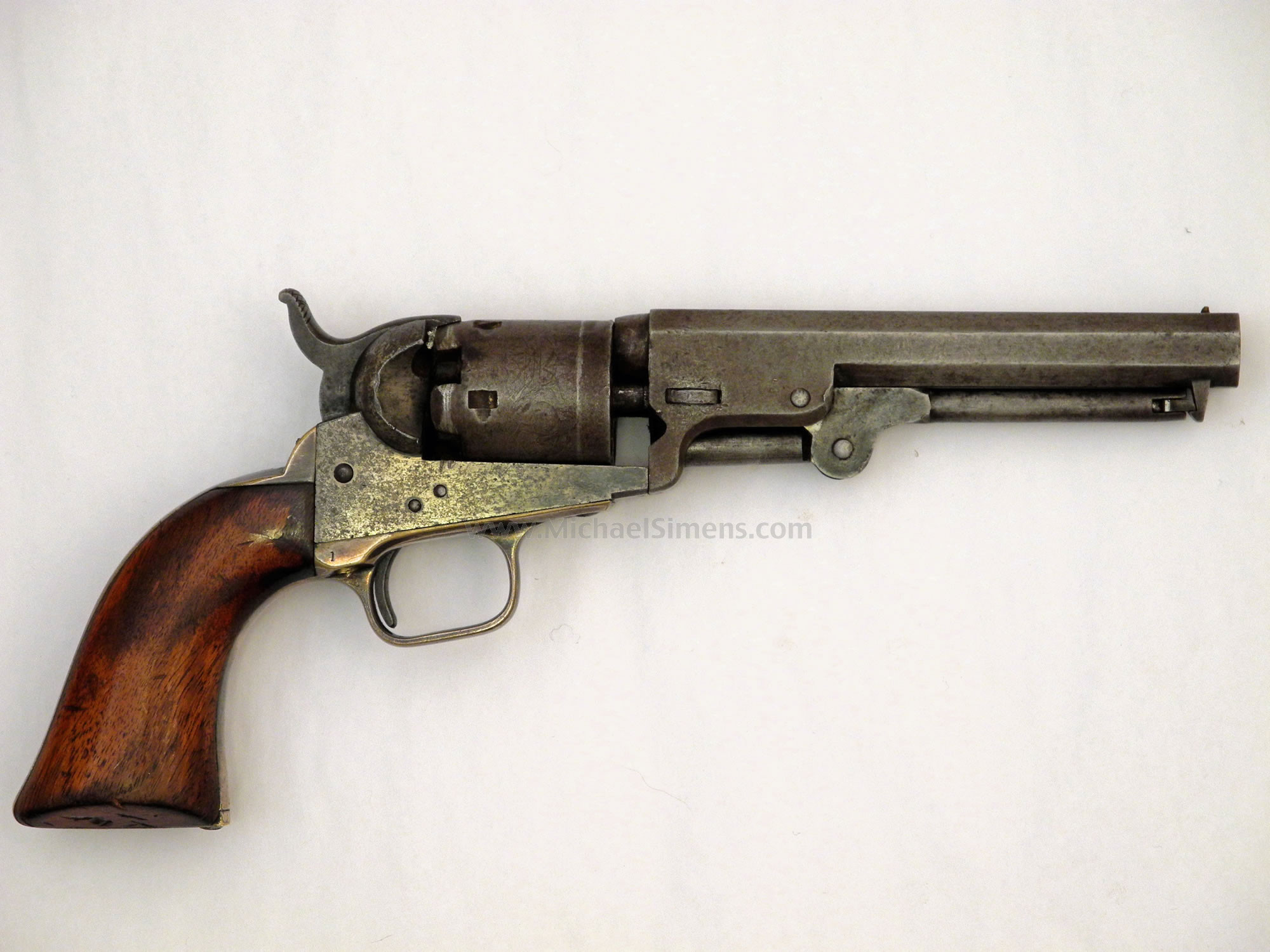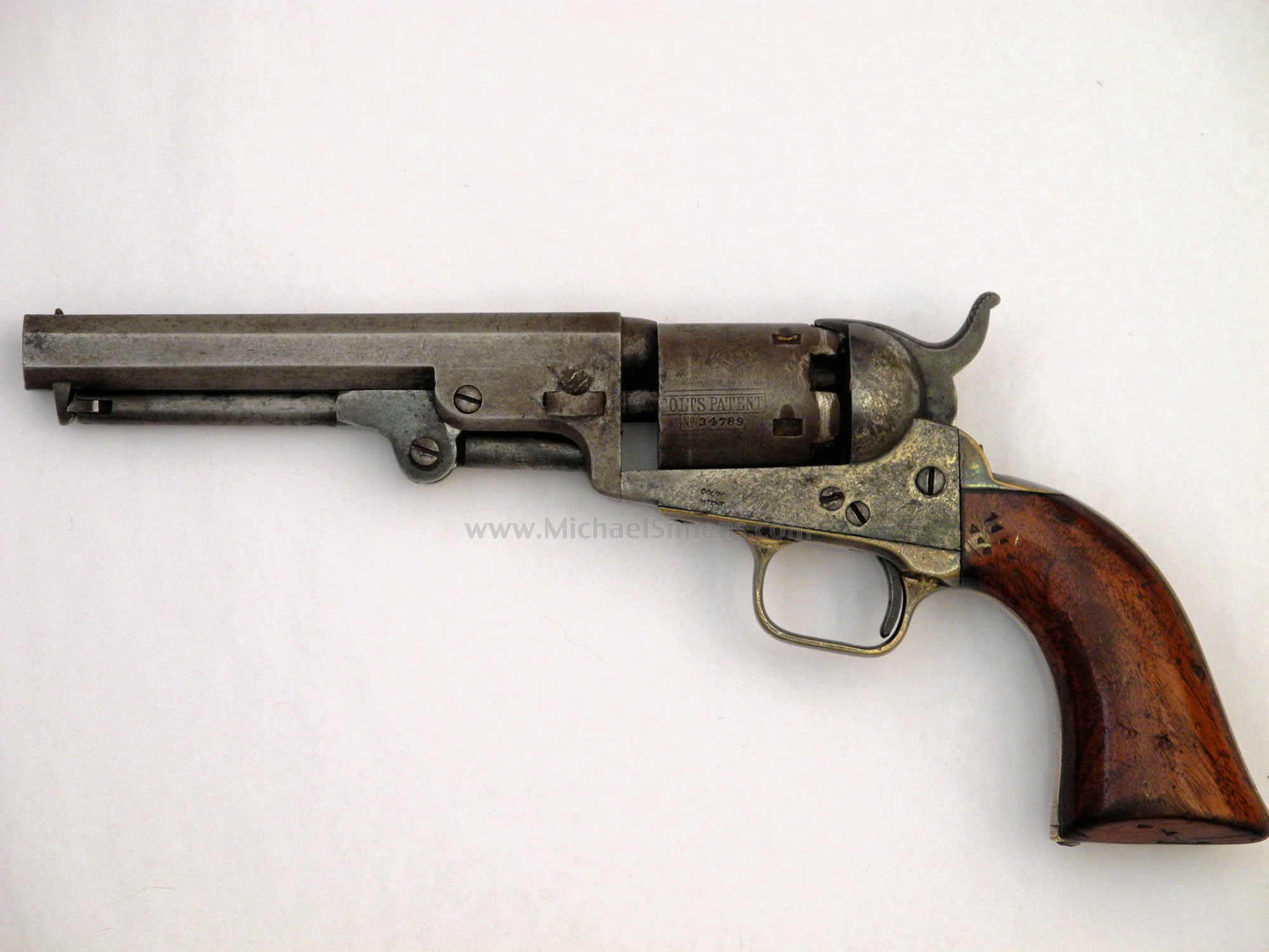 This is a very nice 5 inch colt pocket revolver. It's very early, and in the 34,000 serial number range. It shows an overall gray patina and has an almost complete absence of original finish other than a trace of blue under the barrel. The nice part about it is it's very crisp with almost all of its cylinder sscene, 98% original silver plate on the back strap and trigger guard and 98% original varnish on fine, full grips. The cylinder has a score mark around it that's actually very slight where someone screwed the wrong screw into the front of the trigger guard and it protruded out the top of the frame. As the cylinder was rotated, it left a line where the screw scratched the cylinder. The timing was also off on this gun at one time and the result are the visible score marks from the hammer scraping the back shoulders of the cylinder. With a little TLC this could be a very presentable gun. It's the type I wouldn't mind having in my own collection if it had some history to accompany it. I like sharp crisp guns that look like they were used, not guns that look like they sat in a drawer.