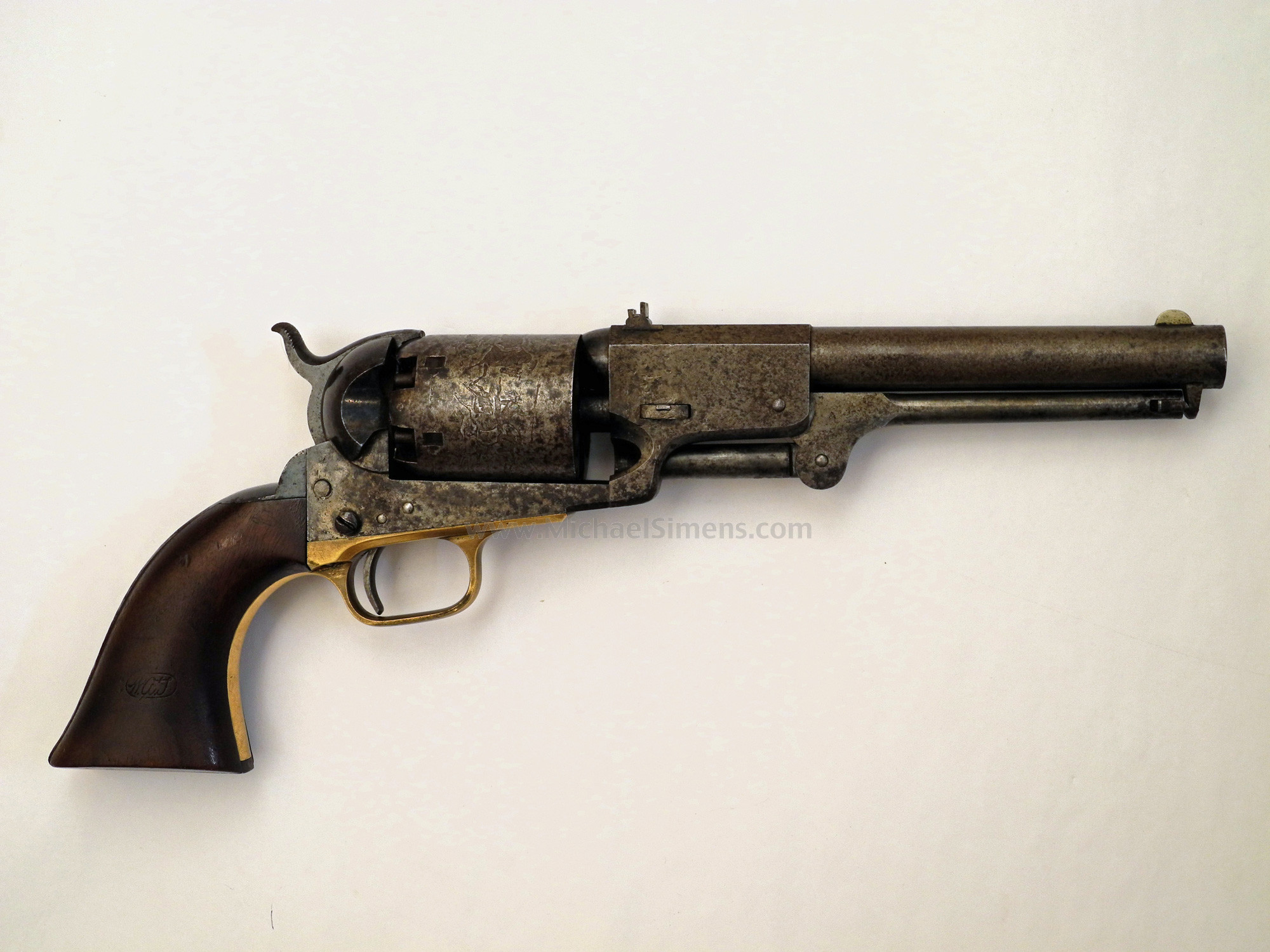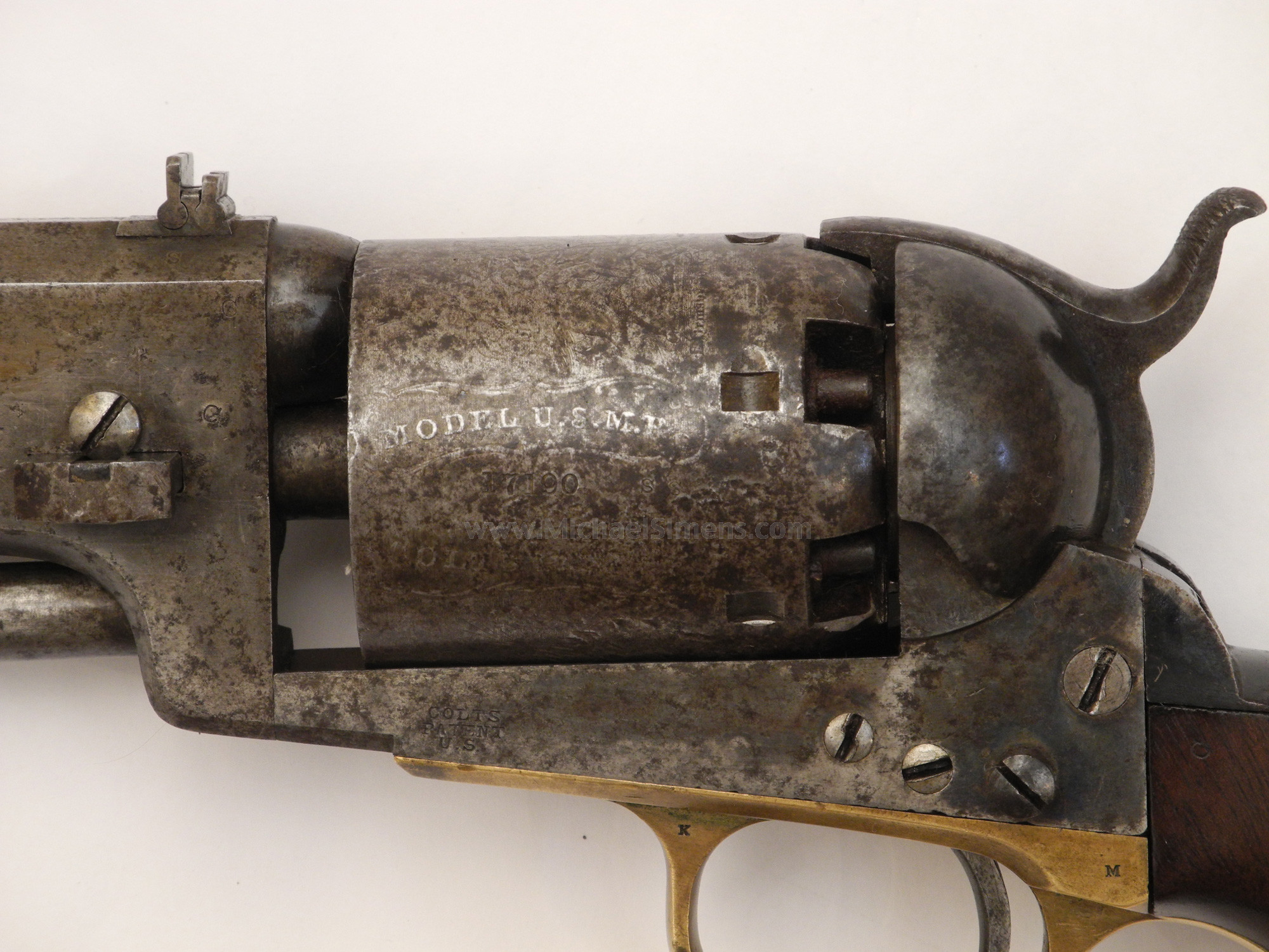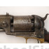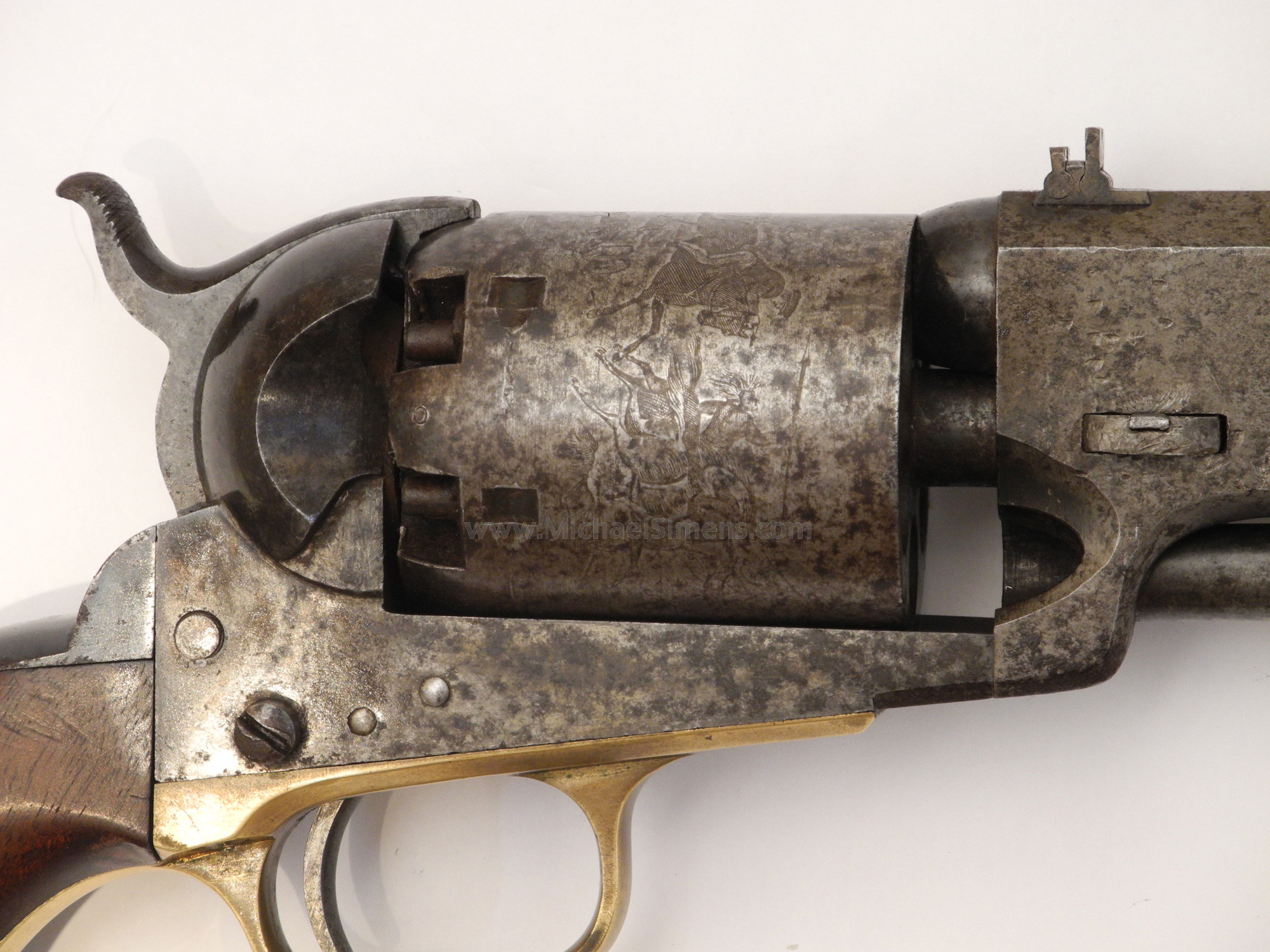 This is a very good to nearly fine condition Colt 3rd Model Dragoon for sale, with its original holster. A rare 4-screw, cut for stock variation, this gun is untouched and right out-of-the-woods and to my knowledge has never been in a collection. It came directly from a family that had cared for it since the Civil War but they had no documentation as to any ancestors that served. The gun is extremely sharp and crisp as can be evidenced by its excellent pair of grips (among the best you'll ever see) with great cartouches, traces of original blue on the barrel and a large blotch of bright original case colors on the left side of the frame. It also shows a lot of dense, military style blue on the top of the back-strap. The cylinder scene is deep and crisp with one area of slight roughness that obscures the latter half of the "Colts Patent" motif under the cylinder serial number. This gun shows very little use and was obviously stored in this, its original holster. This is probably why such a minty gun lost all of its finish, the humidity and temperature changes causing condensation inside the leather. Regardless, all markings, edges and action are excellent but it needs a hand and spring. The gun is in a grayish-brown patina with very small spots of brown staining (not pitted). It can possibly be cleaned to enhance its look, but I'll leave that up to the buyer. The holster is an original, pre-1865 holster that is supple, but dry and dusty with the side stitching needing repair. As most of you are aware, the 3rd Model 4-screw Dragoon is a rare variation and this one is fresh to the market, untouched and has a lot of condition.