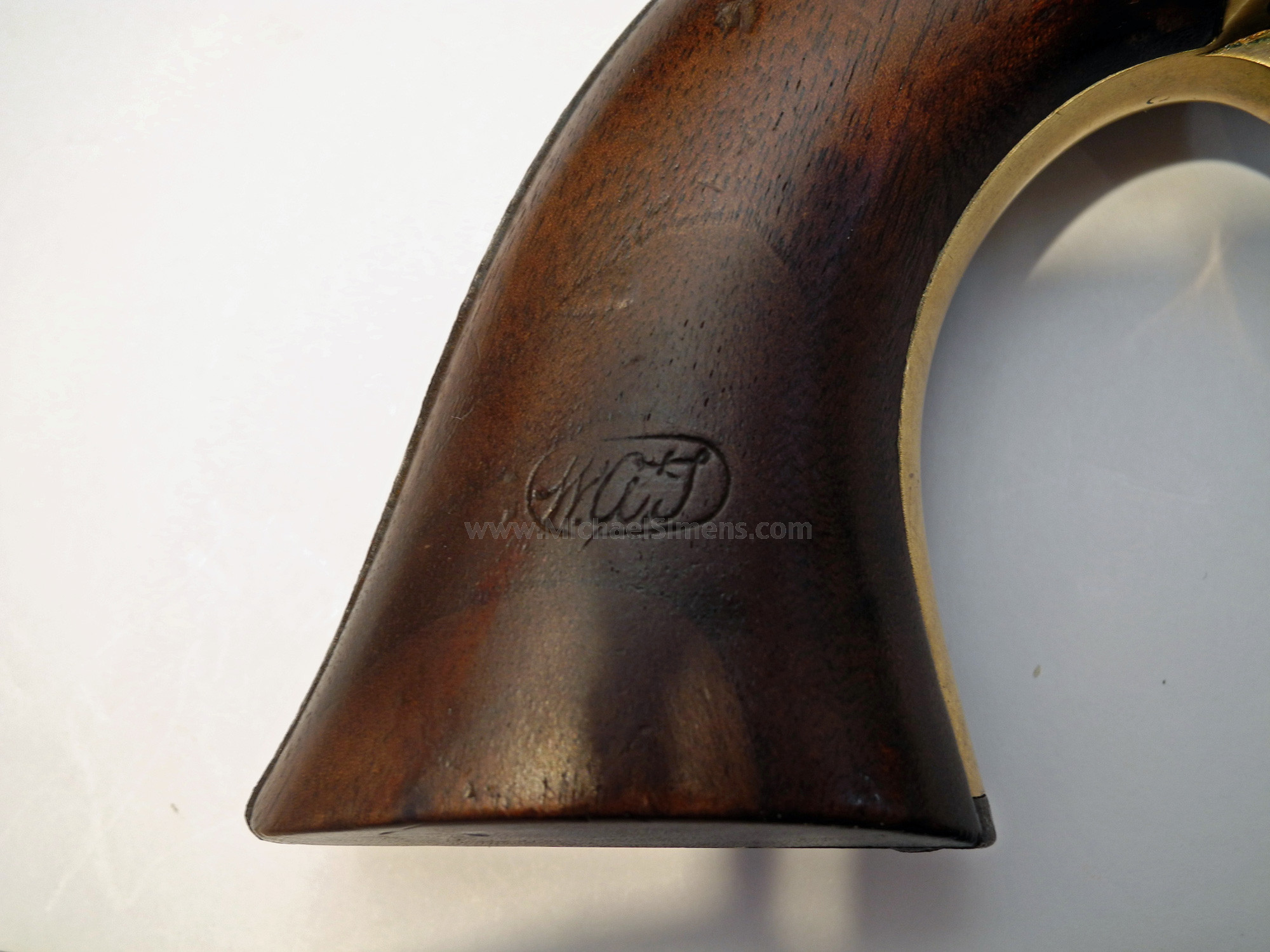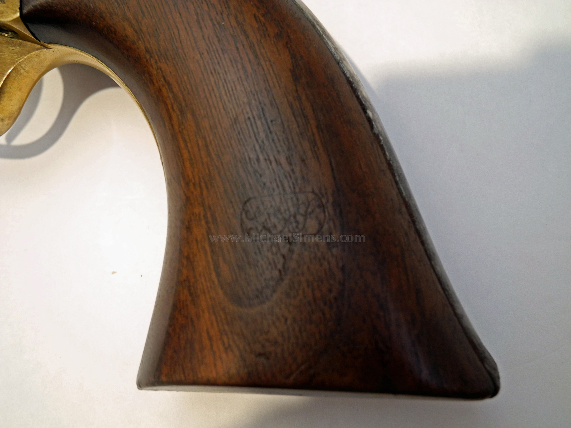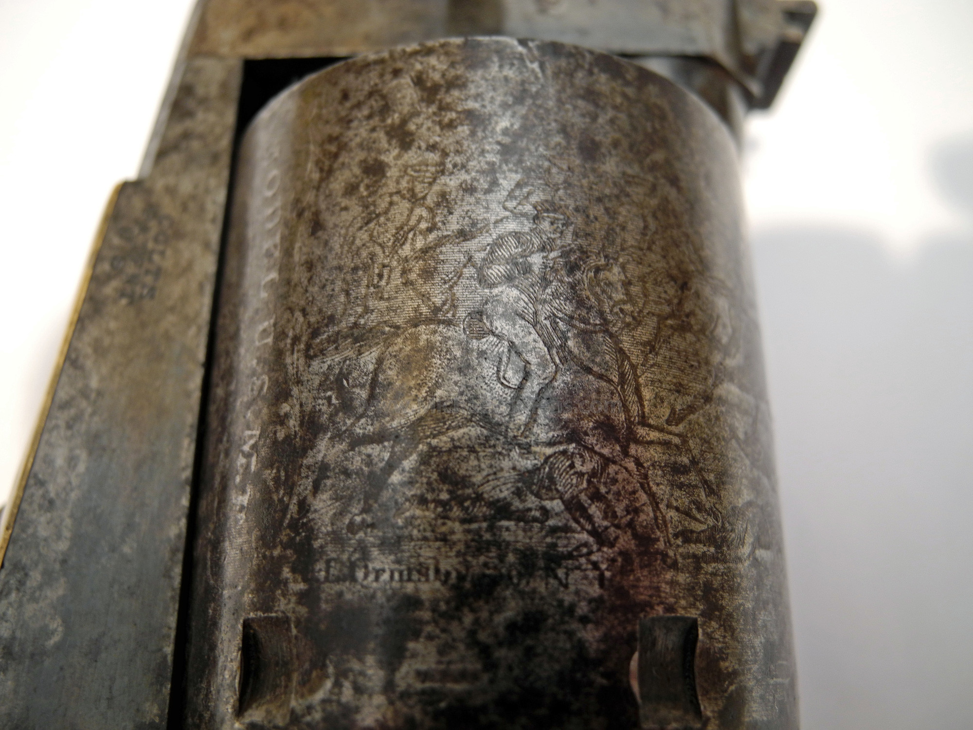 This is a very good to nearly fine condition Colt 3rd Model Dragoon for sale, with its original holster. A rare 4-screw, cut for stock variation, this gun is untouched and right out-of-the-woods and to my knowledge has never been in a collection. It came directly from a family that had cared for it since the Civil War but they had no documentation as to any ancestors that served. The gun is extremely sharp and crisp as can be evidenced by its excellent pair of grips (among the best you'll ever see) with great cartouches, traces of original blue on the barrel and a large blotch of bright original case colors on the left side of the frame. It also shows a lot of dense, military style blue on the top of the back-strap. The cylinder scene is deep and crisp with one area of slight roughness that obscures the latter half of the "Colts Patent" motif under the cylinder serial number. This gun shows very little use and was obviously stored in this, its original holster. This is probably why such a minty gun lost all of its finish, the humidity and temperature changes causing condensation inside the leather. Regardless, all markings, edges and action are excellent but it needs a hand and spring. The gun is in a grayish-brown patina with very small spots of brown staining (not pitted). It can possibly be cleaned to enhance its look, but I'll leave that up to the buyer. The holster is an original, pre-1865 holster that is supple, but dry and dusty with the side stitching needing repair. As most of you are aware, the 3rd Model 4-screw Dragoon is a rare variation and this one is fresh to the market, untouched and has a lot of condition.
