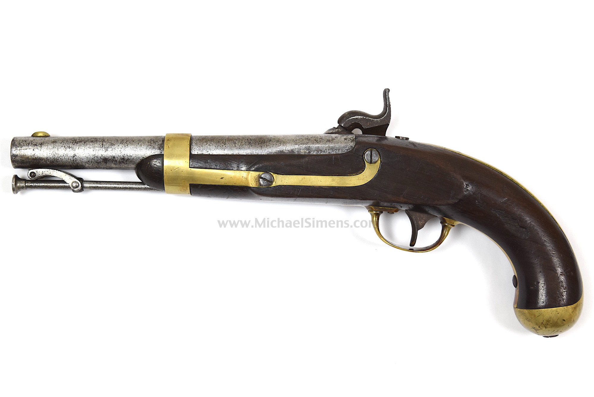 This is a very fine condition single shot pistol made at the Palmetto Armory in Columbia, South Carolina. This armory was founded in the early1850s by William Glaze to make and supply arms to South Carolina’s State Militia. The armory produced 1,000 pistols over a two year period and the guns were to be used by South Carolina Militia along with other weapons (swords, accouterments) produced by the Armory when needed. The arms and equipments stored in the arsenal were issued to South Carolina’s troops used throughout the Civil War. These pistols were patterned after the U.S. model 1842 pistol, having a .54 caliber smoothbore barrel stamped, " Wm Glaze & Co" on the left barrel flat. The breech is clearly stamped with a Palmetto tree and a “V”. The lock plate is stamped Columbia SC forward of the hammer and 1852 is stamped behind the hammer. This example is in very fine condition with extremely sharp and fine wood, save for a chip behind the left rear of the lock-plate. The action is sharp and crisp and the Wm. Glaze & Co, date and Palmetto Armory stamping are extremely crisp and deep. Over-all, this gun is in remarkably fine condition, as most of these saw heavy use. A nice candidate to add to a Confederate handgun collection at a modest price.
