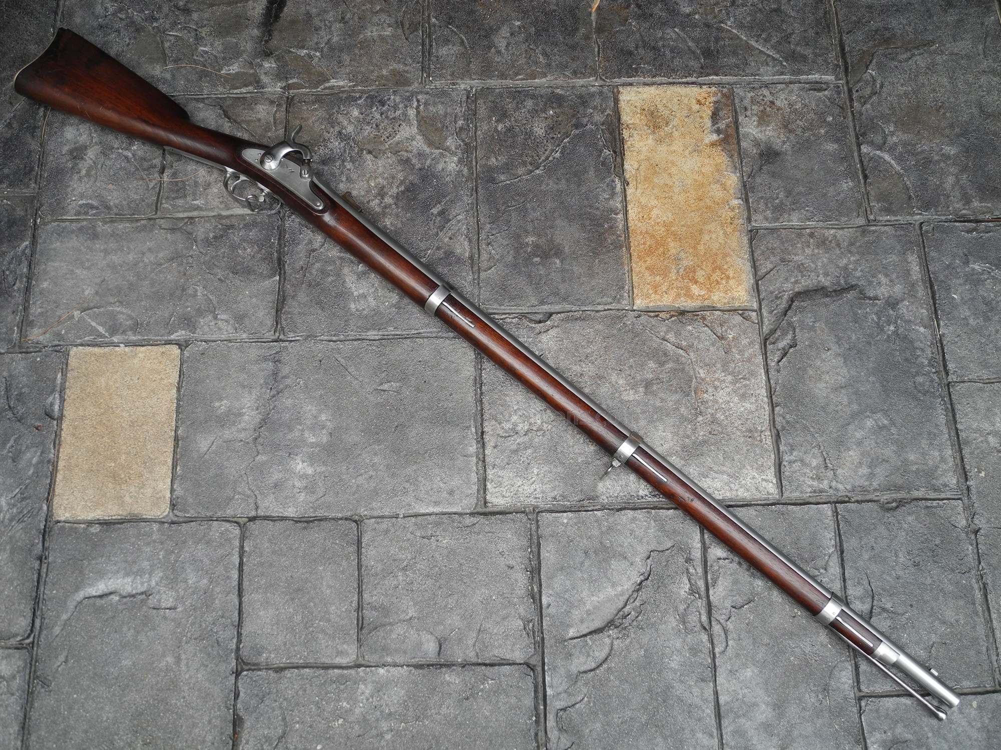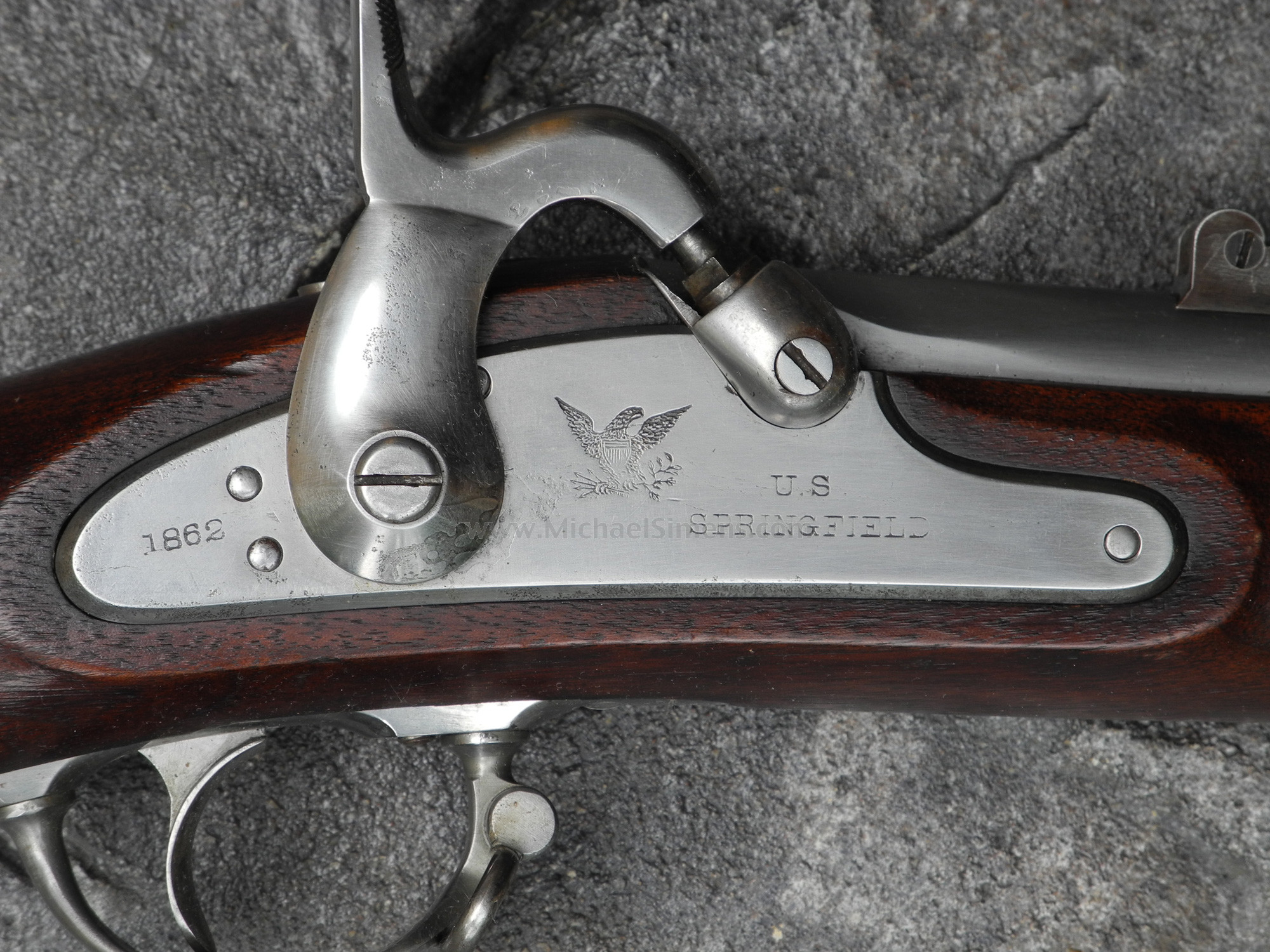 This is an extremely fine condition Model 1861 Springfield Rifle-Musket dated 1862 on barrel and lock-plate. The gun was obviously very tastefully cleaned at one time as evidenced by a few small areas of roughness, but it was done correctly. The fit and finish of all metal arts is about perfect. All markings edges and action are excellent to include 2 near perfect cartouches on an excellent condition stock. About 60 - 70% original blue on the rear sight.