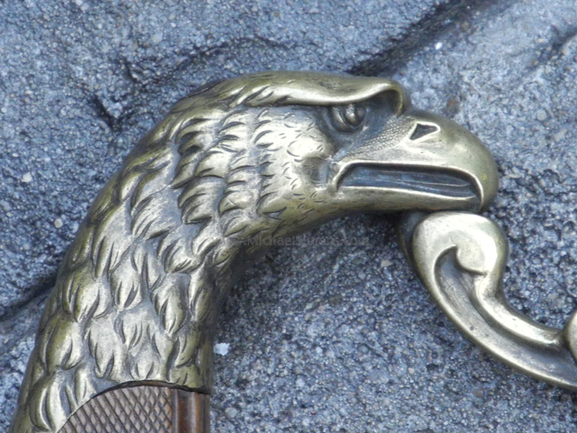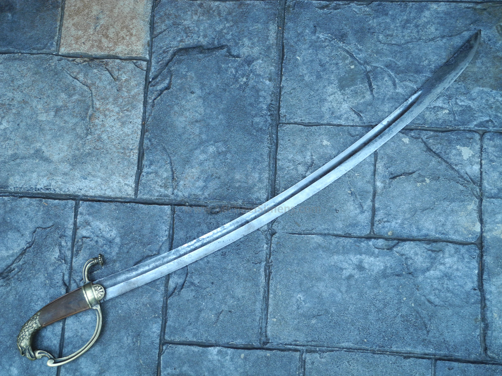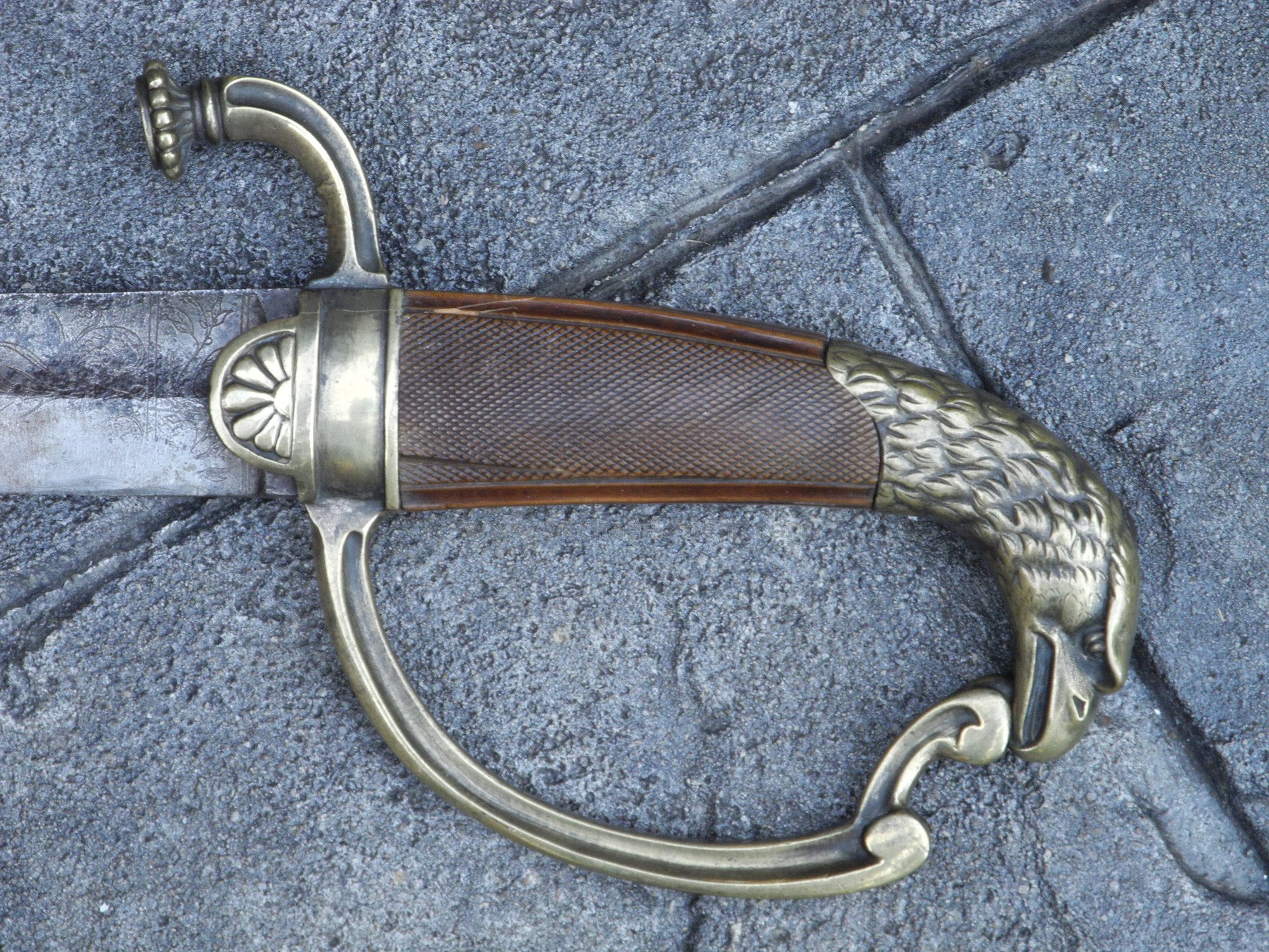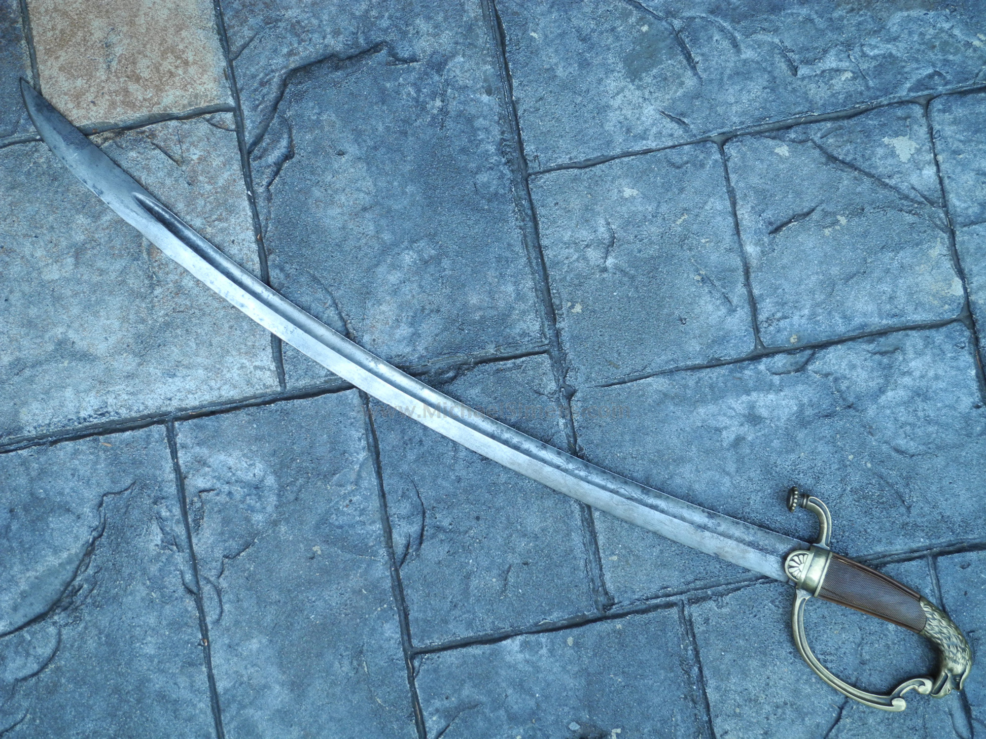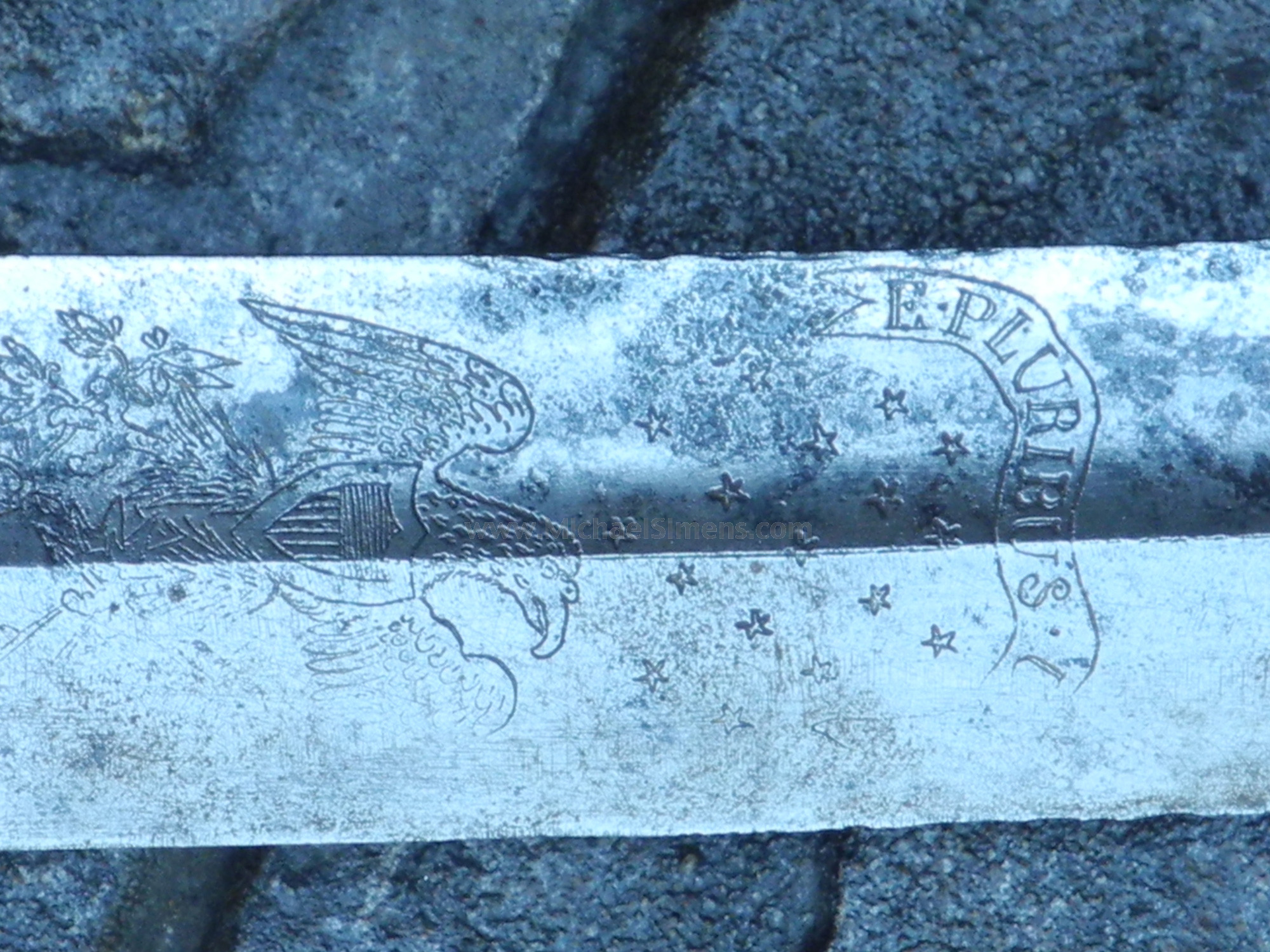 This is a good condition sword from the period 1800 - 1815. The blade shows use and weathering and has been cleaned at one time revealing some scattered light roughness at with the bold eagle head on the pommel, the blade shows an etched patriotic eagle and the mottos "E. Pluribus Unum" and "Honor and My Country". The wood or ebony grip (which looks like tortoise shell) is finely checkered and in great condition save for a few minor cracks. There is no scabbard but this is a nice representative example of work during the period that probably saw service in the War of 1812 and further into U.S. history.