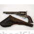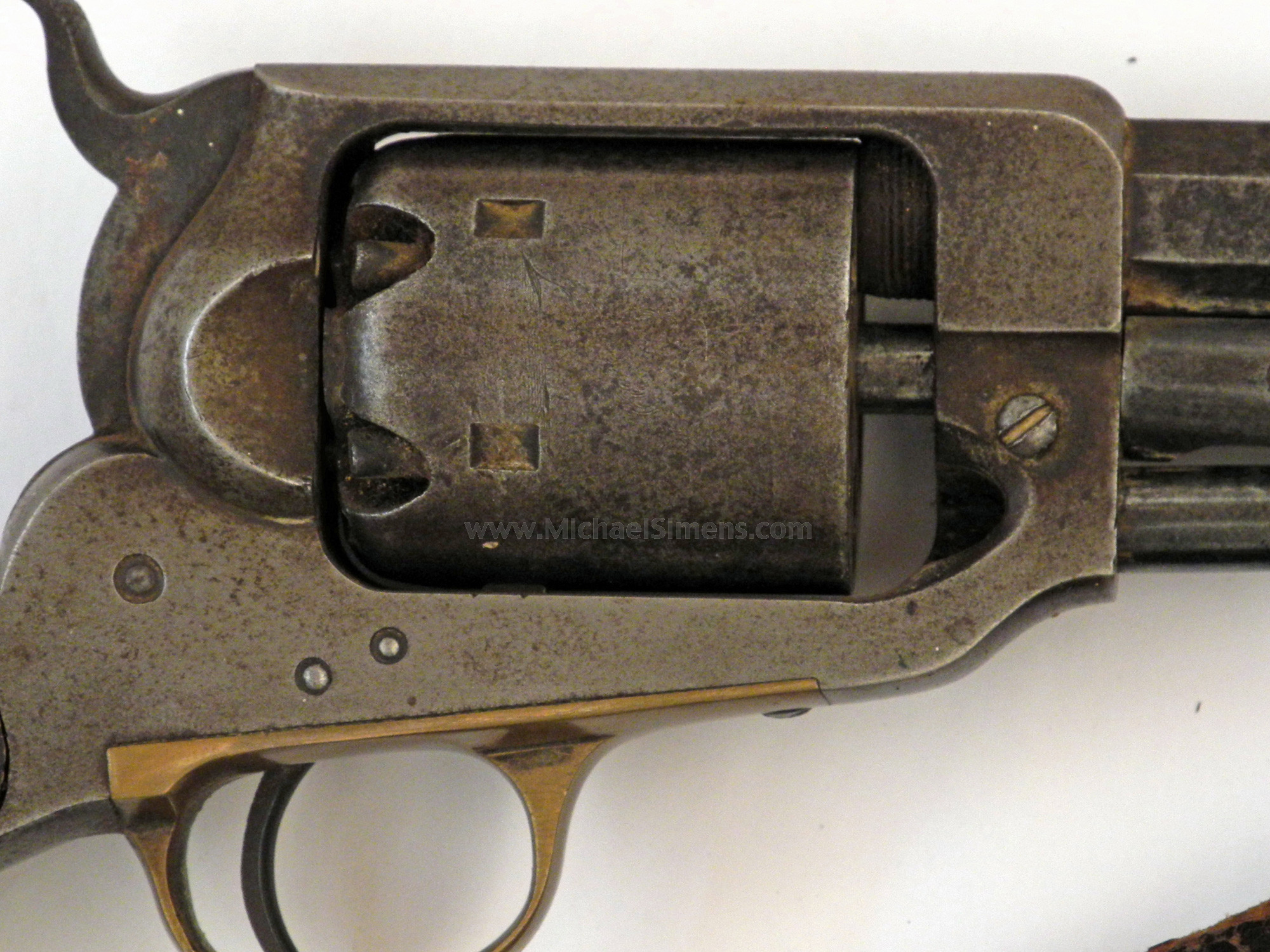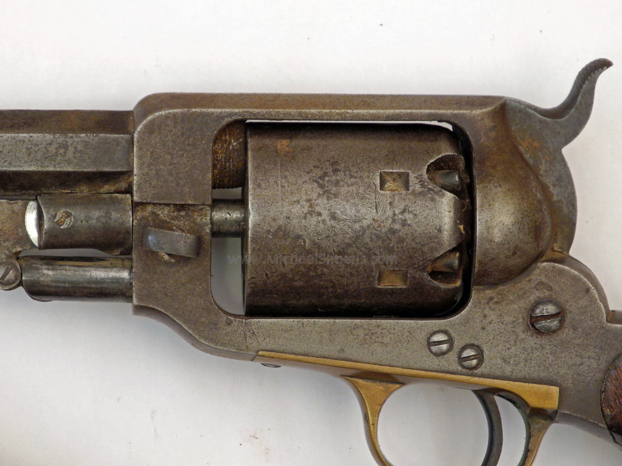Now here's a really nice find right out of the woods with great potential. This is an absolutely untouched Civil War era Whitney Navy Revolver. The nice thing about it is that it's filthy, but underneath the grit, grime and flash surface rust there lies a very, very good gun. Most of what looks like rust on the gun is actually dried grease. The rust that is present is very superficial and can be cleaned to a smooth surface. I don't see that there are many areas that would reveal pitting or roughness if done properly. The action, markings and edges are sharp and it comes with a decent holster that's been with it forever. The pictures are lousy but if you squint, you can see most of a light cylinder scene. The Whitney was one of the most popular handguns used in the Civil War by Northern and Southern Officers with Robert E. Lee known to have used one. It's not a diamond in the rough, but there's much room for honest improvement with a careful cleaning. It's way better than what you see offered at gun shows and auctions at the same price. The holster is worth $300, so the gun should be considered a bargain.