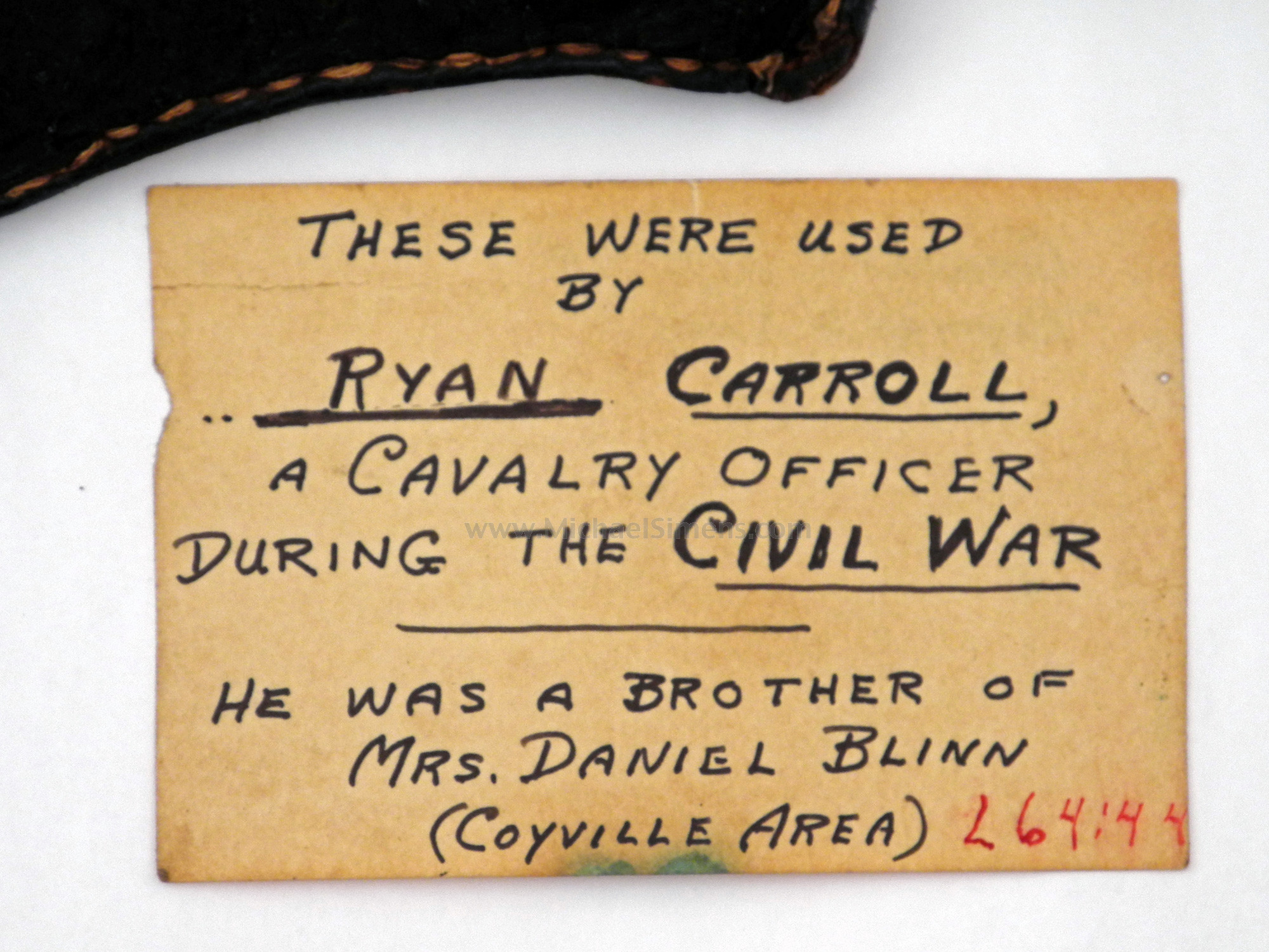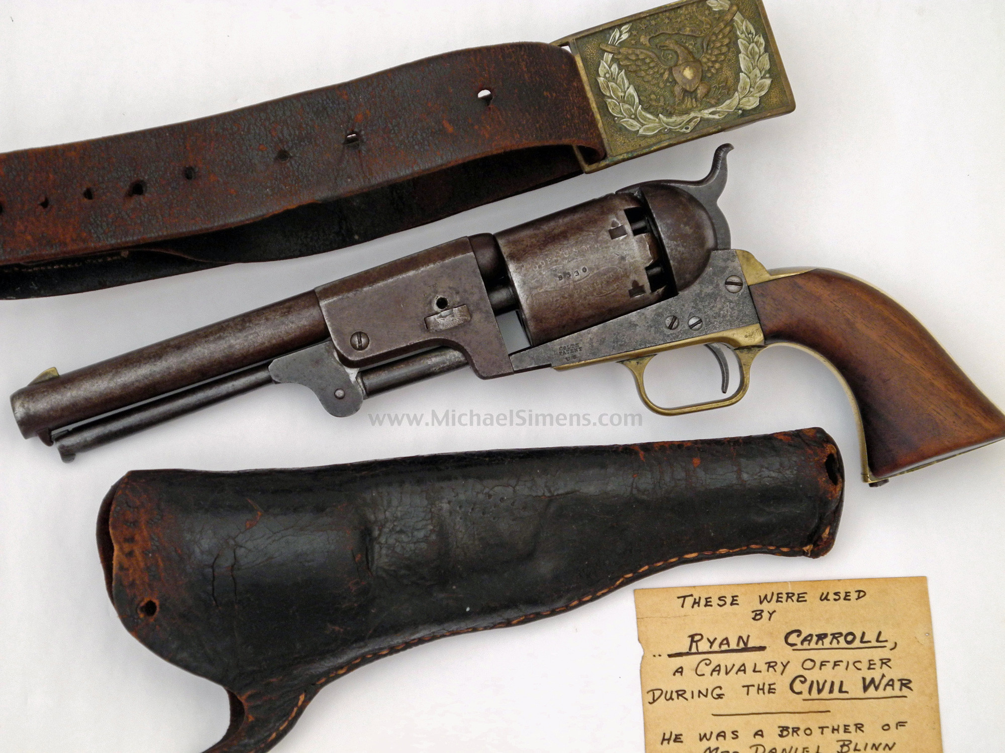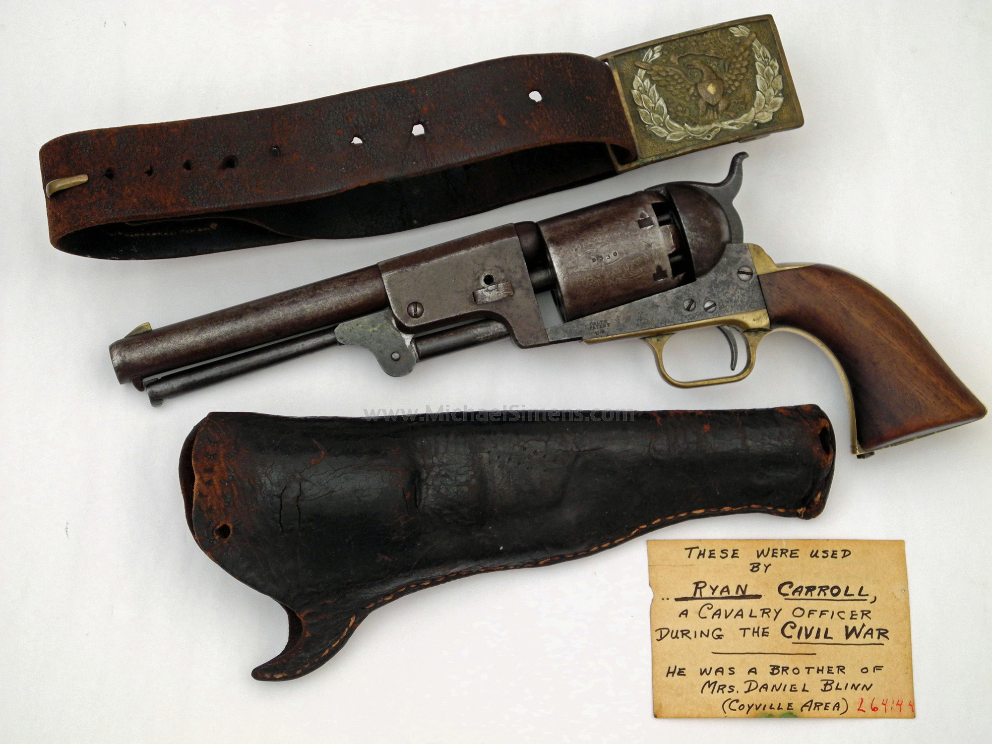 This third model Colt Dragoon is all matching except for the cylinder, which is in a second model serial range. This came to us from the direct descendants of Ryan Carroll, who was the brother-in-law of Daniel Blinn, the two names mentioned on the old ID card that is included with the gun, belt and holster. I had a researcher look the names up, but could not find Carroll in a Civil War Unit. Blinn was in the 126th New York. My researcher though the man could be Rollin Carroll, who served in the 8th Indiana Cavalry. I don't have a clue. I do know that it warrants further research. It's a good, solid Dragoon and the cylinder has most of its scene. Although faint, you can read the "MODEL U. S. M. R." and the "COLT'S PATENT" markings and see most of the characters. All other markings and the action are fine and the edges show some wear commensurate with having been carried and used. When you ad in the ID card, belt and holster, this is a bargain.