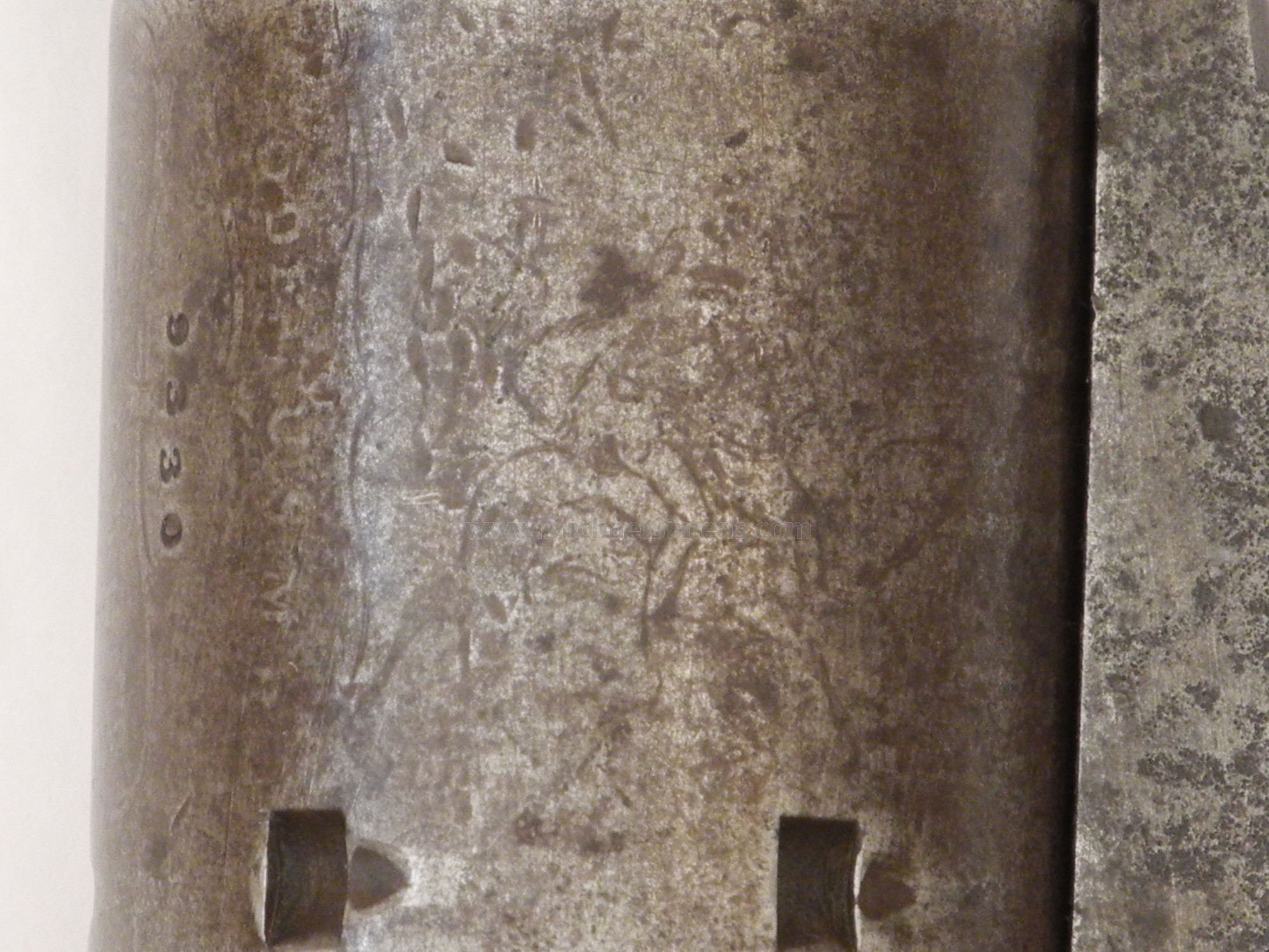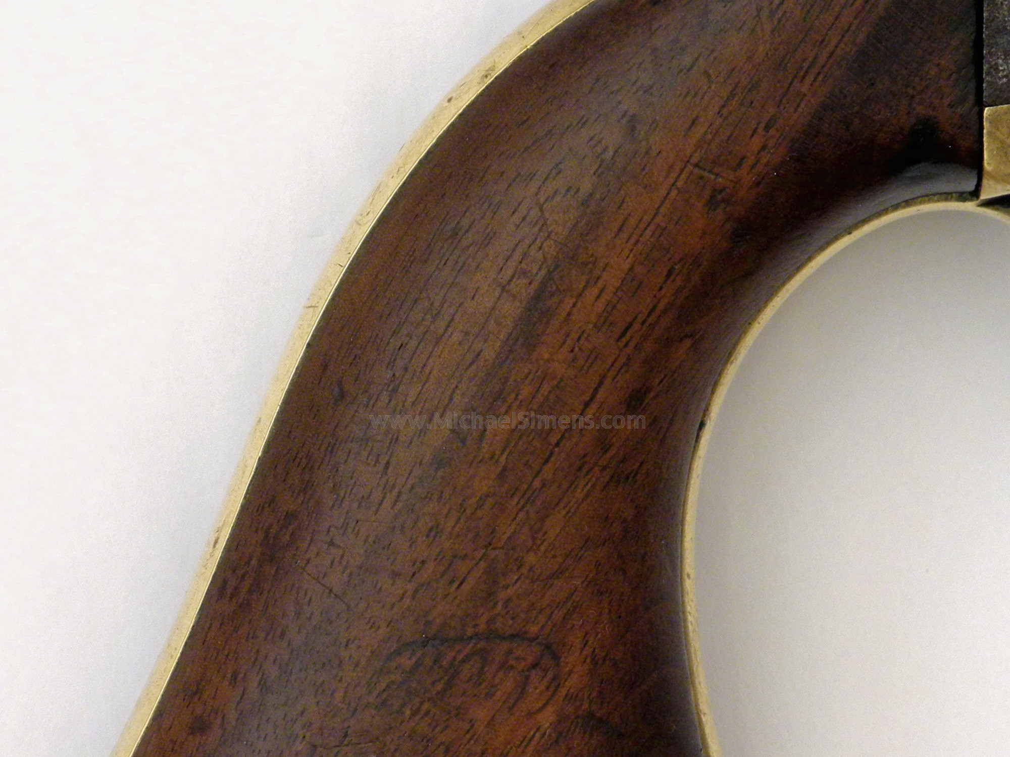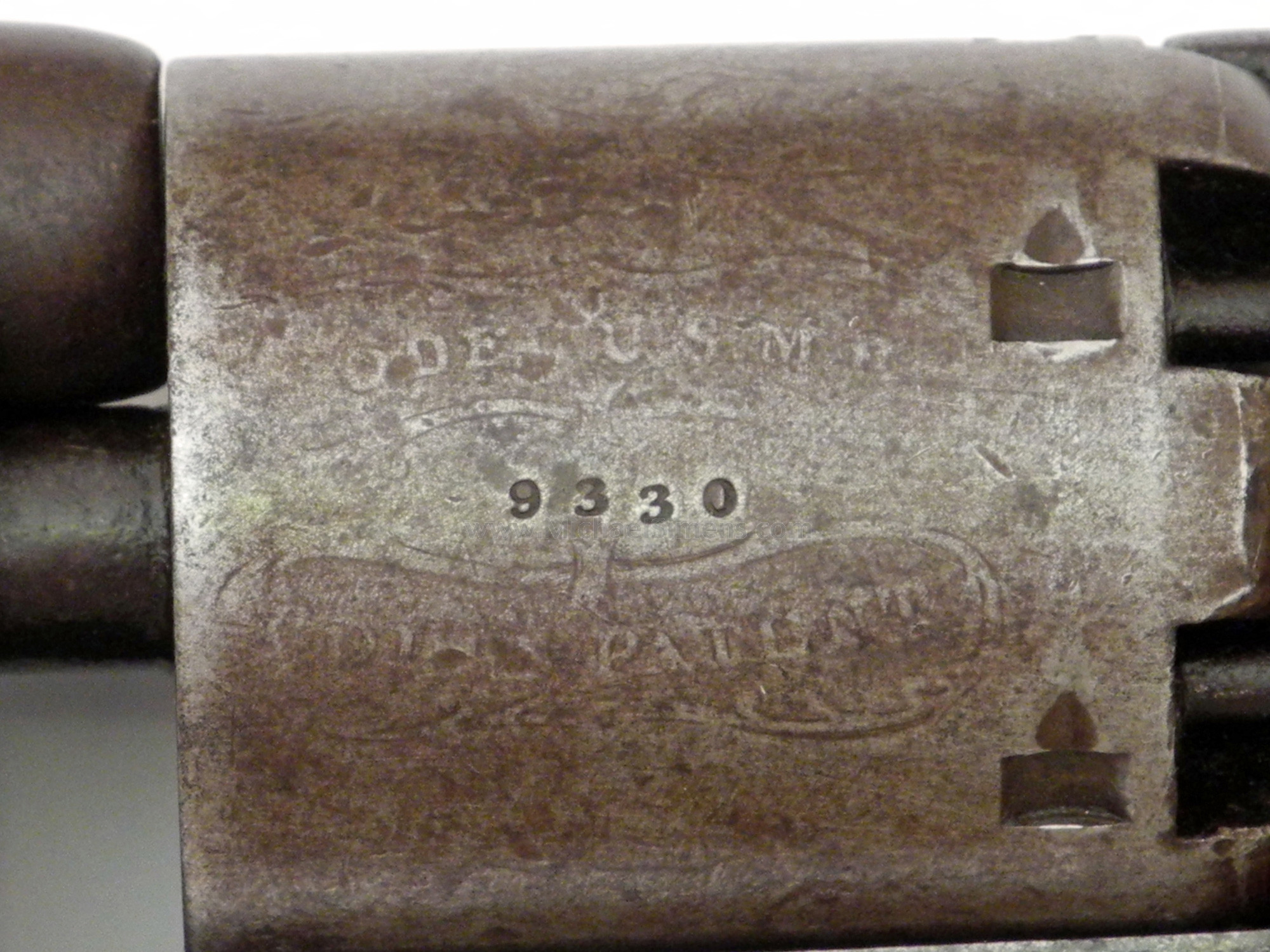 This third model Colt Dragoon is all matching except for the cylinder, which is in a second model serial range. This came to us from the direct descendants of Ryan Carroll, who was the brother-in-law of Daniel Blinn, the two names mentioned on the old ID card that is included with the gun, belt and holster. I had a researcher look the names up, but could not find Carroll in a Civil War Unit. Blinn was in the 126th New York. My researcher though the man could be Rollin Carroll, who served in the 8th Indiana Cavalry. I don't have a clue. I do know that it warrants further research. It's a good, solid Dragoon and the cylinder has most of its scene. Although faint, you can read the "MODEL U. S. M. R." and the "COLT'S PATENT" markings and see most of the characters. All other markings and the action are fine and the edges show some wear commensurate with having been carried and used. When you ad in the ID card, belt and holster, this is a bargain.