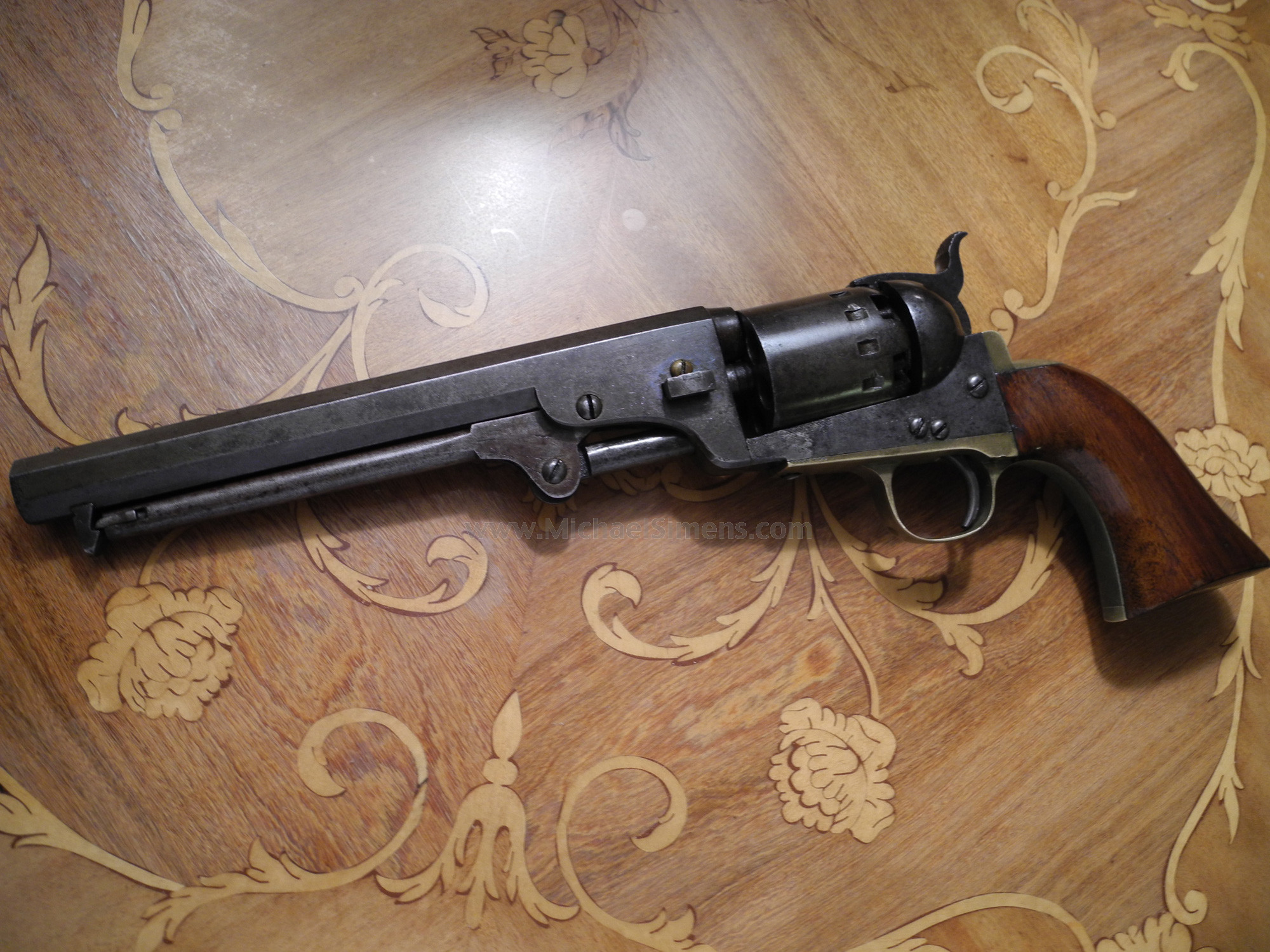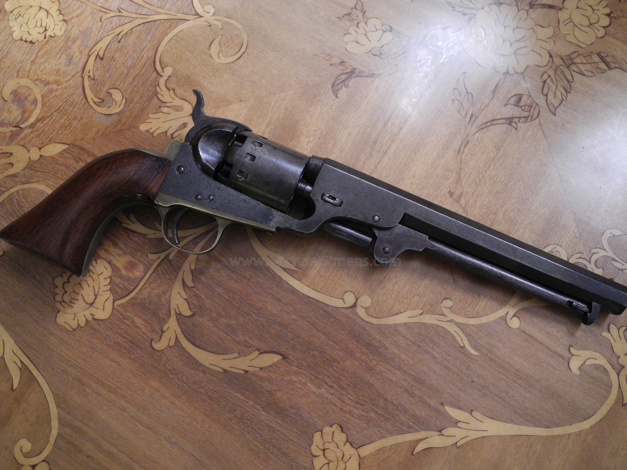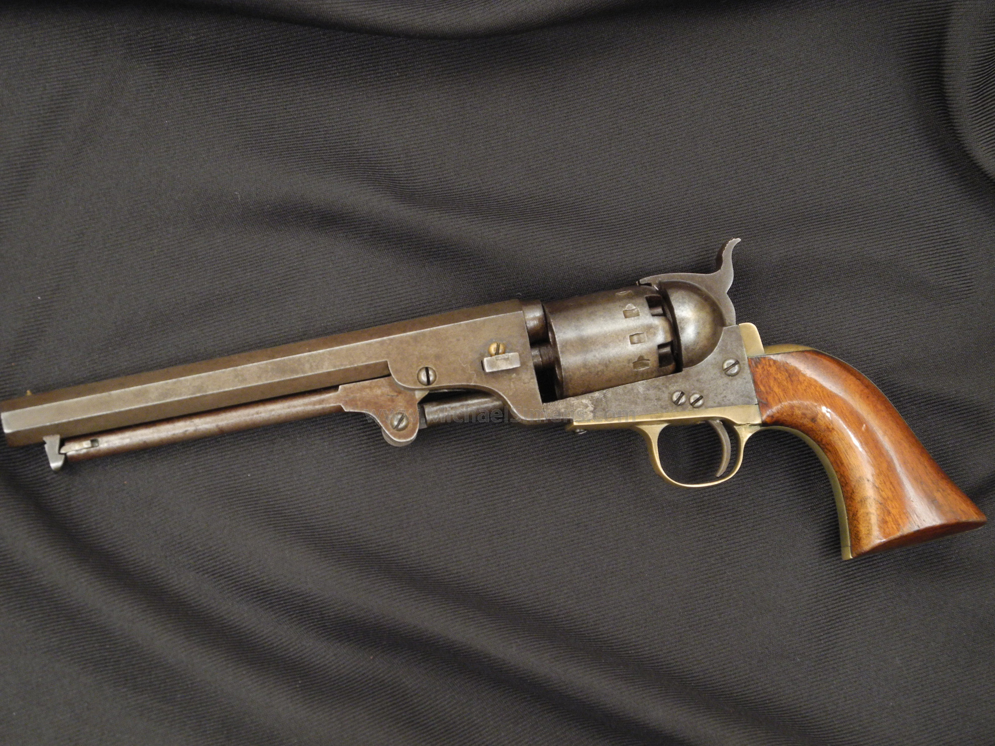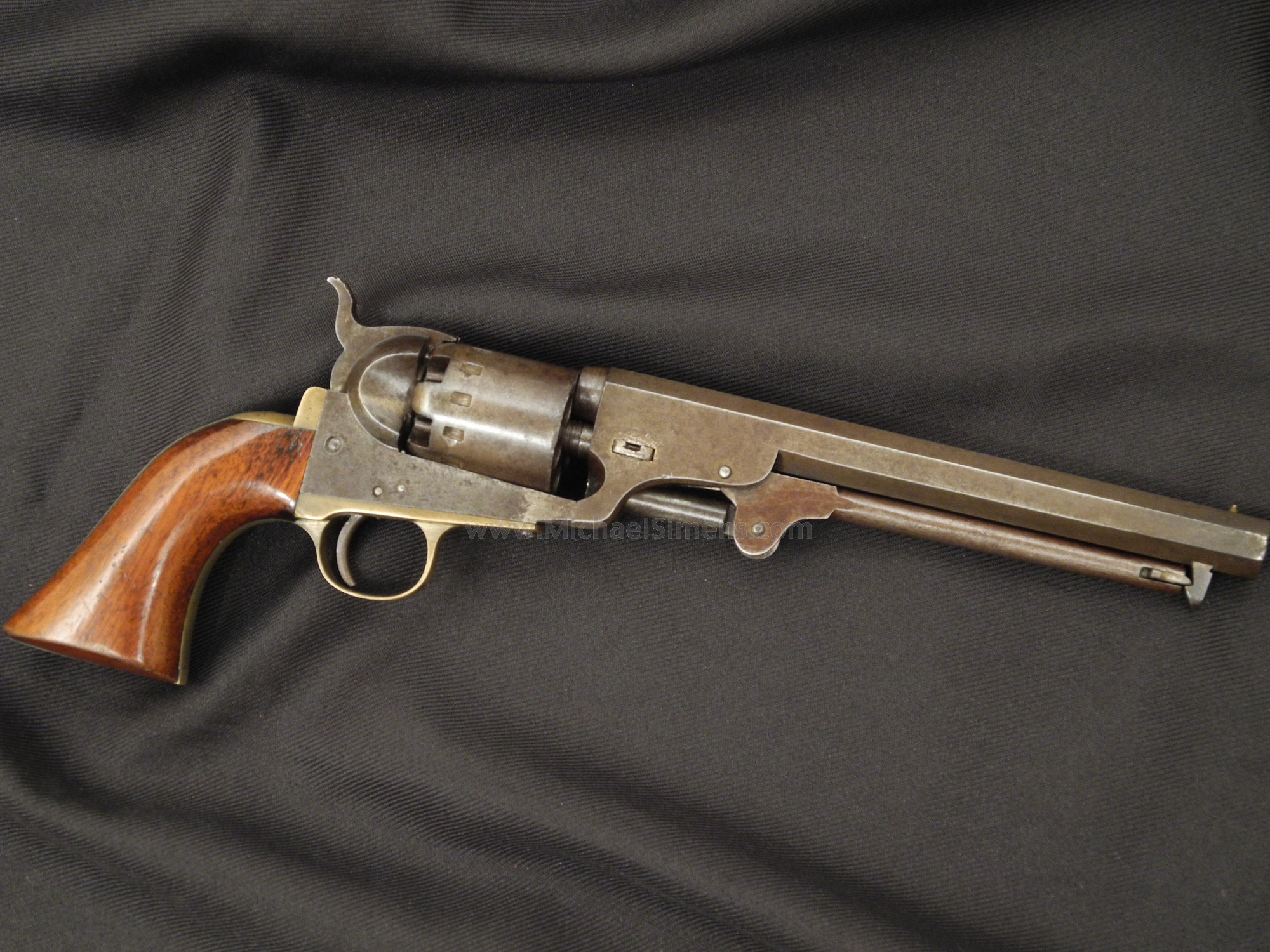 Without question, this is one of the most outstanding Confederate Revolvers ever offered for sale. This is an absolutely gorgeous 12-stop, Augusta Machine Works Revolver that has seen little, if any use. The markings, edges and action on this beautiful gun with 7 & 3/4" barrel are nearly flat perfect. The grips show 99% original finish and the metal parts on this gun have a stunning, untouched patina. There are traces of original blue on the barrel. Note the brass wedge screw that I believe to be original, that contrasts with the blue hue. The gun is in dark, untouched brown patina and I have taken photos of the gun on both a light and a dark background so that you can see the color and texture of the metal properly. I picked up this gun in central Pennsylvania with a couple of Patersons and a very good Confederate Dance Revolver (Dragoon Size) along with some other goodies. I found a more common six-stop just a few weeks later. As I researched these guns, I found one with a ton of finish that had sold in an East Coast Auction for over $90,000 in 1993 with holster and unquestionable provenance direct from the family descendants of Lieutenant Colonel Roswell Russell of the 9th Pennsylvania Cavalry. After finding that the heaviest action the 9th ever saw was the Battle of Griswoldville during Sherman's famous "March to the Sea", the eventual landing places of the guns became clear to me. The Russell gun and this 12-stop were discovered in the Harrisburg, Pa. area, and the 6-stop on this website came from York, only 20 miles away. It was found at a garage sale and was thought by the owner to be a reproduction. All 3 guns, 20 miles apart from each other. During my reading, I learned that just a few days prior to the battle, word went out to all nearby towns (including Augusta) that the Union was on their way to destroy all the Military Works at Griswoldville. The local Militias and worker citizens from all the nearby towns converged on Griswoldville to help in their defense, but the Union forces were too much for what was primarily an army of citizen soldiers. It is clear to me that the eventual overwhelming victory of the 9th resulted in their troopers carrying home these guns as war trophies. Somebody should write a story about it. The 6-stop revolver I have is priced much lower than this gun. I love this classic 12-stop as it almost speaks to me and I don't mind keeping it. In a recent auction on the West Coast, some eye-popping prices were garnered for lesser guns. If you are a person of means and want the very best, this could be a candidate to add to your collection. It is unquestionably one of the best Confederate Arms ever found and sometimes such a chance to own is a once in a lifetime event.