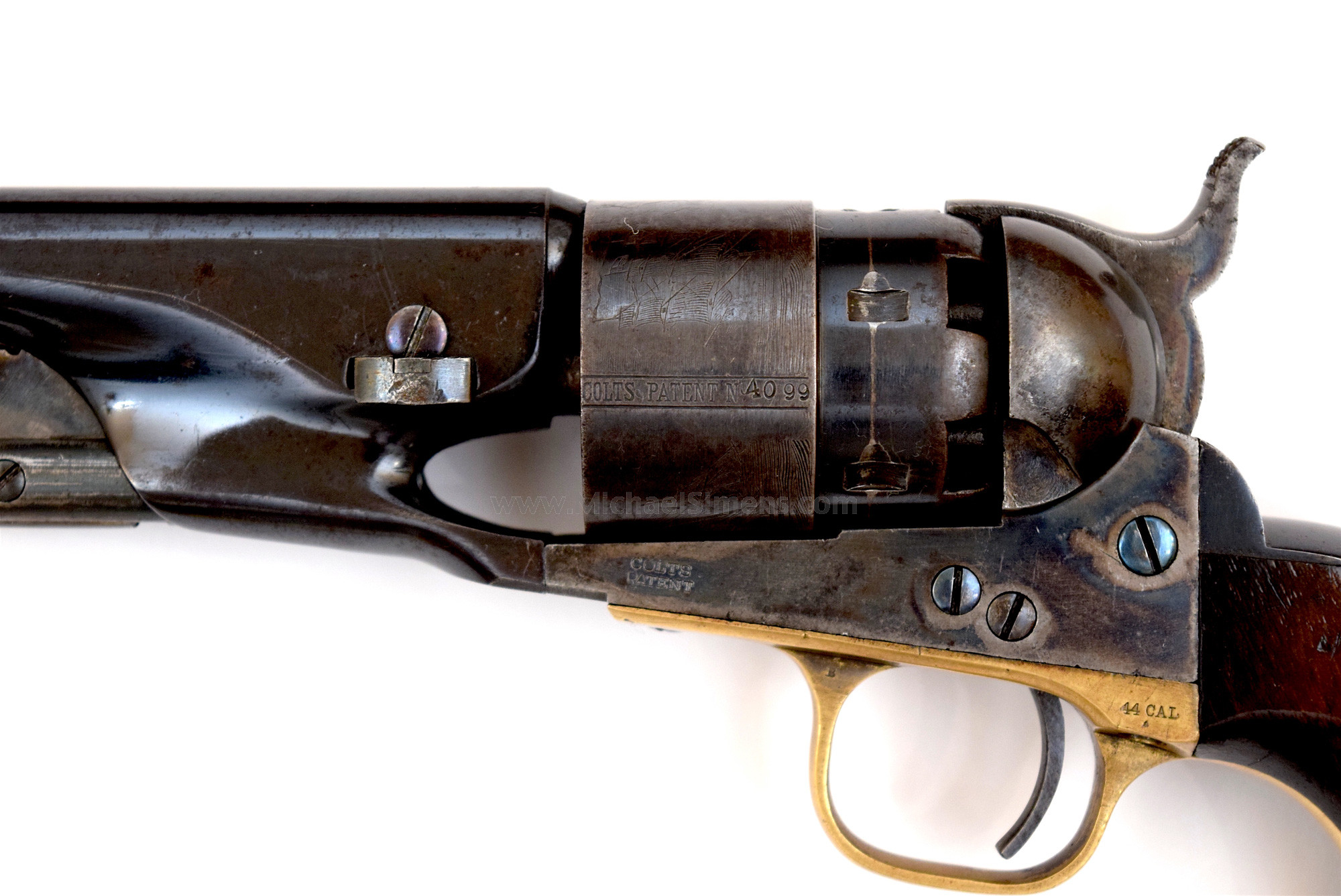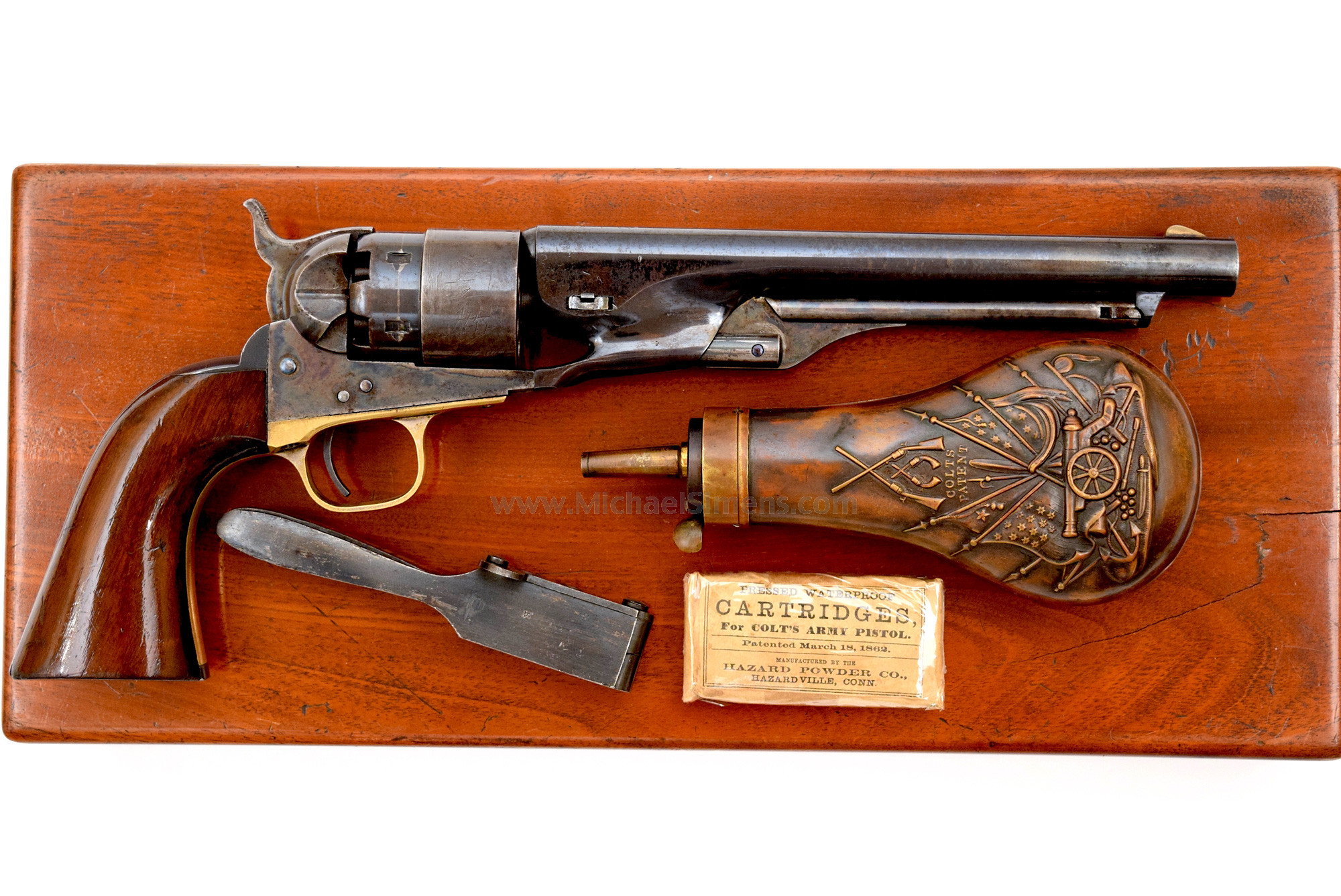 This is a very fine Colt 1860 Army Revolver in an original Colt casing to include all original accessories. The gun shows 85 - 90% original blue to its barrel, 80% blue to the rebate portion of its cylinder and perhaps 70% thin blue over the top of its cylinder scene. The framed, loading lever and hammer retain most all of their vivid case colors and grips show 97% original varnish with minor handling marks. The flask is in fine condition retaining about 20% lacquer and the other accessories are excellent. The box is extremely fine, but does have a stress crack to the lid, not an unusual feature.