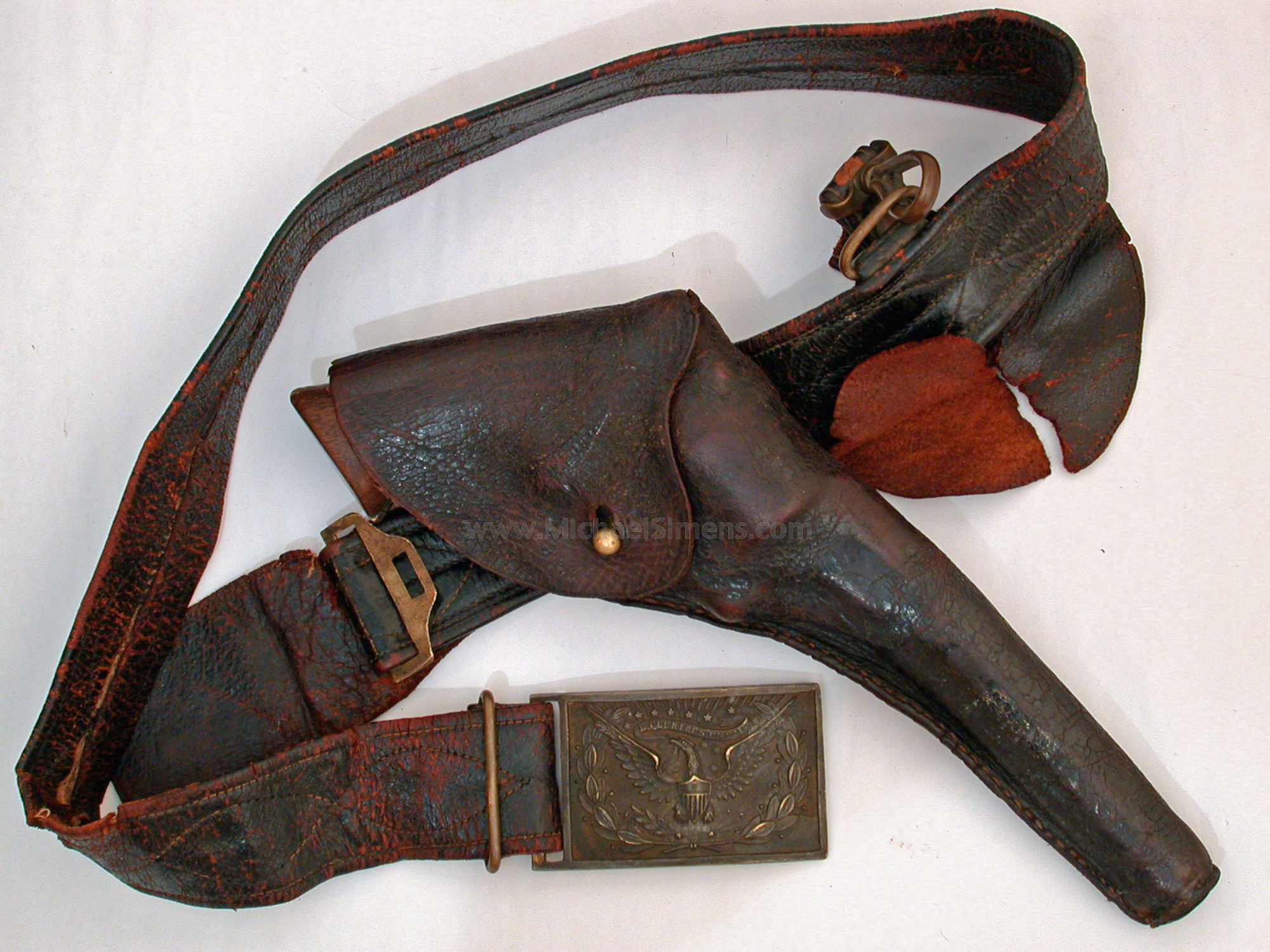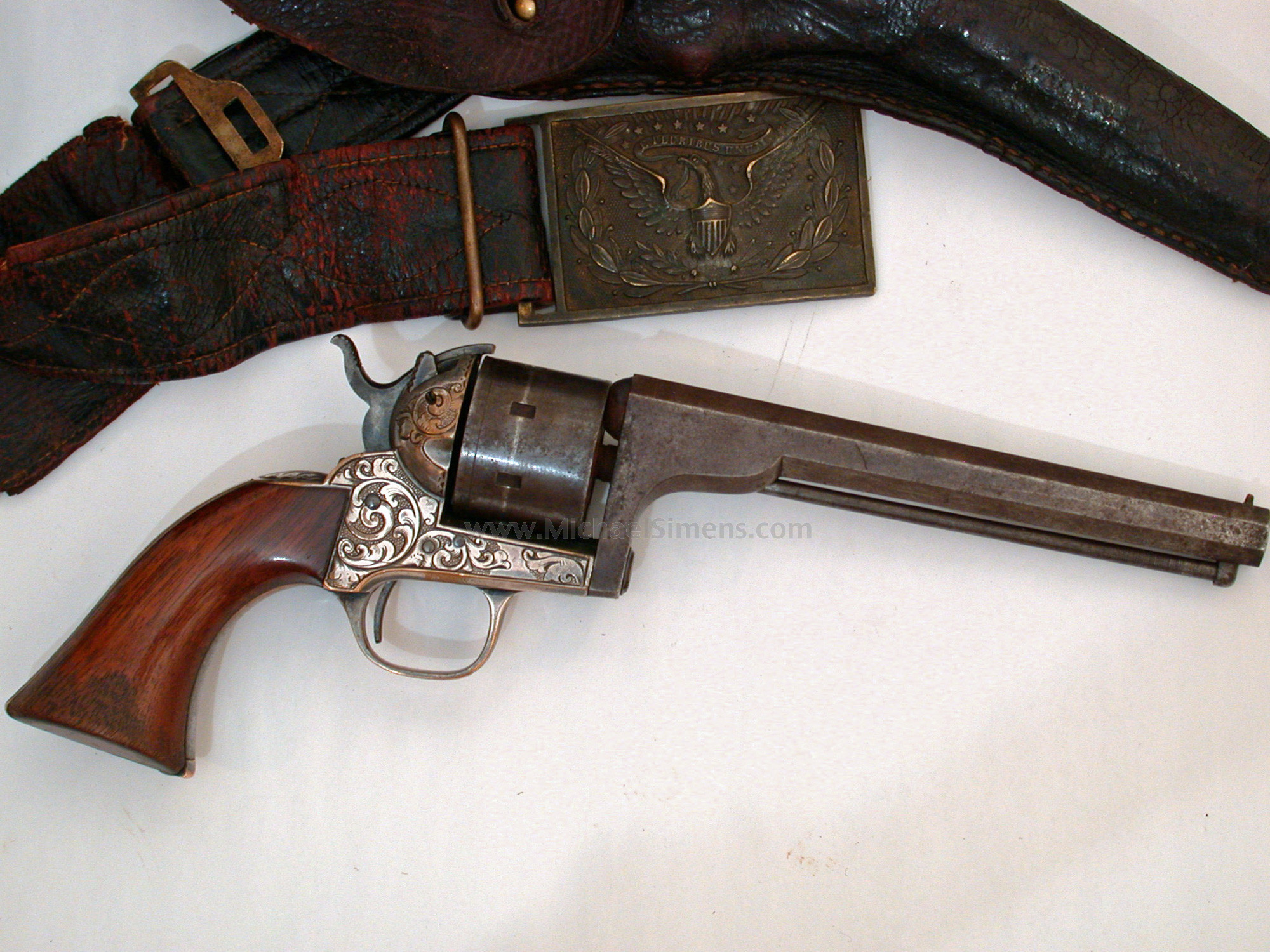 This is a very good to fine condition Moore Revolver manufactured in Brooklyn, NY. It is accompanied with its original Civil War Officer's belt and holster, both stamped "B. Kittredge & Co. Cinci,, Ohio", the well-known arms dealer that sold large quantities of Colt Revolvers and Henry Rifles during the Civil War. The gun is in fine condition showing scattered bluing on the barrel and 70 - 80% on the cylinder. The frame shows 80 - 85% original silver plate and the grips retain 80%+ original varnish. The belt and holster are in good condition but show use and age. Kittredge markings are weak but easily discernible. The back-strap is inscribed "Capt. A. Z. Blodgett" who served with the 96th Illinois Infantry from the fall of 1862 - August of 1864. Captain Aziel Z. Blodgett and the 96th did not receive its baptism of blood until 1863 on the