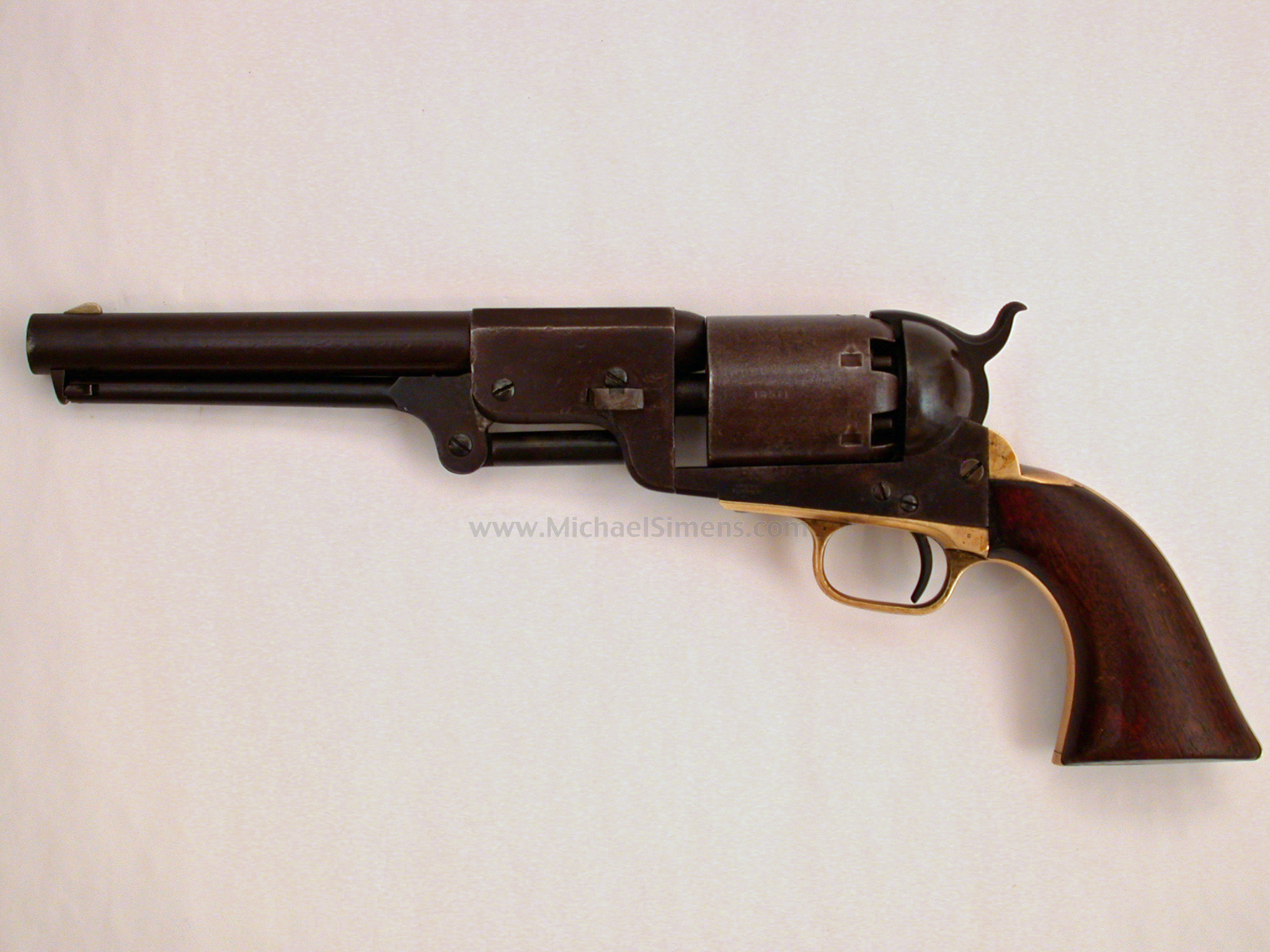 Most of you know about these rare guns. This is a Colt 3rd Model Dragoon with rare 8' barrel and this fine Dragoon saw service with a crack Confederate Mounted Unit called "The C. L. Dragoons", or Crocheron Light Dragoons, named after their material equiptment supplier and backer, John Crocheron. After initially mustering in to guard the port city of Mobile, this unit became Halloway's Company of the 3rd Alabama Cavalry and rendered escort and courier for Braxton Bragg, Joseph E. Johnson and John Bell Hood. The history of these rare revolvers was brought to light in the January 1991 issue of "The Gun Report Magazine". This example is one of the best in a deep smooth brown patina on its metal parts, 30% original varnish on fine full grips and about 70% light cylinder scene. It would be hard to improve upon this example.