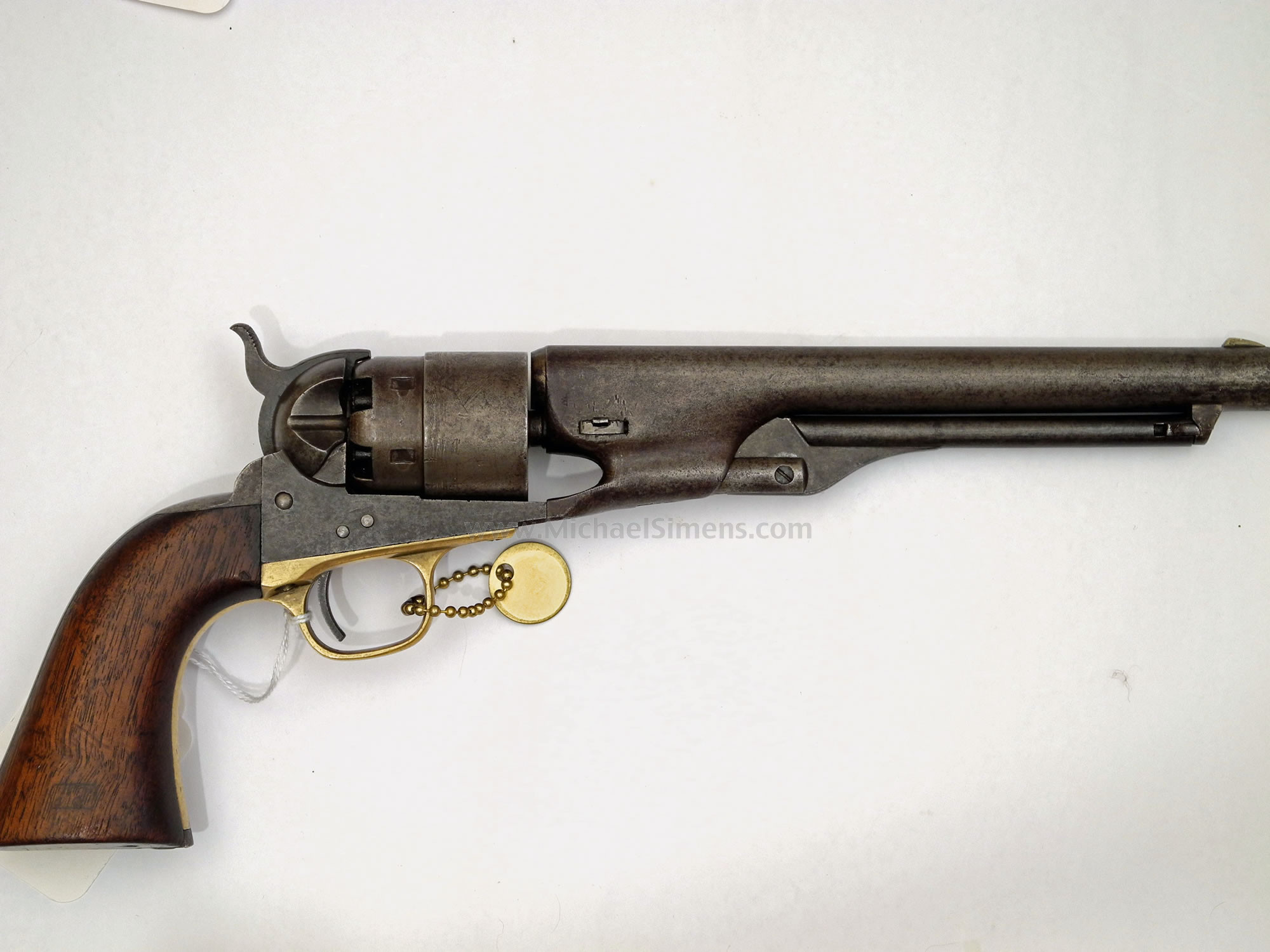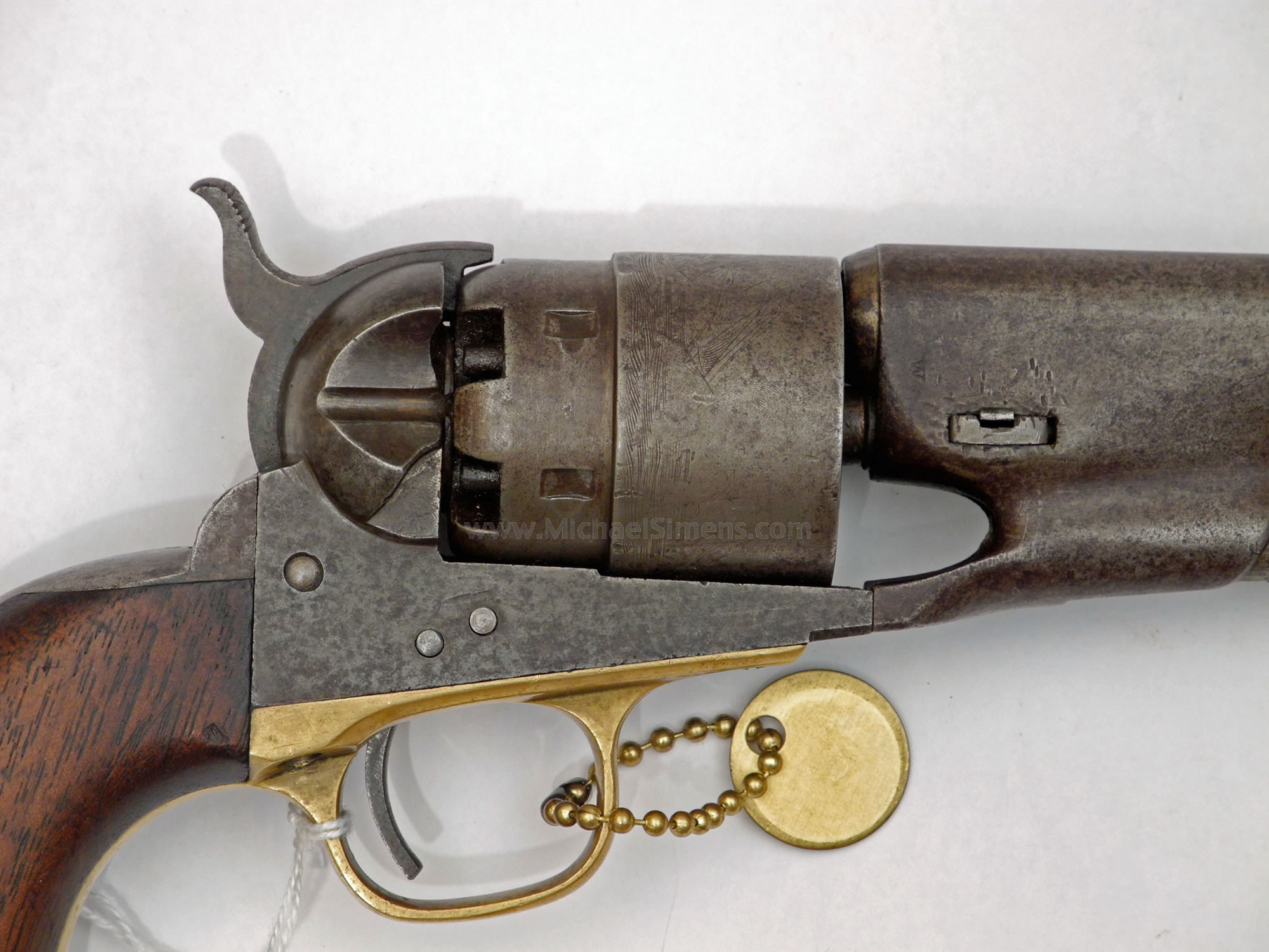 Sharp and crisp Civil War Army Revolver. Colt 1860 Army Revolvers like these are getting more difficult to find these days. This is a nice gun straight from a small collection we recently purchased. It shows very strong markings, edges, action, address, sub-inspectors marks and most of its cylinder scene. It is an untouched gun as issued during the Civil War. It is in a nice light brown to medium gray patina overall.