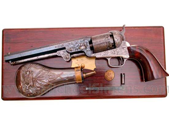 ONE OF THE RAREST OF ALL COLT INSCRIPTIONS WITH BUT A HANDFUL KNOWN TO EXIST as presented, "MAJOR GENERAL THOMAS GUYER by THE COLT GUARD". Buried in a collection for many many years, this fine Navy is worthy of the finest museum or personal collection. Guyer was commander of all Connecticut Militia, and specifically directed appointments of many of his States officers during the Civil War. Excellent condition Colt Navy Flask, Colt Navy Mold, Colt Navy Skin Cartridges and other accessories in it's original Colt Navy Revolver Case.