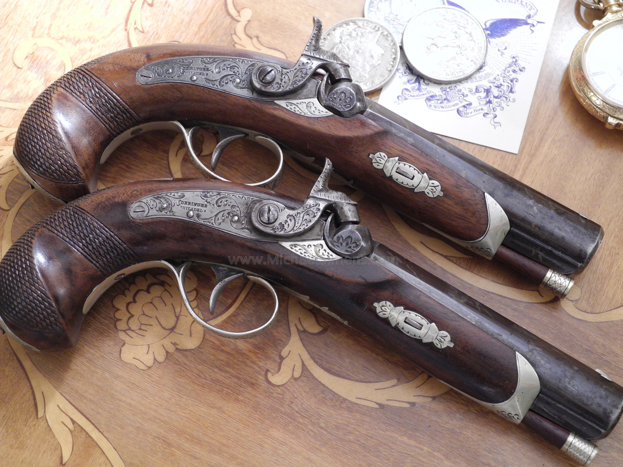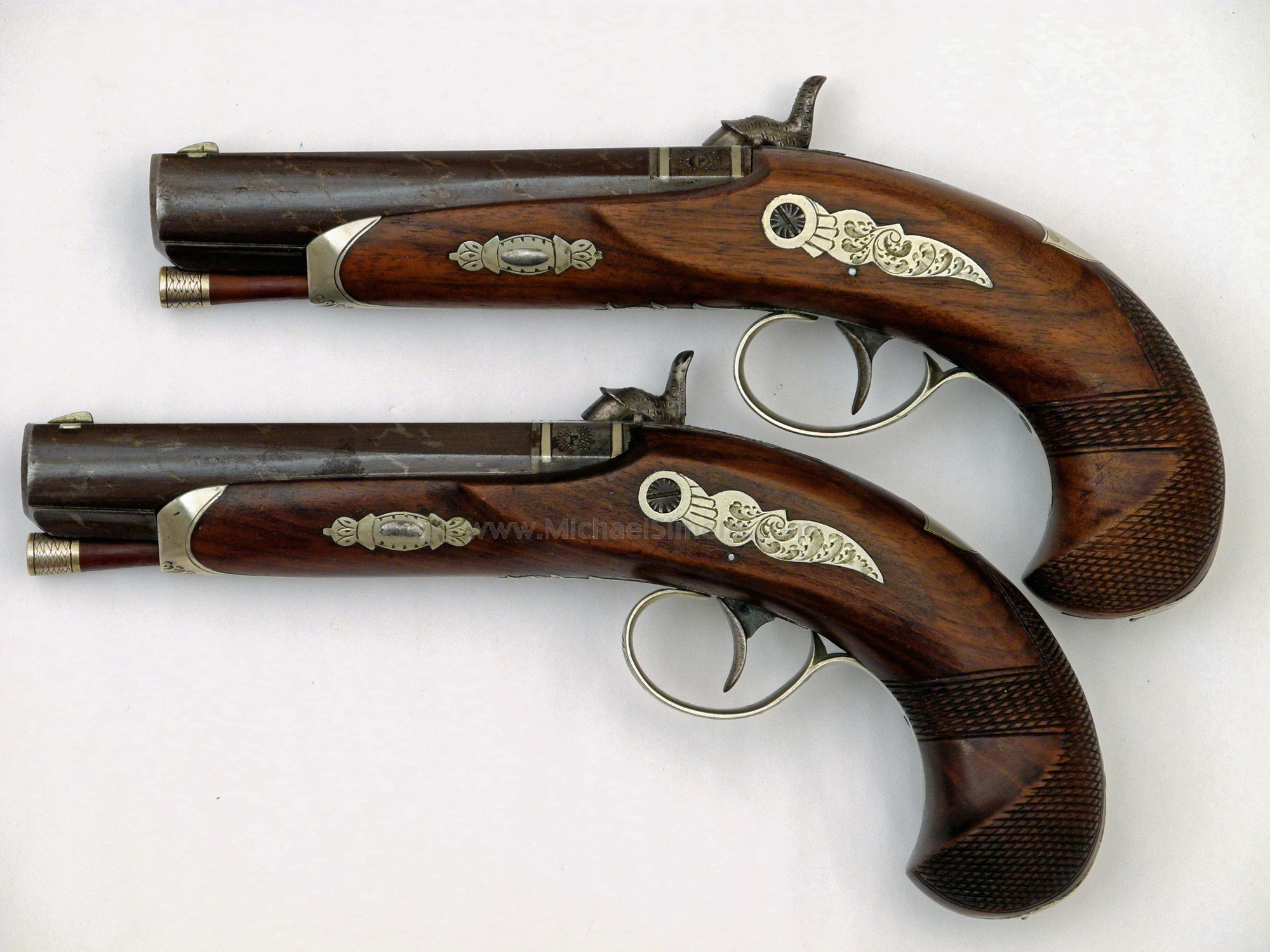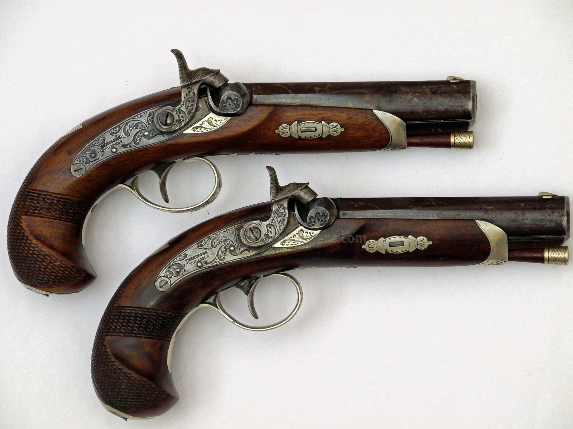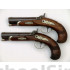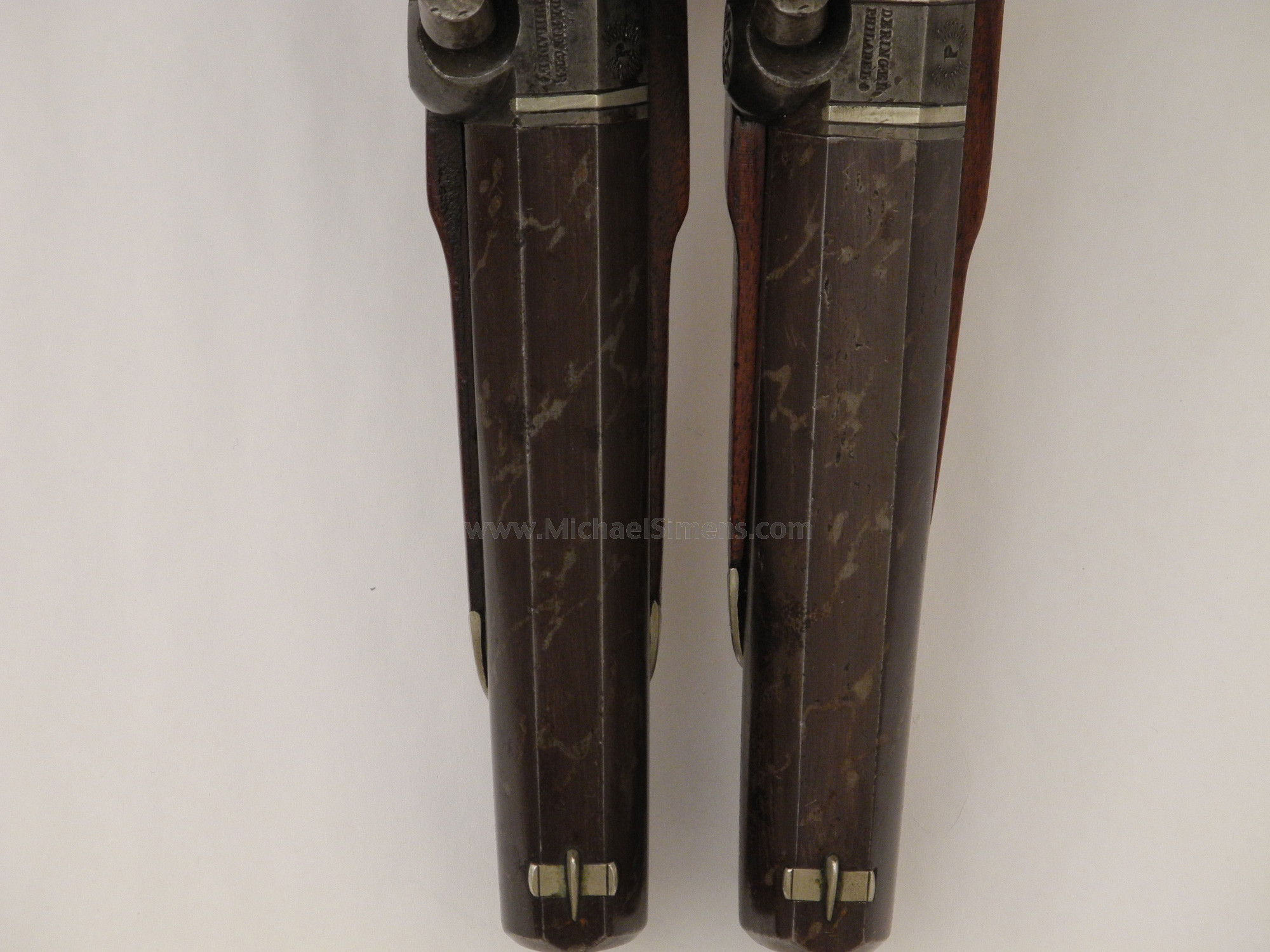 This is a wonderful and extremely rare matching pair of Henry Deringer Belt Pistols. Note,,,, I said Belt Pistols, as these are over 9" long over-all with 5-inch barrels. They are in very fine to extremely fine condition with one retaining 95% of its original striping and the other 85 - 90%. There is only the slightest hint of staining in a few areas that could probably be cleaned to raise their condition to near excellent. There are slight traces of the rare copper streaks within the striping. The wood on both guns is in excellent condition with much of the piano varnish finish wearing thin, with the grips finely checkered. All mounts of German Silver are engraved and the barrels are silver-banded. Both guns have a German silver trap-door compartment to store percussion caps in the butt. I have been told by the old timers that all Henry Deringers had the simulated damascus striping with copper streaked in them that no one has ever been able to duplicate. Also that when one finds a plain browned barrel, chances are it just shows a patinaed finish or has actually been re-browned. I don't know if this is true as I have a motto I go by, and that is "ALL THE EXPERTS ARE DEAD". If you weren't there when it was manufactured, you don't know for certain. What I do know is that the finish on these gun barrels is original and the combination of high finish, mount features and size make this an extremely desirable matched set of Henrys. One of them has some of the original copper streaking showing clear as a bell when you pop off the barrels. These guns are extremely rare and about the size of a 5 or 6-inch Colt Pocket, but thicker and heavier. They are a great set of guns in a rare and unusual size.