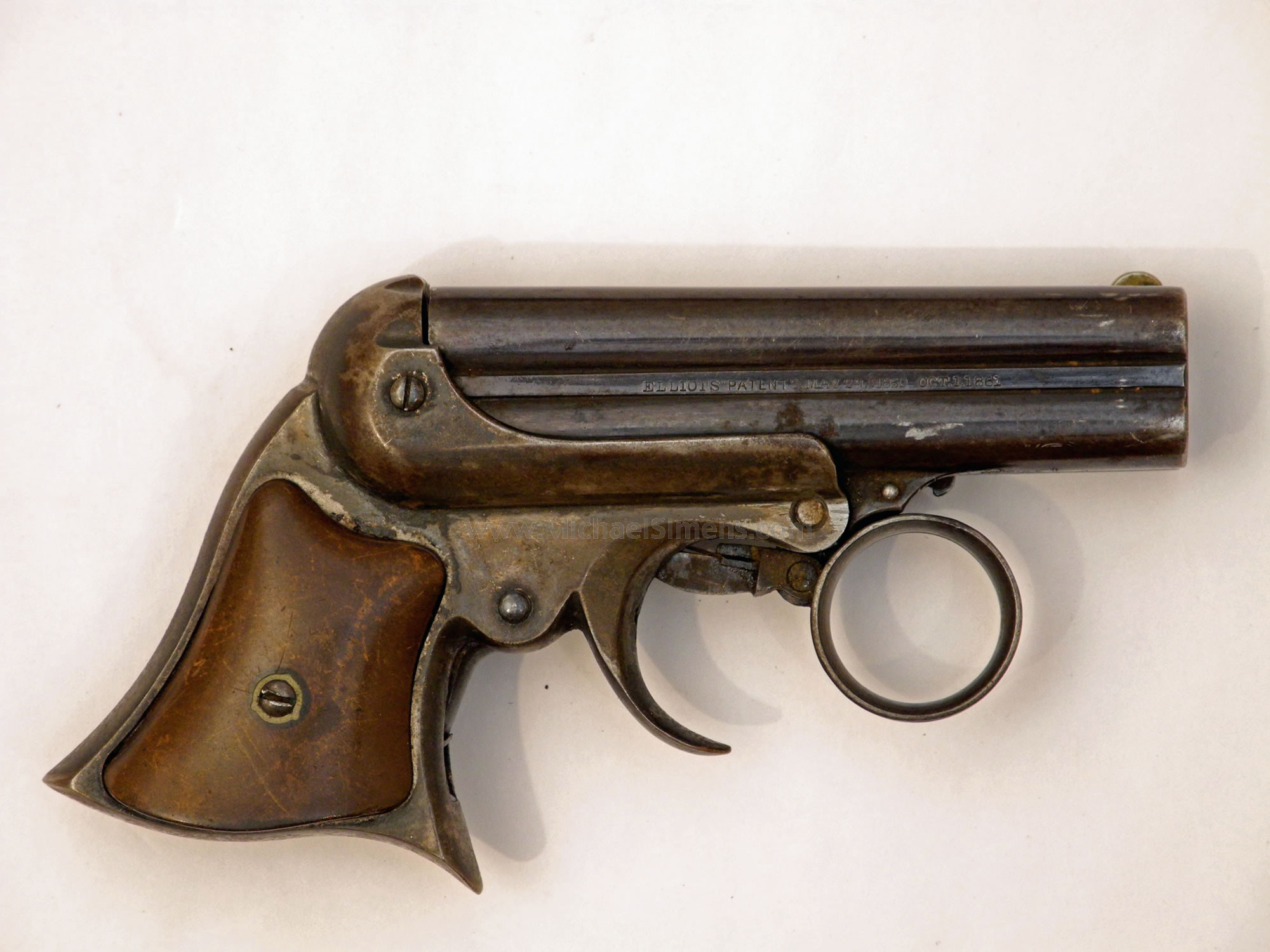 This is a fine condition, 32 caliber Remington Ring-trigger, four barrel Derringer. This is another totally untouched gun that's dirty and crusty but retains a lot of original blue on the barrels and silver plate on the frame. The Remington-Elliot "New Repeating Pistols, No.2", were manufactured between 1863-1888 and about 17,500 were made in .32 Rimfire caliber. It features a cluster of 4 barrels with rotating firing pin and a ring trigger. The left barrel rib is marked "MANUFACTURED BY E. REMINGTON & SONS, ILION, N.Y." while the right side is marked "ELLIOT'S PATENTS MAY 29, 1860 OCT. 1, 1861". This will be a very presentable gun with a little cleaning and oiling.