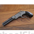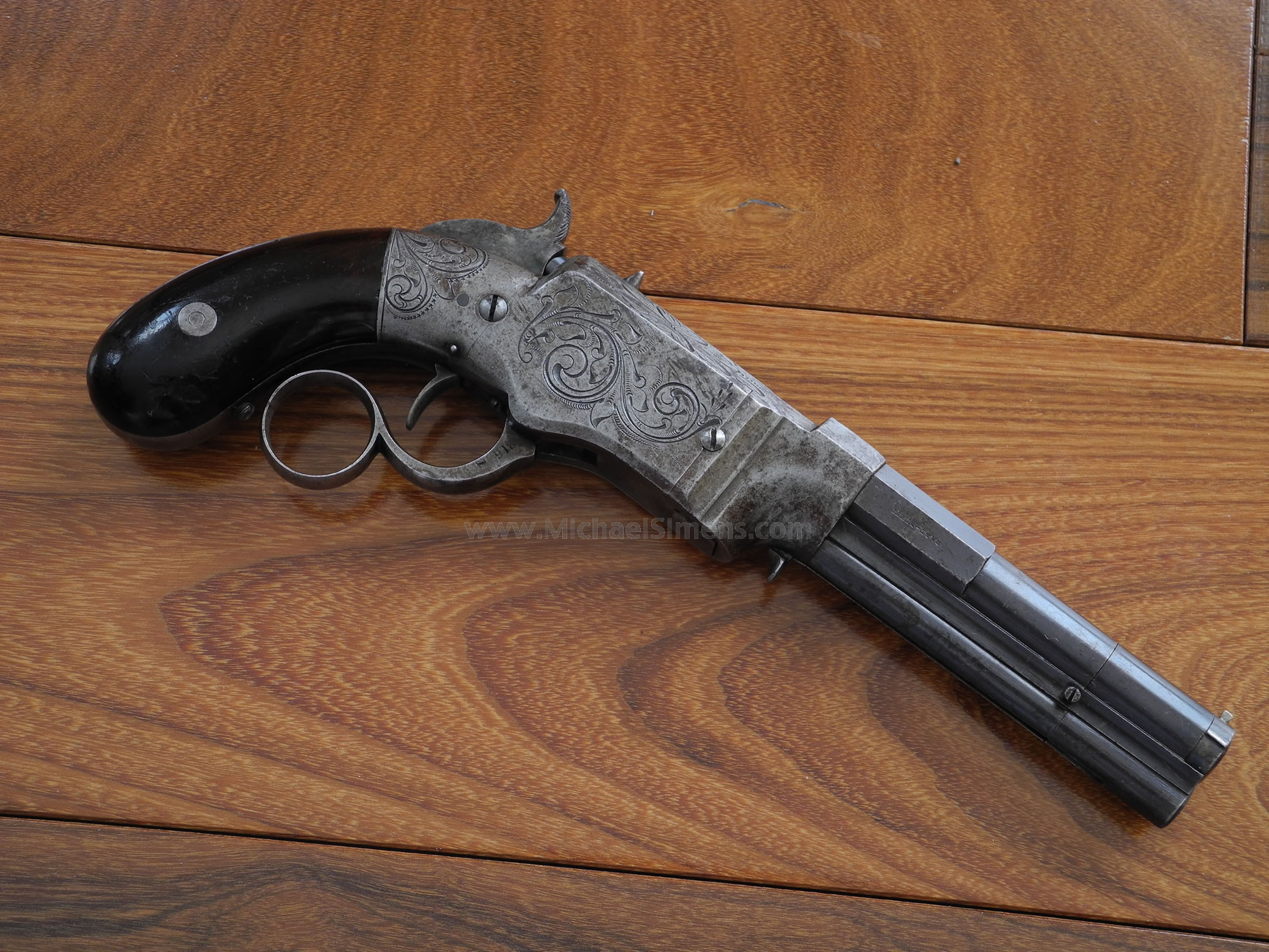 Here is an extremely fine condition small, iron-frame Smith & Wesson Volcanic Pistol Type II Pistol (made without lever spur). One of the better examples offered in many years, this gun shows nearly all of its original blue finish to its barrel and generous traces to its frame, especially on the bottom. There are generous amounts of case colors on the hammer and all of the original varnish on the grips. All markings are crisp and clear as is the engraving. The side plates fit together beautifully. A rare example in this condition, this 4 inch, 31 caliber lever action magazine pistol was manufactured by Smith & Wesson Repeating Arms Company which began manufacturing in 1854. The company would be reorganized a year later in 1855, as the Volcanic Repeating Arms Company and the rest is history. Smith & Wesson focused their efforts to design and produce a pistol that could fire the self contained metallic cartridge using Rollin Whites bored through cylinder. The Volcanic Repeating Arms Company would become the forefather of the Winchester Repeating Rifle Company.