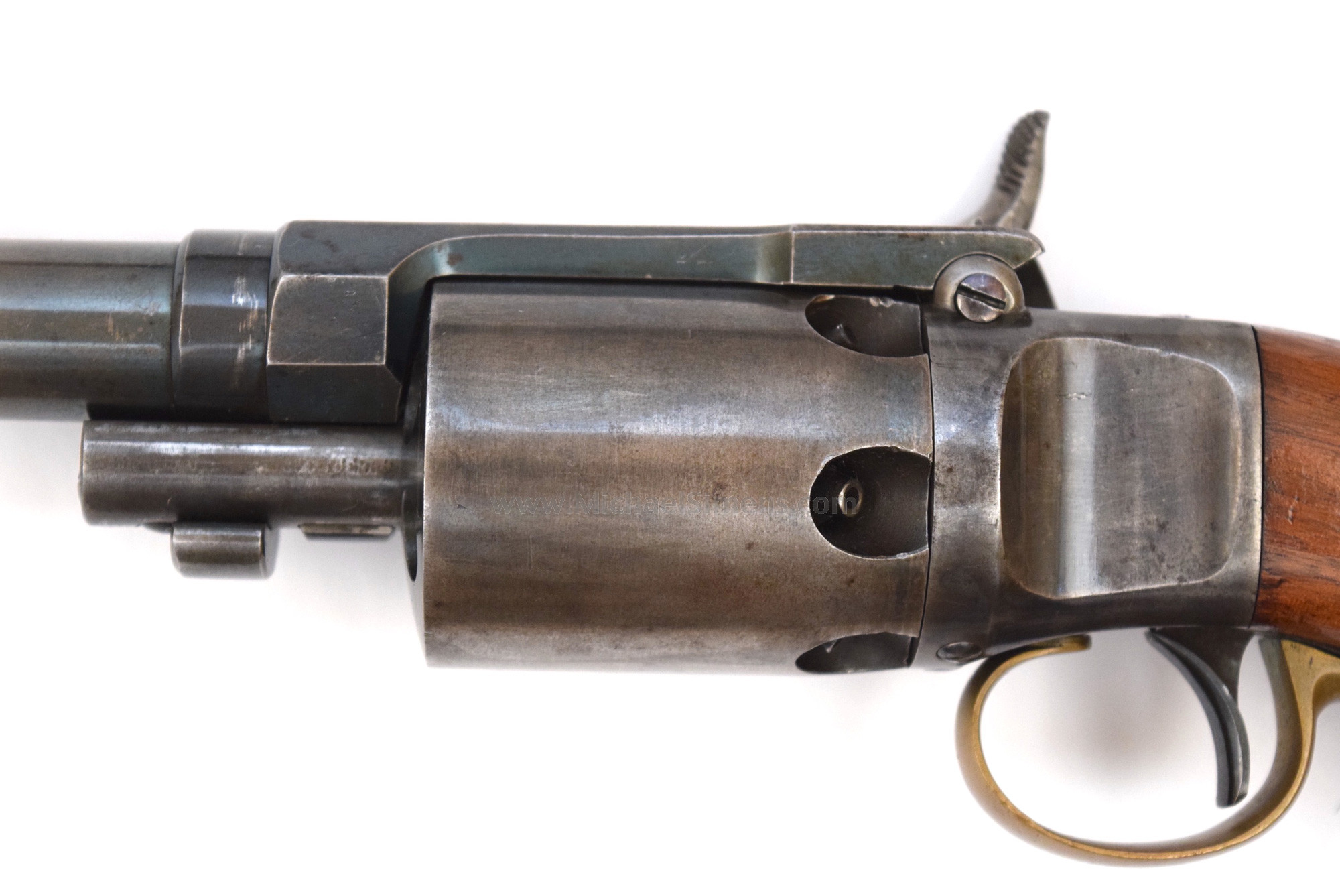 This is an extremely fine to excellent condition Wesson & Leavitt Dragoon Revolver manufactured by the Massachusetts Arms Company, 1850 - 1851. This 40 caliber revolver shows absolutely no evidence of ever being loaded much less fired, showing a flat mint bore and chambers retaining all of their original blue finish, as do the nipples and wells. The only wear on the gun are some flattening of the nipples and a ring-mark on the hammer face, obviously from dry firing. The grips on the gun show numerous minor handling marks, obviously evidence that former owners spent a lot of time admiring this gun and its condition. The metal parts on the gun are excellent, and they show generous amounts of original finish fading to an untouched patina, with more finish on the right hand side of the gun than the left. A truly wonderful candidate for any collector of this model or for those who collect secondary Martial Revolvers..